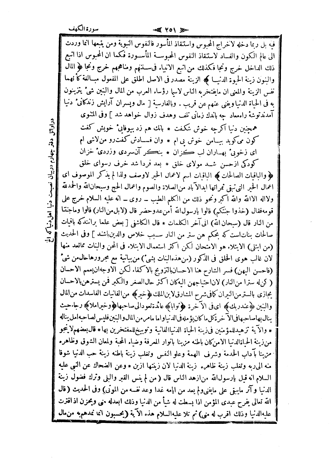 فيه بل ربما دخله لا خراج المحبوس واستنقاذ المأسور فالنفوس النبوية ومن يتبعها انما وردت الى عالم الكون والفساد لاستنقاذ النفوس المحبوسة المأسورة فكما ان المحبوس إذا اتبع ذلك الداخل خرج ونجا فكذلك من اتبع الأنبياء فى سننهم ومناهجهم خرج ونجا الْمالُ وَالْبَنُونَ زِينَةُ الْحَياةِ الدُّنْيا الزينة مصدر فى الأصل اطلق على المفعول مبالغة كأنهما نفس الزينة والمعنى ان ما يفتخر به الناس لا سيما رؤساء العرب من المال والبنين شىء يتزينون به فى الحياة الدنيا ويفنى عنهم عن قريب. وبالفارسية [مال و پسران آرايش زندكانئ دنيا آمدند توشه راه معاد چهـ باندك زمانى تلف وهدف زوال خواهد شد] وفى المثنوى