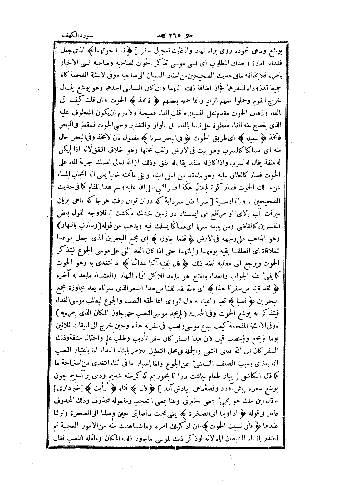 يوشع وماهى ننموده روى براه نهاد واز غايت تعجيل سفر] نَسِيا حُوتَهُما الذي جعل فقدانه امارة وجدان المطلوب اى نسى موسى تذكر الحوت لصاحبه وصاحبه نسى الاخبار بامره فلا يخالفه ما فى حديث الصحيحين من اسناد النسيان الى صاحبه وفى الاسئلة المقحمة كانا جميعا قد زوداه لسفرهما فجاز اضافة ذلك إليهما وان كان الناسي أحدهما وهو يوشع يقال خرج القوم وحملوا معهم الزاد وانما حمله بعضهم فَاتَّخَذَ الحوت ان قلت كيف اتى بالفاء وذهاب الحوت مقدم على النسيان قلت الفاء فصيحة ولا يلزم ان يكون المعطوف عليه الذي يفصح عنه الفاء معطوفا على نسيا بالفاء بل بالواو والتقدير وحيى الحوت فسقط فى البحر فاتخذ سَبِيلَهُ اى طريق الحوت فِي الْبَحْرِ سَرَباً مفعول ثان لاتخذ وفى البحر حال منه اى مسلكا كالسرب وهو بيت فى الأرض وثقب تحتها وهو خلاف النفق لانه إذا لم يكن له منفذ يقال له سرب وإذا كان له منفذ يقال له نفق وذلك ان الله تعالى امسك جرية الماء على الحوت فصار كالطاق عليه وهو ما عقد من أعلى البناء وبقي ما تحته خاليا يعنى انه انجاب الماء عن مسلك الحوت فصار كوة لم تلتئم هكذا فسر النبي صلى الله عليه وسلم هذا المقام كما فى حديث الصحيحين. وبالفارسية [سربا مثل سردابه كه دران توان رفت هر جا كه ماهى بريان ميرفت آب بالاى او مرتفع مى ايستاد در زمين خشك ميكشت] فلا وجه لقول بعض المفسرين كالقاضى ومن يتبعه سربا اى مسلكا يسلك فيه ويذهب من قوله وَسارِبٌ بِالنَّهارِ وهو الذاهب على وجهه فى الأرض فَلَمَّا جاوَزا اى مجمع البحرين الذي جعل موعدا للملاقاة اى انطلقا بقية يومهما وليلتهما حتى إذا كان الغد القى على موسى الجوع ليتذكر الحوت ويرجع الى مطلبه فعند ذلك قالَ لِفَتاهُ آتِنا غَداءَنا ما نتغدى به وهو الحوت كما ينبئ عنه الجواب والغداء بالفتح هو ما يعد للاكل أول النهار والعشاء ما يعد له آخره لَقَدْ لَقِينا مِنْ سَفَرِنا هذا اى بالله لقد لقينا من هذا السفر الذي سرناه بعد مجاوزة مجمع البحرين نَصَباً تعبا واعياء قال النووي انما لحقه النصب والجوع ليطلب موسى الغداء فيتذكر به يوشع الحوت وفى الحديث (لم يجد موسى النصب حتى جاوز المكان الذي امره به) وفى الاسئلة المقحمة كيف جاع موسى ونصب فى سفرته هذه وحين خرج الى الميقات ثلاثين يوما لم يجع ولم ينصب قيل لان هذا السفر كان سفر تأديب وطلب علم واحتمال مشقة وذلك السفر كان الى الله تعالى انتهى والجملة فى محل التعليل للامر بايتاء الغداء اما باعتبار النصب انما يعترى بسبب الضعف الناشئ عن الجوع واما باعتبار ما فى أثناء التغدي من استراحة ما كما قال الكاشفى [بيار طعام چاشت ما را تا بخوريم كه كرسنه شديم ودمى بر آساييم چون يوشع سفره پيش آورد وقصه ماهى بيادش آمد] قالَ فتاه أَرَأَيْتَ [خبر دارى] قال ابن ملك هو يجيئ بمعنى أخبرني وهنا بمعنى التعجب ومفعوله محذوف وذلك المحذوف عامل فى قوله إِذْ أَوَيْنا إِلَى الصَّخْرَةِ يعنى عجبت ما أصابني حين وصلنا الى الصخرة ونزلنا عندها فَإِنِّي نَسِيتُ الْحُوتَ ان اذكر لك امره وما شاهدت منه من الأمور العجيبة ثم اعتذر بانساء الشيطان إياه لانه لو ذكر ذلك لموسى ما جاوز ذلك المكان وما ناله النصب فقال