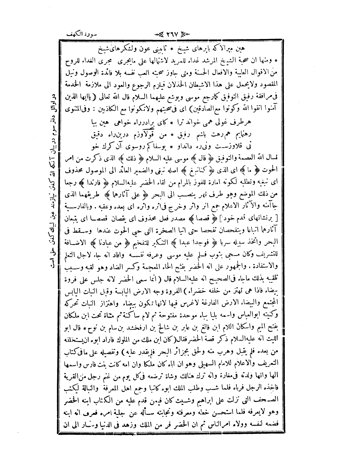 نسال الله العصمة والتوفيق قالَ موسى عليه السلام ذلِكَ الذي ذكرت من امر الحوت ما اى الذي كُنَّا نَبْغِ أصله نبغى والضمير العائد الى الموصول محذوف اى نبغيه ونطلبه لكونه امارة للفوز بالمرام من لقاء الخضر عليه السلام فَارْتَدَّا رجعا من ذلك الموضع وهو طرف نهر ينصب الى البحر عَلى آثارِهِما طريقهما الذي جا آمنه والآثار الاعلام جمع اثر واثر وخرج فى اثره واثره اى بعده وعقبه. وبالفارسية [بر نشانهاى قدم خود] قَصَصاً مصدر فعل محذوف اى يقصان قصصا اى يتبعان آثارهما اتباعا ويتفحصان تفحصا حتى أتيا الصخرة التي حيى الحوت عندها وسقط فى البحر واتخذ سبيله سربا فَوَجَدا عَبْداً التنكير للتفخيم مِنْ عِبادِنا الاضافة للتشريف وكان مسجى بثوب فسلم عليه موسى وعرفه نفسه وأفاد انه جاء لاجل التعلم والاستفادة. والجمهور على انه الخضر بفتح الخاء المعجمة وكسر الضاد وهو لقبه وسبب تلقيبه بذلك ما جاء فى الصحيح انه عليه السلام قال (انما سمى الخضر لانه جلس على فروة بيضاء فاذا هى تهتز من خلفه خضراء) الفروة وجه الأرض اليابسة وقيل النبات اليابس المجتمع والبيضاء الأرض الفارغة لا غرس فيها لانها تكون بيضاء واهتزاز النبات تحركه وكنيته ابو العباس واسمه بليا بباء موحدة مفتوحة ثم لام ساكنة ثم مثناة تحت ابن ملكان بفتح الميم واسكان اللام ابن فالغ بن عابر بن شالخ بن ارفخشد بن سام بن نوح قال ابو الليث انه عليه السلام ذكر قصة الخضر فقال (كان ابن ملك من الملوك فاراد أبوه ان يستخلفه من بعده فلم يقبل وهرب منه ولحق بجزائر البحر فلم يقدر عليه) وتفصيله على ما فى كتاب التعريف والاعلام للامام السهيلي وهو ان أباه كان ملكا وان امه كانت بنت فارس واسمها الها وانها ولدته فى مغارة وانه ترك هنا لك وشاة ترضعه فى كل يوم من غنم رجل من القرية فاخذه الرجل فرباه فلما شب وطلب الملك أبوه كاتبا وجمع اهل المعرفة والنبالة ليكتب الصحف التي نزلت على ابراهيم وشيث كان فيمن قدم عليه من الكتاب ابنه الخضر وهو لا يعرفه فلما استحسن خطه ومعرفته ونجابته سأله عن جلية امره فعرف انه ابنه فضمه لنفسه وولاه امر الناس ثم ان الخضر فر من الملك وزهد فى الدنيا وسار الى ان
