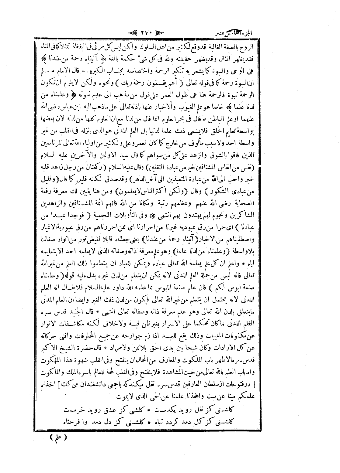 الروح بالصفة الغالبة قد وقع لكثير من اهل السلوك ولكن ليس كل مرئى فى اليقظة تمثلا كما فى المنام فقد يظهر المثال وقد يظهر حقيقته ولله فى كل شىء حكمة بالغة آتَيْناهُ رَحْمَةً مِنْ عِنْدِنا هى الوحى والنبوة كما يشعر به تنكير الرحمة واختصاصه بجناب الكبرياء قال الامام مسلم ان النبوة رحمة كما فى قوله تعالى أَهُمْ يَقْسِمُونَ رَحْمَتَ رَبِّكَ ونحوه ولكن لا يلزم ان تكون الرحمة نبوة فالرحمة هنا هى طول العمر على قول من مذهب الى عدم نبوته وَعَلَّمْناهُ مِنْ لَدُنَّا عِلْماً خاصا هو علم الغيوب والاخبار عنها باذنه تعالى على ما ذهب اليه ابن عباس رضى الله عنهما او علم الباطن قال فى بحر العلوم انما قال من لدنا مع ان العلوم كلها من لدنه لان بعضها بواسطة تعليم الخلق فلا يسمى ذلك علما لدنيا بل العلم اللدني هو الذي ينزله فى القلب من غير واسطة أحد ولا سبب مألوف من خارج كما كان لعمر وعلى ولكثير من اولياء الله تعالى المرتاضين الذين فاقوا بالشوق والزهد على كل من سواهم كما قال سيد الأولين والآخرين عليه السلام (نفس من أنفاس المشتاقين خير من عبادة الثقلين) وقال عليه السلام (ركعتان من رجل زاهد قلبه خير وأحب الى الله من عبادة المتعبدين الى آخر الدهر) وقد صدق لكنه قليل كما قال وَقَلِيلٌ مِنْ عِبادِيَ الشَّكُورُ وقال وَلكِنَّ أَكْثَرَ النَّاسِ لا يَعْلَمُونَ ومن هنا يتبين لك معرفة رفعة الصحابة رضى الله عنهم وعظمهم رتبة ومكانا من الله فانهم