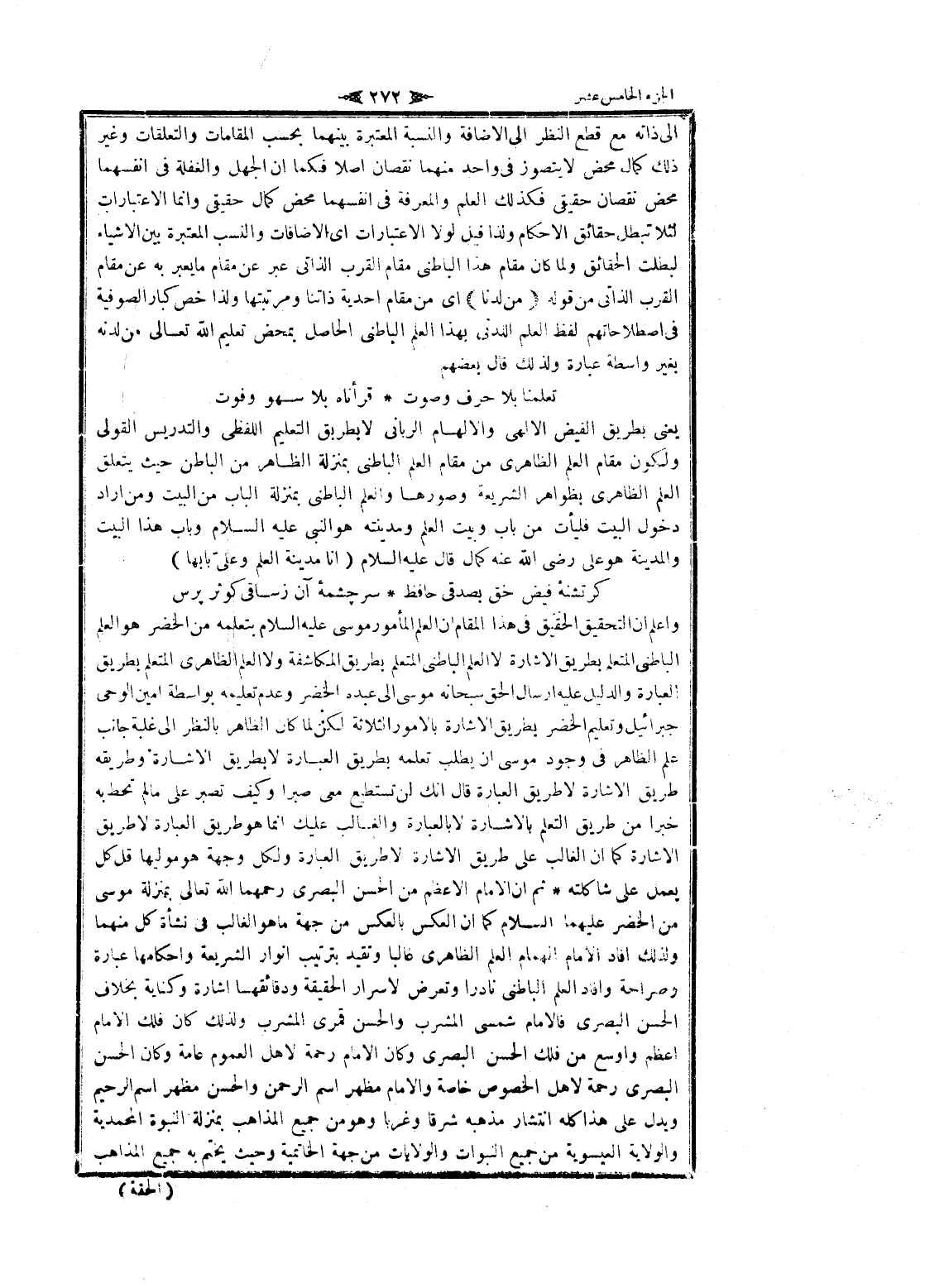 واعلم ان التحقيق الحقيق فى هذا المقام ان العلم المأمور موسى عليه السلام بتعلمه من الخضر هو العلم الباطني المتعلم بطريق الاشارة لا العلم الباطني المتعلم بطريق المكاشفة ولا العلم الظاهري المتعلم بطريق العبارة والدليل عليه إرسال الحق سبحانه موسى الى عبده الخضر وعدم تعليمه بواسطة أمين الوحى جبرائيل وتعليم الخضر بطريق الاشارة بالأمور الثلاثة لكن لما كان الظاهر بالنظر الى غلبة جانب علم الظاهر فى وجود موسى ان يطلب تعلمه بطريق العبارة لا بطريق الاشارة وطريقه طريق الاشارة لا طريق العبارة قال انك لن تستطيع معى صبرا وكيف تصبر على ما لم تحط به خبرا من طريق التعلم بالاشارة لا بالعبارة والغالب عليك انما هو طريق العبارة لا طريق الاشارة كما ان الغالب على طريق الاشارة لا طريق العبارة ولكل وجهة هو موليها قل كل يعمل على شاكلته ثم ان الامام الأعظم من الحسن البصري رحمهما الله تعالى بمنزلة موسى من الخضر عليهما السلام كما ان العكس بالعكس من جهة ما هو الغالب فى نشأة كل منهما ولذلك أفاد الامام الهمام العلم الظاهري غالبا وتقيد بترتيب أنوار الشريعة وأحكامها عبارة وصراحة وأفاد العلم الباطني نادرا وتعرض لاسرار الحقيقة ودقائقها اشارة وكناية بخلاف الحسن البصري فالامام شمسى المشرب والحسن قمرى المشرب ولذلك كان فلك الامام أعظم وأوسع من فلك الحسن البصري وكان الامام رحمة لاهل العموم عامة وكان الحسن البصري رحمة لاهل الخصوص خاصة والامام مظهر اسم الرحمن والحسن مظهر اسم الرحيم ويدل على هذا كله انتشار مذهبه شرقا وغربا وهو من جميع المذاهب بمنزلة النبوة المحمدية والولاية العيسوية من جميع النبوات والولايات من جهة الخاتمية وحيث يختم به جميع المذاهب