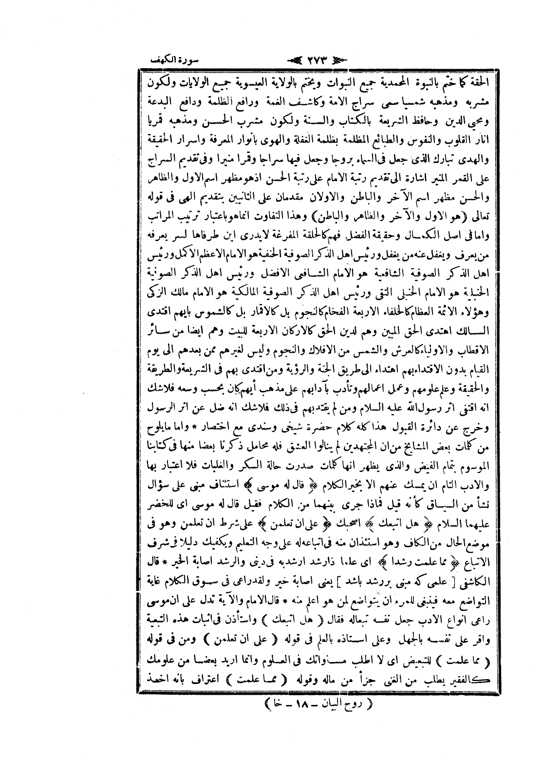 الحقة كما ختم بالنبوة المحمدية جميع النبوات ويختم بالولاية العيسوية جميع الولايات ولكون مشربه ومذهبه شمسيا سمى سراج الامة وكاشف الغمة ورافع الظلمة ودافع البدعة ومحيى الدين وحافظ الشريعة بالكتاب والسنة ولكون مشرب الحسن ومذهبه قمريا أنار القلوب والنفوس والطبائع المظلمة بظلمة الغفلة والهوى بانوار المعرفة واسرار الحقيقة والهدى تبارك الذي جعل فى السماء بروجا وجعل فيها سراجا وقمرا منيرا وفى تقديم السراج على القمر المنير اشارة الى تقديم رتبة الامام على رتبة الحسن إذ هو مظهر اسم الاول والظاهر والحسن مظهر اسم الآخر والباطن والأولان مقدمان على الثانيين بتقديم الهى فى قوله تعالى هُوَ الْأَوَّلُ وَالْآخِرُ وَالظَّاهِرُ وَالْباطِنُ وهذا التفاوت انما هو باعتبار ترتيب المراتب واما فى اصل الكمال وحقيقة الفضل فهم كالحلقة المفرغة لا يدرى اين طرفاها لسر يعرفه من يعرف ويغفل عنه من يغفل ورئيس اهل الذكر الصوفية الحنفية هو الامام الأعظم الأكمل وريئس اهل الذكر الصوفية الشافعية هو الامام الشافعي الأفضل ورئيس اهل الذكر الصوفية الحنبلية هو الامام الحنبلي التقى ورئيس اهل الذكر الصوفية المالكية هو الامام مالك الزكي وهؤلاء الائمة العظام كالخلفاء الاربعة الفخام كالنجوم بل كالاقمار بل كالشموس بايهم اقتدى السالك اهتدى الحق المبين وهم لدين الحق كالاركان الاربعة للبيت وهم ايضا من سائر الاقطاب والأولياء كالعرش والشمس من الافلاك والنجوم وليس لغيرهم ممن بعدهم الى يوم القيام بدون الاقتداء بهم اهتداء الى طريق الجنة والرؤية ومن اقتدى بهم فى الشريعة والطريقة والحقيقة وعلم علومهم وعمل أعمالهم وتأدب بآدابهم على مذهب أيهم كان بحسب وسعه فلا شك انه اقتفى اثر رسول الله عليه السلام ومن لم يقتدبهم فى ذلك فلا شك انه ضل عن اثر الرسول وخرج عن دائرة القبول هذا كله كلام حضرة شيخى وسندى مع اختصار واما ما يلوح من كلمات بعض المشايخ من ان المجتهدين لم ينالوا العشق فله محامل ذكرنا بعضا منها فى كتابنا الموسوم بتمام الفيض والذي يظهر انها كلمات صدرت حالة السكر والغلبات فلا اعتبار بها والأدب التام ان يمسك عنهم الا بخير الكلام قالَ لَهُ مُوسى استئناف مبنى على سؤال نشأ من السياق كأنه قيل فلماذا جرى بينهما من الكلام فقيل قال له موسى اى للخضر عليهما السلام هَلْ أَتَّبِعُكَ أصحبك عَلى أَنْ تُعَلِّمَنِ على شرط ان تعلمن وهو فى موضع الحال من الكاف وهو استئذان منه فى اتباعه له على وجه التعليم ويكفيك دليلا فى شرف الاتباع مِمَّا عُلِّمْتَ رُشْداً اى علما ذا رشد ارشد به فى دينى والرشد إصابة الخير قال الكاشفى [علمى كه مبنى بر رشد باشد] يعنى إصابة خير ولقد راعى فى سوق الكلام غاية التواضع معه فينبغى للمرء ان يتواضع لمن هو اعلم منه قال الامام والآية تدل على ان موسى راعى انواع الأدب جعل نفسه تبعا له فقال هَلْ أَتَّبِعُكَ واستأذن فى اثبات هذه التبعية وأقر على نفسه بالجهل وعلى استاذه بالعلم فى قوله عَلى أَنْ تُعَلِّمَنِ ومن فى قوله مِمَّا عُلِّمْتَ للتبعيض اى لا اطلب مساواتك فى العلوم وانما أريد بعضا من علومك كالفقير يطلب من الغنى جزأ من ماله وقوله مِمَّا عُلِّمْتَ اعتراف بانه أخذ