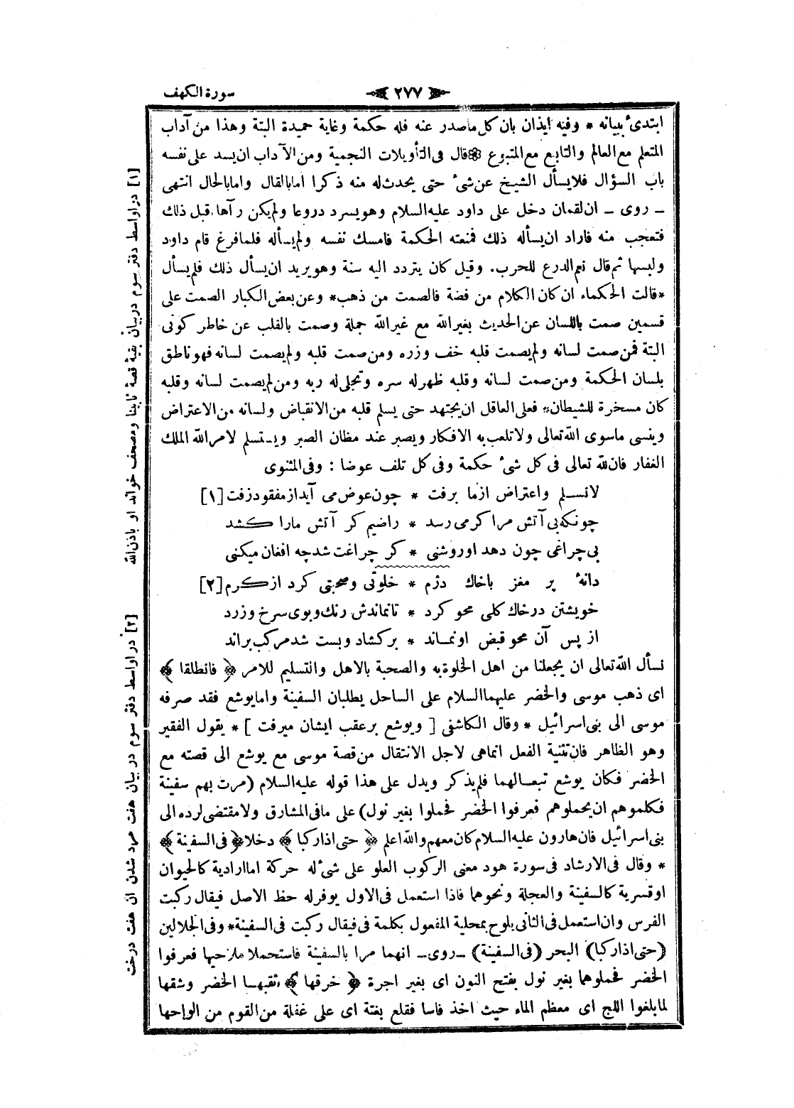 نسأل الله تعالى ان يجعلنا من اهل الخلوة به والصحبة بالأهل والتسليم للامر فَانْطَلَقا اى ذهب موسى والخضر عليهما السلام على الساحل يطلبان السفينة واما يوشع فقد صرفه موسى الى بنى إسرائيل وقال الكاشفى [ويوشع بر عقب ايشان ميرفت] يقول الفقير وهو الظاهر فان تثنية الفعل انما هى لاجل الانتقال من قصة موسى مع يوشع الى قصته مع الخضر فكان يوشع تبعا لهما فلم يذكر ويدل على هذا قوله عليه السلام (مرت بهم سفينة فكلموهم ان يحملوهم فعرفوا الخضر فحملوا بغير نول) على ما فى المشارق ولا مقتضى لرده الى بنى إسرائيل فان هارون عليه السلام كان معهم والله اعلم حَتَّى إِذا رَكِبا دخلا فِي السَّفِينَةِ وقال فى الإرشاد فى سورة هود معنى الركوب العلو على شىء له حركة اما ارادية كالحيوان او قسرية كالسفينة والعجلة ونحوهما فاذا استعمل فى الاول يوفر له حظ الأصل فيقال ركبت الفرس وان استعمل فى الثاني يلوح بمحلية المفعول بكلمة فى فيقال ركبت فى السفينة وفى الجلالين حَتَّى إِذا رَكِبا البحر فِي السَّفِينَةِ- روى- انهما مرا بالسفينة فاستحملا ملاحيها فعرفوا الخضر فحملوهما بغير نول بفتح النون اى بغير اجرة خَرَقَها ثقبها الخضر وشقها لما بلغوا اللج اى معظم الماء حيث أخذ فاسا فقلع بغتة اى على غفلة من القوم من ألواحها