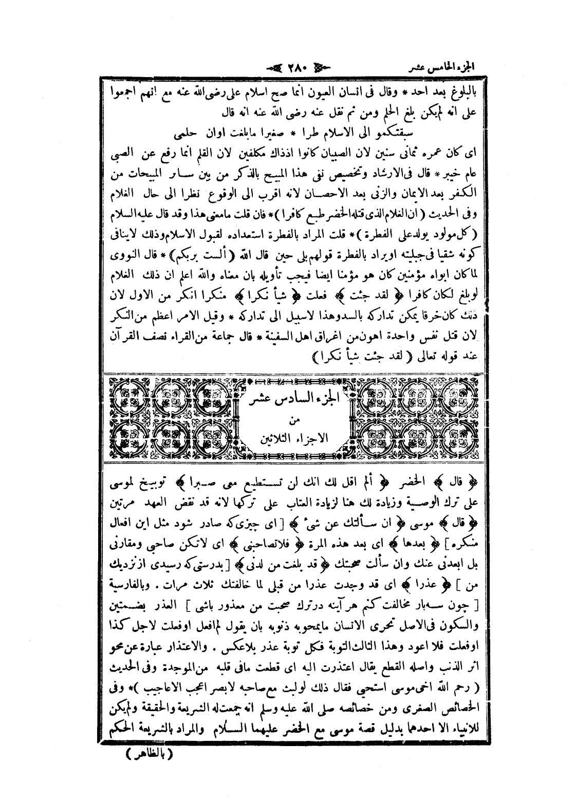اى كان عمره ثمانى سنين لان الصبيان كانوا إذ ذاك مكلفين لان القلم انما رفع عن الصبى عام خيبر قال فى الإرشاد وتخصيص نفى هذا المبيح بالذكر من بين سائر المبيحات من الكفر بعد الايمان والزنى بعد الإحصان لانه اقرب الى الوقوع نظرا الى حال الغلام وفى الحديث (ان الغلام الذي قتله الخضر طبع كافرا) فان قلت ما معنى هذا وقد قال عليه السلام (كل مولود يولد على الفطرة) قلت المراد بالفطرة استعداده لقبول الإسلام وذلك لا ينافى كونه شقيا فى جبليته او يراد بالفطرة قولهم بلى حين قال الله أَلَسْتُ بِرَبِّكُمْ قال النووي لما كان أبواه مؤمنين كان هو مؤمنا ايضا فيجب تأويله بان معناه والله اعلم ان ذلك الغلام لو بلغ لكان كافرا لَقَدْ جِئْتَ فعلت شَيْئاً نُكْراً منكرا أنكر من الاول لان ذلك كان خرقا يمكن تداركه بالسد وهذا لا سبيل الى تداركه وقيل الأمر أعظم من النكر لان قتل نفس واحدة أهون من إغراق اهل السفينة قال جماعة من القراء نصف القرآن عند قوله تعالى لَقَدْ جِئْتَ شَيْئاً نُكْراً الجزء السادس عشر من الاجزاء الثلاثين قالَ الخضر أَلَمْ أَقُلْ لَكَ إِنَّكَ لَنْ تَسْتَطِيعَ مَعِيَ صَبْراً توبيخ لموسى على ترك الوصية وزيادة لك هنا لزيادة العتاب على تركها لانه قد نقض العهد مرتين قالَ موسى إِنْ سَأَلْتُكَ عَنْ شَيْءٍ [اى چيزى كه صادر شود مثل اين افعال منكره] بَعْدَها اى بعد هذه المرة فَلا تُصاحِبْنِي اى لا تكن صاحبى ومقارنى بل ابعدني عنك وان سألت صحبتك قَدْ بَلَغْتَ مِنْ لَدُنِّي [بدرستى كه رسيدى از نزديك من] عُذْراً اى قد وجدت عذرا من قبلى لما خالفتك ثلاث مرات. وبالفارسية [چون سه بار مخالفت كنم هر آينه در ترك صحبت من معذور باشى] العذر بضمتين والسكون فى الأصل تحرى الإنسان ما يمحوبه ذنوبه بان يقول لم افعل او فعلت لاجل كذا او فعلت فلا أعود وهذا الثالث التوبة فكل توبة عذر بلا عكس. والاعتذار عبارة عن محو اثر الذنب وأصله القطع يقال اعتذرت اليه اى قطعت ما فى قلبه من الموجدة وفى الحديث (رحم الله أخي موسى استحيى فقال ذلك لو لبث مع صاحبه لا بصر اعجب الأعاجيب) وفى الخصائص الصغرى ومن خصائصه صلى الله عليه وسلم انه جمعت له الشريعة والحقيقة ولم يكن للانبياء الا أحدهما بدليل قصة موسى مع الخضر عليهما السلام والمراد بالشريعة الحكم