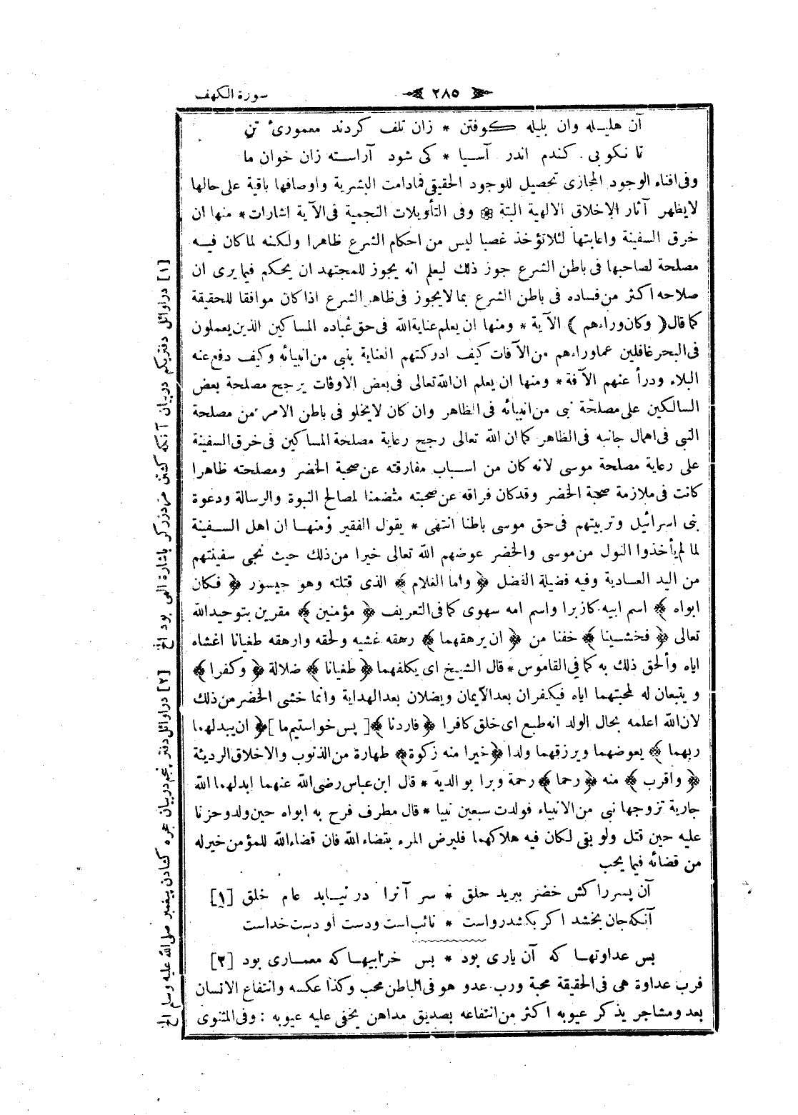وفى إفناء الوجود المجازى تحصيل للوجود الحقيقي فمادامت البشرية وأوصافها باقية على حالها لا يظهر آثار الأخلاق الالهية البتة وفى التأويلات النجمية فى الآية إشارات منها ان خرق السفينة وإعابتها لئلا تؤخذ غصبا ليس من احكام الشرع ظاهرا ولكنه لما كان فيه مصلحة لصاحبها فى باطن الشرع جوز ذلك ليعلم انه يجوز للمجتهد ان يحكم فيما يرى ان صلاحه اكثر من فساده فى باطن الشرع بما لا يجوز فى ظاهر الشرع إذا كان موافقا للحقيقة كما قال وَكانَ وَراءَهُمْ الآية ومنها ان يعلم عناية الله فى حق عباده المساكين الذين يعملون فى البحر غافلين عما وراءهم من الآفات كيف أدركتهم العناية بنبي من أنبيائه وكيف دفع عنه البلاء ودرأ عنهم الآفة ومنها ان يعلم ان الله تعالى فى بعض الأوقات يرجح مصلحة بعض السالكين على مصلحة نبى من أنبيائه فى الظاهر وان كان لا يخلو فى باطن الأمر من مصلحة النبي فى إهمال جانبه فى الظاهر كما ان الله تعالى رجح رعاية مصلحة المساكين فى خرق السفينة على رعاية مصلحة موسى لانه كان من اسباب مفارقته عن صحبة الخضر ومصلحة ظاهرا كانت فى ملازمة صحبة الخضر وقد كان فراقه عن صحبته متضمنا لمصالح النبوة والرسالة ودعوة بنى إسرائيل وتربيتهم فى حق موسى باطنا انتهى يقول الفقير ومنها ان اهل السفينة لما لم يأخذوا النول من موسى والخضر عوضهم الله تعالى خيرا من ذلك حيث نجى سفينتهم من اليد العادية وفيه فضيلة الفضل وَأَمَّا الْغُلامُ الذي قتلته وهو جيسور فَكانَ أَبَواهُ اسم أبيه كازبرا واسم امه سهوى كما فى التعريف مُؤْمِنَيْنِ مقرين بتوحيد الله تعالى فَخَشِينا خفنا من أَنْ يُرْهِقَهُما رهقه غشيه ولحقه وارهقه طغيانا اغشاه إياه وألحق ذلك به كما فى القاموس قال الشيخ اى يكلفهما طُغْياناً ضلالة وَكُفْراً ويتبعان له لمحبتهما إياه فيكفران بعد الايمان ويضلان بعد الهداية وانما خشى الخضر من ذلك لان الله اعلمه بحال الولد انه طبع اى خلق كافرا فَأَرَدْنا [پس خواستيم ما] أَنْ يُبْدِلَهُما رَبُّهُما يعوضهما ويرزقهما ولدا خَيْراً مِنْهُ زَكاةً طهارة من الذنوب والأخلاق الرديئة وَأَقْرَبَ منه رُحْماً رحمة وبرا بوالديه قال ابن عباس رضى الله عنهما أبدلهما الله جارية تزوجها نبى من الأنبياء فولدت سبعين نبيا قال مطرف فرح به أبواه حين ولد وحزنا عليه حين قتل ولو بقي لكان فيه هلاكهما فليرض المرء بقضاء الله فان قضاء الله للمؤمن خير له من قضائه فيما يحب