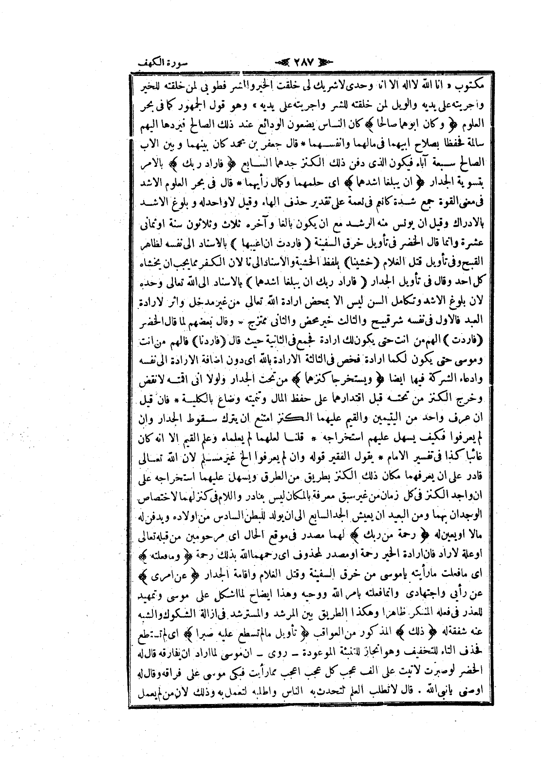 مكتوب «انا الله لا اله الا انا وحدي لا شريك لى خلقت الخير والشر فطوبى لمن خلقته للخير وأجريته على يديه والويل لمن خلقته للشر وأجريته على يديه» وهو قول الجمهور كما فى بحر العلوم وَكانَ أَبُوهُما صالِحاً كان الناس يضعون الودائع عند ذلك الصالح فيردها إليهم سالمة فحفظا بصلاح أبيهما فى مالهما وأنفسهما قال جعفر بن محمد كان بينهما وبين الأب الصالح سبعة آباء فيكون الذي دفن ذلك الكنز جدهما السابع فَأَرادَ رَبُّكَ بالأمر بتسوية الجدار أَنْ يَبْلُغا أَشُدَّهُما اى حلمهما وكمال رأيهما قال فى بحر العلوم الأشد فى معنى القوة جمع شدة كانعم فى نعمة على تقدير حذف الهاء وقيل لا واحد له وبلوغ الأشد بالإدراك وقيل ان يونس منه الرشد مع ان يكون بالغا وآخره ثلاث وثلاثون سنة او ثمانى عشرة وانما قال الخضر فى تأويل خرق السفينة فَأَرَدْتُ أَنْ أَعِيبَها بالإسناد الى نفسه لظاهر القبح وفى تأويل قتل الغلام فَخَشِينا بلفظ الخشية والاسناد الى نالان الكفر مما يجب ان يخشاه كل أحد وقال فى تأويل الجدار فَأَرادَ رَبُّكَ أَنْ يَبْلُغا أَشُدَّهُما بالإسناد الى الله تعالى وحده لان بلوغ الأشد وتكامل السن ليس الا بمحض ارادة الله تعالى من غير مدخل واثر لارادة العبد فالاول فى نفسه شر قبيح والثالث خير محض والثاني ممتزج وقال بعضهم لما قال الخضر فَأَرَدْتُ الهم من أنت حتى يكون لك ارادة فجمع فى الثانية حيث قال فَأَرَدْنا فالهم من أنت وموسى حتى يكون لكما ارادة فخص فى الثالثة الارادة بالله اى دون اضافة الارادة الى نفسه وادعاء الشركة فيهما ايضا وَيَسْتَخْرِجا كَنزَهُما من تحت الجدار ولولا انى أقمته لانقض وخرج الكنز من تحته قبل اقتدارهما على حفظ المال وتنميته وضاع بالكلية فان قيل ان عرف واحد من اليتيمين والقيم عليهما الكنز امتنع ان يترك سقوط الجدار وان لم يعرفوا فكيف يسهل عليهم استخراجه قلنا لعلهما لم يعلماه وعلم القيم الا انه كان غائبا كذا فى تفسير الامام يقول الفقير قوله وان لم يعرفوا إلخ غير مسلم لان الله تعالى قادر على ان يعرفهما مكان ذلك الكنز بطريق من الطرق ويسهل عليهما استخراجه على ان واجد الكنز فى كل زمان من غير سبق معرفة بالمكان ليس بنادر واللام فى كنز لهما لاختصاص الوجدان بهما ومن البعيد ان يعيش الجد السابع الى ان يولد للبطن السادس من أولاده ويدفن له مالا او يعين له رَحْمَةً مِنْ رَبِّكَ لهما مصدر فى موقع الحال اى مرحومين من قبله تعالى او علة لاراد فان ارادة الخير رحمة او مصدر لمحذوف اى رحمهما الله بذلك رحمة وَما فَعَلْتُهُ اى ما فعلت ما رأيته يا موسى من خرق السفينة وقتل الغلام واقامة الجدار عَنْ أَمْرِي عن رأيى واجتهادي وانما فعلته بامر الله ووحيه وهذا إيضاح لما أشكل على موسى وتمهيد للعذر فى فعله المنكر ظاهرا وهكذا الطريق بين المرشد والمسترشد فى ازالة الشكوك والشبه عنه شفقة له ذلِكَ المذكور من العواقب تَأْوِيلُ ما لَمْ تَسْطِعْ عَلَيْهِ صَبْراً اى لم تستطع فحذف التاء للتخفيف وهو انجاز للتنبئة الموعودة- روى- ان موسى لما أراد ان يفارقه قال امر الخضر لو صبرت لاتيت على الف عجب كل عجب اعجب مما رأيت فبكى موسى على فراقه وقال له أوصني يا نبى الله. قال لا تطلب العلم لتحدث به الناس واطلبه لتعمل به وذلك لان من لم يعمل