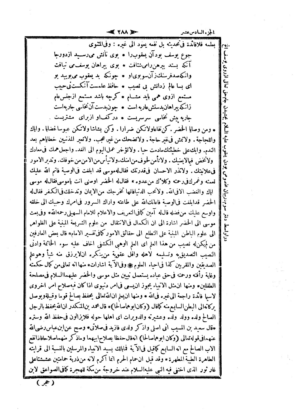 ومن وصايا الخضر. كن نفاعا ولا تكن ضرارا. وكن بشاشا ولا تكن عبوسا غضابا. وإياك واللجاجة. ولا تمش فى غير حاجة. ولا تضحك من غير. عجب. ولا تعير المذنبين خطاياهم بعد الندم. وابك على خطيئتك ما دمت حيا. ولا تؤخر عمل اليوم الى الغد. واجعل همك فى معادك ولا تخض فيما لا يعنيك. ولا تأمن لخوف من أمنك. ولا تيأس من الا من من خوفك. وتدبر الأمور فى علانيتك. ولا تذر الإحسان فى قدرتك فقال له موسى قد أبلغت فى الوصية فاتم الله عليك نعمته وغمرك فى رحمته وكلأك من عدوه فقال له الخضر أوصني أنت يا موسى فقال له موسى إياك والغضب الا فى الله. ولا تحب الدنيا فانها تخرجك من الايمان وتدخلك فى الكفر فقال له الخضر قد أبلغت فى الوصية فاعانك الله على طاعته وأراك السرور فى أمرك وحببك الى خلقه وأوسع عليك من فضله قال له آمين كما فى التعريف والاعلام للامام السهيلي رحمه الله وفى بعث موسى الى الخضر اشارة الى ان الكمال فى الانتقال من علوم الشريعة المبنية على الظواهر الى علوم الباطن المبنية على التطلع الى حقائق الأمور كما فى تفسير الامام قال بعض العارفين من لم يكن له نصيب من هذا العلم اى العلم الوهبي الكشفى أخاف عليه سوء الخاتمة وادنى النصيب التصديق به وتسليمه لاهله واقل عقوبة من ينكره ان لا يرزق منه شيأ وهو علم الصديقين والمقربين كذا فى احياء العلوم وفى الآية إشارات منها انه تعالى من كمال حكمته وغاية رأفته ورحمته فى حق عباده يستعمل نبيين مثل موسى والخضر عليهما السلام فى مصلحة الطفلين ومنها ان مثل الأنبياء يجوز ان يسعى فى امر دنيوى إذا كان فيه صلاح امر اخروى لا سيما فائدة راجعة الى غيره فى الله ومنها ان يعلم ان الله تعالى يحفظ بصالح قوما وقبيلة ويوصل بركاته الى البطن السابع منه كما قال وَكانَ أَبُوهُما صالِحاً قال محمد بن المنكدر ان الله يحفظ بالرجل الصالح ولده وولد ولده وعشيرته والد ويرات اى أهلها حوله فلا يزالون فى حفظ الله وستره قال سعيد بن المسيب انى أصلي واذكر ولدي فازيد فى صلاتى وصح عن ابن عباس رضى الله عنهما فى قوله تعالى وَكانَ أَبُوهُما صالِحاً انه قال حفظا بصلاح أبيهما وما ذكر منهما صلاحا فاذا نفع الأب الصالح مع انه السابع كما قيل فى الآية فما بالك بسيد الأنبياء والمرسلين بالنسبة الى قرابته الطاهرة الطيبة المطهرة وقد قيل ان حمام الحرم انما أكرم لانه من ذرية حمامتين عششتا على غار ثور الذي اختفى فيه النبي عليه السلام عند خروجه من مكة للهجرة كما فى الصواعق لابن