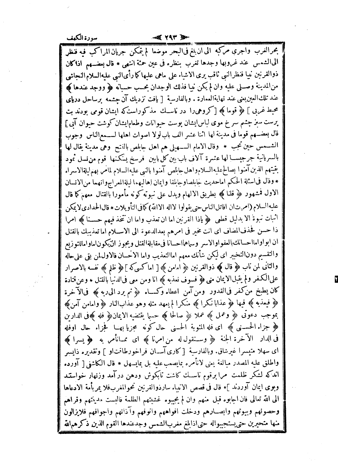 بحر الغرب واجرى مركبه الى ان بلغ فى البحر موضعا لم يتمكن جريان المراكب فيه فنظر الى الشمس عند غروبها وجدها تغرب بنظره فى عين حمئة انتهى قال بعضهم إذا كان ذو القرنين نبيا فنظر النبي ثاقب يرى الأشياء على ما هى عليها كما رأى النبي عليه السلام النجاشي من المدينة وصلى عليه وان لم يكن نبيا فذلك الوجدان بحسب حسبانه وَوَجَدَ عِنْدَها عند تلك العين يعنى عند نهاية العمارة. وبالفارسية [يافت نزديك آن چشمه بر ساحل درياى محيط غربى] قَوْماً [كروهى را در ناسك مذكور است كه ايشان قومى بودند بت پرست سبز چشم سرخ موى لباس ايشان پوست حيوانات وطعام ايشان كوشت حيوان آبى] قال بعضهم قوما فى مدينة لها اثنا عشر الف باب لولا أصوات أهلها لسمع الناس وجوب الشمس حين تجب وقال الامام السهيلي هم اهل جابلص بالفتح وهى مدينة يقال لها بالسريانية جرجيسا لها عشرة آلاف باب بين كل بابين فرسخ يسكنها قوم من نسل ثمود بقيتهم الذين آمنوا بصالح عليه السلام واهل جابلص آمنوا بالنبي عليه السلام لما مر بهم ليلة الاسراء وقال فى اسئلة الحكم اما حديث جابلصا وجابلقا وايمان اهاليهما ليلة المعراج وانهما من الإنسان الاول فمشهور قُلْنا بطريق الإلهام ويدل على نبوته كونه مأمورا بالقتال معهم كما قال عليه السلام (أمرت ان أقاتل الناس حتى يقولوا لا اله الا الله) كما فى التأويلات قال الحدادي لا يمكن اثبات نبوة الا بدليل قطعى يا ذَا الْقَرْنَيْنِ إِمَّا أَنْ تُعَذِّبَ وَإِمَّا أَنْ تَتَّخِذَ فِيهِمْ حُسْناً امرا ذا حسن فحذف المضاف اى أنت مخير فى أمرهم بعد الدعوة الى الإسلام اما تعذيبك بالقتل ان أبوا واما إحسانك بالعفو او الاسر وسماهما إحسانا فى مقابلة القتل ويجوز ان يكون اما واما للتوزيع والتقسيم دون التخبير اى ليكن شأنك معهم اما التعذيب واما الإحسان فالاول لمن بقي على حاله والثاني لمن تاب قالَ ذو القرنين أَمَّا مَنْ [اما كسى كه] ظَلَمَ نفسه بالإصرار على الكفر ولم يقبل الايمان منى فَسَوْفَ نُعَذِّبُهُ انا ومن معى فى الدنيا بالقتل وعن قتادة كان يطبخ من كفر فى القدور ومن آمن أعطاه وكساه ثُمَّ يُرَدُّ إِلى رَبِّهِ فى الآخرة فَيُعَذِّبُهُ فيها عَذاباً نُكْراً منكرا لم يعهد مثله وهو عذاب النار وَأَمَّا مَنْ آمَنَ بموجب دعوتى وَعَمِلَ عملا صالِحاً حسبما يقتضيه الايمان فَلَهُ فى الدارين جَزاءً الْحُسْنى اى فله المثوبة الحسنى حال كونه مجزيا بها فجزاء حال او فله فى الدار الآخرة الجنة وَسَنَقُولُ لَهُ مِنْ أَمْرِنا اى مما نأمر به يُسْراً اى سهلا متيسرا غير شاق. وبالفارسية [كارى آسان فرا خور طاقت او] وتقديره ذايسر واطلق عليه المصدر مبالغة يعنى لا نأمره بما يصعب عليه بل بما يسهل قال الكاشفى [آورده اند كه لشكر ظلمت مرا بر قوم ناسك كاشت تا بكوش ودهن در آمد وزنهار خواستند وبوى ايمان آوردند] قال فى قصص الأنبياء سار ذو القرنين نحو المغرب فلا يمر بأمة الا دعاها الى الله تعالى فان أجابوه قبل منهم وان لم يجيبوه غشيتهم الظلمة فالبست مدينتهم وقراهم وحصونهم وبيوتهم وأبصارهم ودخلت أفواههم وأنوفهم وآذانهم وأجوافهم فلا يزالون منها متحيرين حتى يستجيبو اله حتى إذا بلغ مغرب الشمس وجد عندها القوم الذين ذكرهم الله