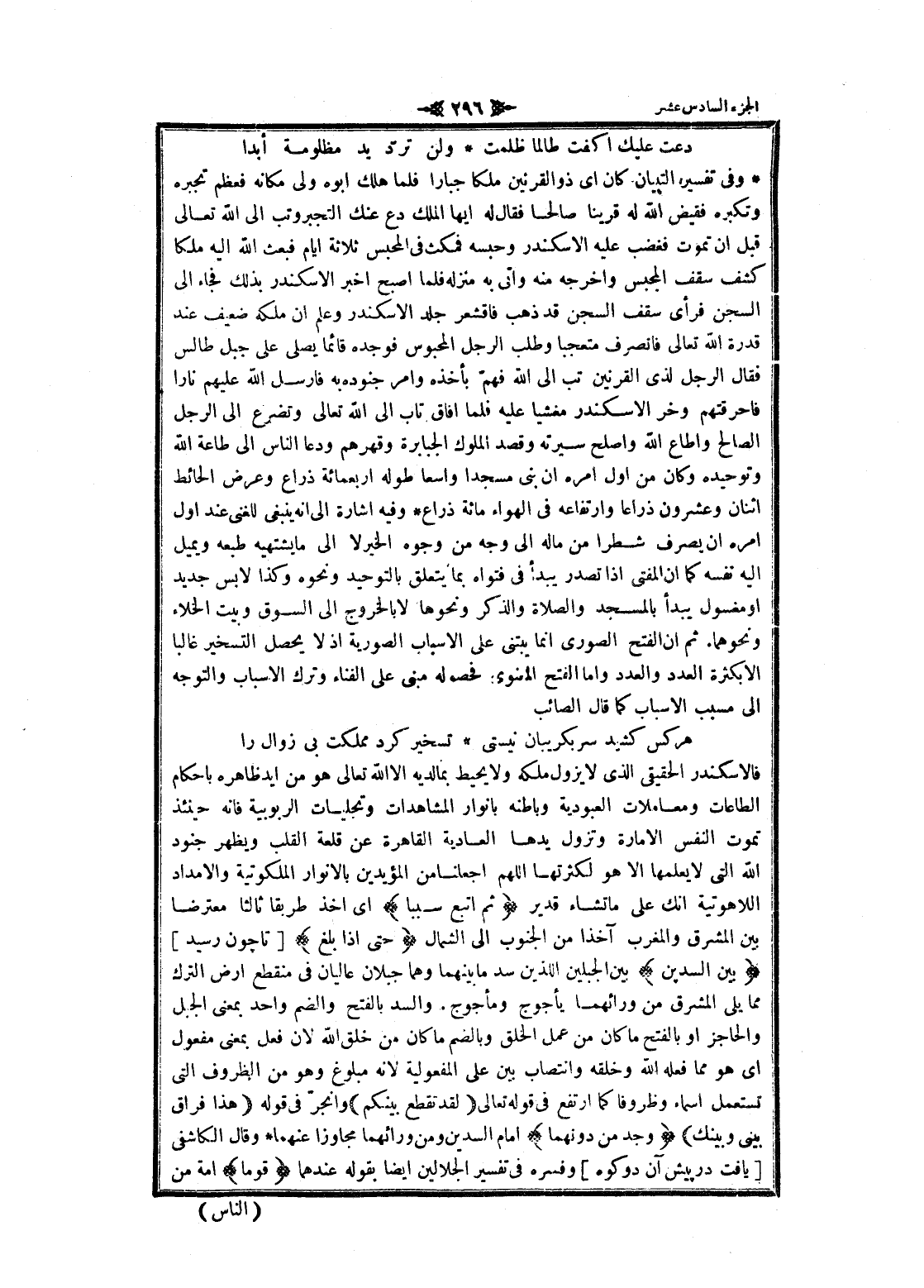 وفى تفسير التبيان كان اى ذو القرنين ملكا جبارا فلما هلك أبوه ولى مكانه فعظم تجبره وتكبره فقيض الله له قرينا صالحا فقال له ايها الملك دع عنك التجبر وتب الى الله تعالى قبل ان تموت فغضب عليه الإسكندر وحبسه فمكث فى المحبس ثلاثة ايام فبعث الله اليه ملكا كشف سقف المجبس وأخرجه منه واتى به منزله فلما أصبح اخبر الإسكندر بذلك فجاء الى السجن فرأى سقف السجن قد ذهب فاقشعر جلد الإسكندر وعلم ان ملكه ضعيف عند قدرة الله تعالى فانصرف متعجبا وطلب الرجل المحبوس فوجده قائما يصلى على جبل طالس فقال الرجل لذى القرنين تب الى الله فهمّ بأخذه وامر جنوده به فارسل الله عليهم نارا فاحرقتهم وخر الإسكندر مغشيا عليه فلما أفاق تاب الى الله تعالى وتضرع الى الرجل الصالح وأطاع الله وأصلح سيرته وقصد الملوك الجبابرة وقهرهم ودعا الناس الى طاعة الله وتوحيده وكان من أول امره ان بنى مسجدا واسعا طوله اربعمائة ذراع وعرض الحائط اثنان وعشرون ذراعا وارتفاعه فى الهواء مائة ذراع وفيه اشارة الى انه ينبغى للغنى عند أول امره ان يصرف شطرا من ماله الى وجه من وجوه الخير لا الى ما يشتهيه طبعه ويميل اليه نفسه كما ان المفتى إذا تصدر يبدأ فى فتواه بما يتعلق بالتوحيد ونحوه وكذا لابس جديد او مغسول يبدأ بالمسجد والصلاة والذكر ونحوها لا بالخروج الى السوق وبيت الخلاء ونحوهما. ثم ان الفتح الصوري انما يبتنى على الأسباب الصورية إذ لا يحصل التسخير غالبا الا بكثرة العدد والعدد واما الفتح المعنوي فحصوله مبنى على الفناء وترك الأسباب والتوجه الى مسبب الأسباب كما قال الصائب