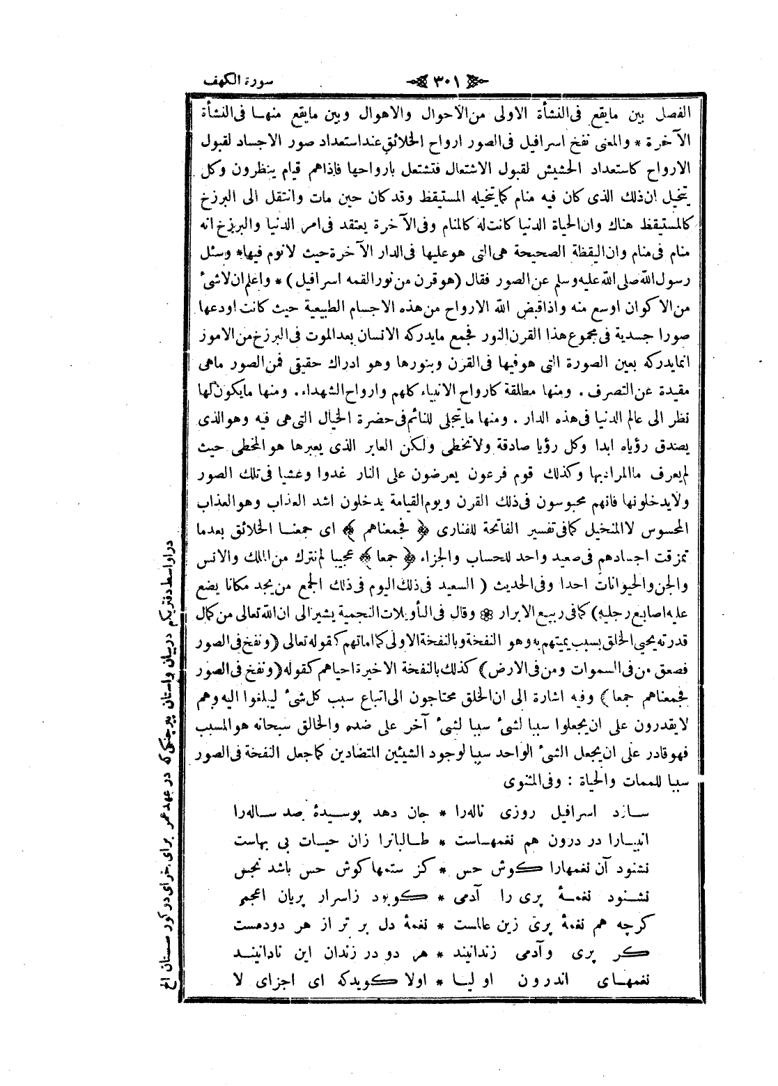 الفصل بين ما يقع فى النشأة الاولى من الأحوال والأهوال وبين ما يقع منها فى النشأة الآخرة والمعنى نفخ اسرافيل فى الصور أرواح الخلائق عند استعداد صور الأجساد لقبول الأرواح كاستعداد الحشيش لقبول الاشتعال فتشتعل بأرواحها فاذاهم قيام ينظرون وكل يتخيل ان ذلك الذي كان فيه منام كما يتخيله المستيقظ وقد كان حين مات وانتقل الى البرزخ كالمستيقظ هناك وان الحياة الدنيا كانت له كالمنام وفى الآخرة يعتقد فى امر الدنيا والبرزخ انه منام فى منام وان اليقظة الصحيحة هى التي هو عليها فى الدار الآخرة حيث لا نوم فيها وسئل رسول الله صلى الله عليه وسلم عن الصور فقال (هو قرن من نور ألقمه اسرافيل) واعلم ان لا شىء من الأكوان أوسع منه وإذا قبض الله الأرواح من هذه الأجسام الطبيعية حيث كانت أودعها صورا جسدية فى مجموع هذا القرن النور فجمع ما يدركه الإنسان بعد الموت فى البرزخ من