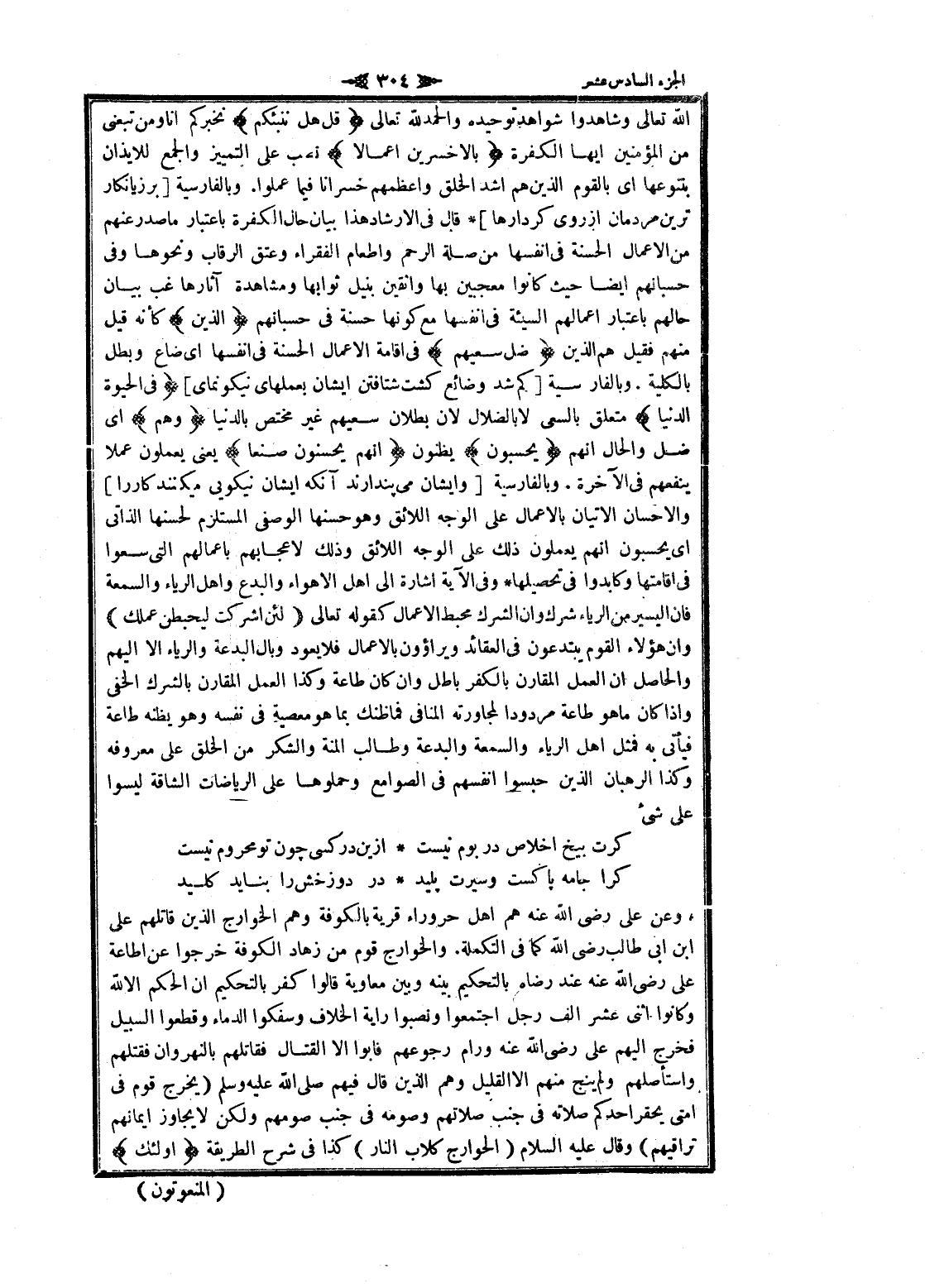 وعن على رضى الله عنه هم اهل حروراء قرية بالكوفة وهم الخوارج الذين قاتلهم على ابن ابى طالب رضى الله كما فى التكملة. والخوارج قوم من زهاد الكوفة خرجوا عن إطاعة على رضى الله عنه عند رضاه بالتحكيم بينه وبين معاوية قالوا كفر بالتحكيم ان الحكم الا لله وكانوا اثنى عشر الف رجل اجتمعوا ونصبوا راية الخلاف وسفكوا الدماء وقطعوا السبيل فخرج إليهم على رضى الله عنه ورام رجوعهم فابوا الا القتال فقاتلهم بالنهروان فقتلهم واستأصلهم ولم ينج منهم الا القليل وهم الذين قال فيهم صلى الله عليه وسلم (يخرج قوم فى أمتي يحقر أحدكم صلاته فى جنب صلاتهم وصومه فى جنب صومهم ولكن لا يجاوز ايمانهم تراقيهم) وقال عليه السلام (الخوارج كلاب النار) كذا فى شرح الطريقة أُولئِكَ