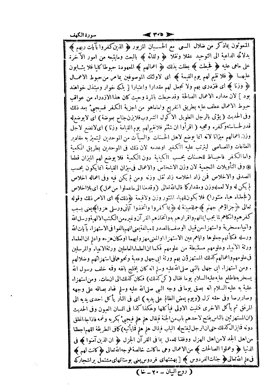 المنعوتون بما ذكر من ضلال السعى مع الحسبان المزبور الَّذِينَ كَفَرُوا بِآياتِ رَبِّهِمْ بدلائله الداعية الى التوحيد عقلا ونقلا وَلِقائِهِ بالبعث وما يتبعه من امور الآخرة على ما هى عليه فَحَبِطَتْ بطلت بذلك أَعْمالُهُمْ المعهودة حبوطا كليا فلا يثابون عليها فَلا نُقِيمُ لَهُمْ يَوْمَ الْقِيامَةِ اى لاولئك الموصوفين بما مر من حبوط الأعمال وَزْناً اى فنزدرى بهم ولا نجعل لهم مقدارا واعتبارا [بلكه خوار ومبتذل خواهند بود] لان مداره الأعمال الصالحة وقد حبطت بالمرة وحيث كان هذا الازدراء من عواقب حبوط الأعمال عطف عليه بطريق التفريع واما ما هو من اجزية الكفر فسيجيئ بعد ذلك وفى الحديث (يؤتى بالرجل الطويل الأكول الشروب فلا يزن جناح بعوضة) اى لا يوضع له قدر لخساسته وكفره وعجبه (اقرأوا ان شئتم فلا نقيم لهم يوم القيامة وزنا) اى لا نضع لاجل وزن أعمالهم ميزانا لانه انما يوضع لاهل الحسنات والسيئات من الموحدين ليتميز به مقادير الطاعات والمعاصي ليترتب عليه التكفير او عدمه لان ذلك فى الموحدين بطريق الكمية واما الكفر فاحباط للحسنات بحسب الكيفية دون الكمية فلا يوضع لهم الميزان قطعا وفى التأويلات النجمية لان وزن الاشخاص والأعمال فى ميزان القيامة انما يكون بحسب الصدق والإخلاص فمن زاد إخلاصه زاد ثقل وزنه ومن لم يكن فيه وفى اعماله اخلاص لم يكن له ولا لعمله وزن ومقدار كما قال الله تعالى وَقَدِمْنا إِلى ما عَمِلُوا مِنْ عَمَلٍ اى بلا اخلاص فَجَعَلْناهُ هَباءً مَنْثُوراً فلا يكون للهباء المنثور وزن ولا قيمة ذلِكَ اى الأمر ذلك وقوله تعالى جَزاؤُهُمْ جَهَنَّمُ جملة مبينة له بِما كَفَرُوا وَاتَّخَذُوا آياتِي وَرُسُلِي هُزُواً يعنى بسبب كفرهم وإنكارهم لما يجب ايمانهم وإقرارهم به واتخاذهم القرآن وغيره من الكتب الالهية ورسل الله وأنبياءه سخرية واستهزاء من قبيل الوصف بالمصدر للمبالغة يعنى انهم بالغوا فى الاستهزاء بآيات الله ورسله فكأنهم جعلوها وإياهم عين الاستهزاء او المعنى مهزوا بهما او مكان هزء واعلم ان العلماء ورثة الأنبياء وعلومهم مستنبطة من علومهم فكما ان العلماء العاملين ورثة الأنبياء والمرسلين فى علومهم وأعمالهم كذلك المستهزءون بهم ورثة ابى جهل وعقبة ونحوهما فى استهزائهم وضلالهم ومن استهزاء ابى جهل بالنبي صلى الله عليه وسلم انه كان يخلج بانفه وفمه خلف رسول الله يسخر به فاطلع عليه عليه السلام يوما فقال (كن كذلك) فكان كذلك الى ان مات. ومن استهزاء عقبة به عليه السلام انه بصق يوما فى وجه النبي صلى الله عليه وسلم فعاد بصاقه على وجهه وصار برصا وفى حقه نزل وَيَوْمَ يَعَضُّ الظَّالِمُ عَلى يَدَيْهِ اى فى النار يأكل احدى يديه الى المرفق ثم يأكل الاخرى فتنبت الاولى فيأكلها وهكذا كذا فى انسان العيون وفى الحديث (ان المستهزئين بالناس يفتح لاحدهم باب من الجنة فيقال هلم هلم فيجيئ بكربه وغمه فاذا جاء اغلق دونه فما يزال كذلك حتى ان الرجل ليفتح له الباب فيقال هلم هلم فما يأتيه) كما فى الطريقة اللهم اجعلنا من اهل الجد لا من اهل الهزل ووفقنا للعمل بما فى القرآن الجزل إِنَّ الَّذِينَ آمَنُوا فى الدنيا وَعَمِلُوا الصَّالِحاتِ من الأعمال وهى ما كانت خالصة لوجه الله تعالى كانَتْ لَهُمْ فى علم الله تعالى جَنَّاتُ الْفِرْدَوْسِ [بهشتهاى فردوس يعنى بوستانهاى مشتمل بر أشجار كه