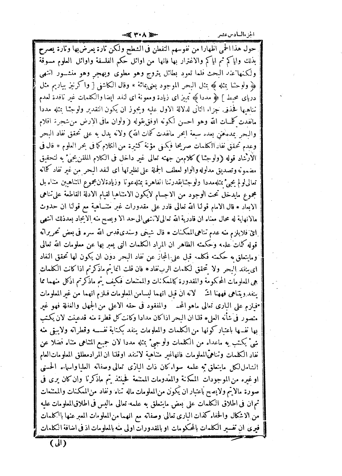 حول هذا الحمى إظهارا من نفوسهم التفطن فى الشطح ولكن تارة يعرض بها وتارة يصرح بذلك وإياكم ثم إياكم والاغترار بها فانها من أوائل حكم الفلسفة وأوائل- العلوم مسوقة ولكنها عند البحث فلما تعود بطائل يتروج وهو مطوى ويهجر وهو منشور انتهى وَلَوْ جِئْنا بِمِثْلِهِ بمثل البحر الموجود يعنى بمائة وقال الكاشفى [واگر نيز بياريم مثل درياى محيط] مَدَداً تمييز اى زيادة ومعونة اى لنفد ايضا والكلمات غير نافدة لعدم نناهيها فحذف جزاء الثاني لدلالة الاول عليه ويجوز ان يكون التقدير ولو جئنا بمثله مددا ما نفدت كلمات الله وهو احسن لكونه أوفق بقوله وَلَوْ أَنَّما فِي الْأَرْضِ مِنْ شَجَرَةٍ أَقْلامٌ وَالْبَحْرُ يَمُدُّهُ مِنْ بَعْدِهِ سَبْعَةُ أَبْحُرٍ ما نَفِدَتْ كَلِماتُ اللَّهِ ولانه يدل به على تحقق نفاد البحر وعدم تحقق نفاد الكلمات صريحا فيكفى مؤنة كثيرة من الكلام كما فى بحر العلوم قال فى الإرشاد قوله وَلَوْ جِئْنا كلام من جهته تعالى غير داخل فى الكلام الملقن يجئ به لتحقيق مضمونه وتصديق مدلوله والواو لعطف الجملة على نظيرتها اى لنفد البحر من غير نفاد كلماته تعالى لو لم يجئ بمثله مددا ولو جئنا بقدرتنا القاهرة بمثله عونا وزيادة لان مجموع المتناهيين متناه بل مجموع ما يدخل تحت الوجود من الأجسام لا يكون الا متناهيا لقيام الادلة القاطعة على تناهى الابعاد قال الامام قولنا الله تعالى قادر على مقدورات غير متناهية مع قولنا ان حدوث ما لا نهاية له محال معناه ان قادرية الله تعالى لا تتهى الى حد الا ويصح منه الإيجاد بعد ذلك انتهى اى فلا يلزم منه عدم تناهى الممكنات قال شيخى وسندى قدس الله سره فى بعض تحريراته قوله كلمات علمه وحكمته الظاهر ان المراد الكلمات التي يعبر بها عن معلومات الله تعالى وما يتعلق به حكمته فكلمة قبل على المجاز عن نفاد البحر دون ان يكون لها تحقق النفاد اى ينفد البحر ولا يتحقق لكلمات الرب نفاد فان قلت انما يتم ما ذكرتم إذا كانت الكلمات هى المعلومات المحكومة والمقدورة كالممكنات والممتنعات فكيف يتم ما ذكرتم إذ كل منهما مما ينفد ويتناهى فههنا إشكال لانه ان قيل انهما ليسا من المعلومات فيلزم انهما من غير المعلومات فيلزم على الباري تعالى ما هو المحال والمفقود فى حقه الا على من الجهل والغفلة فهو غير متصور فى شأنه العلى قلنا ان البحر إذا كان مدادا وكانت كل قطره منه قد عينت لان يكتب بها نفسها باعتبار كونها من الكلمات والمعلومات ينفد بكتابة نفسه وقطراته ولا يبقى منه شىء يكتب به ما عداه من الكلمات ولو جيئ بمثله مددا لان جميع المتناهي متناه فضلا عن نفاد الكلمات وتناهى المعلومات فانها غير متناهية لا تنفد او قلنا ان المراد مطلق المعلومات العام الشامل لكل ما يتعلق به علمه سواء كان ذات الباري تعالى وصفاته العليا وأسماءه الحسنى او غيره من الموجودات الممكنة والمعدومات الممتنعة فحينئذ يتم ما ذكرنا وان كان يرى فى صورة ما لا يتم ولا يصح باعتبار ان يكون من المعلومات ماله تناه ونفاد