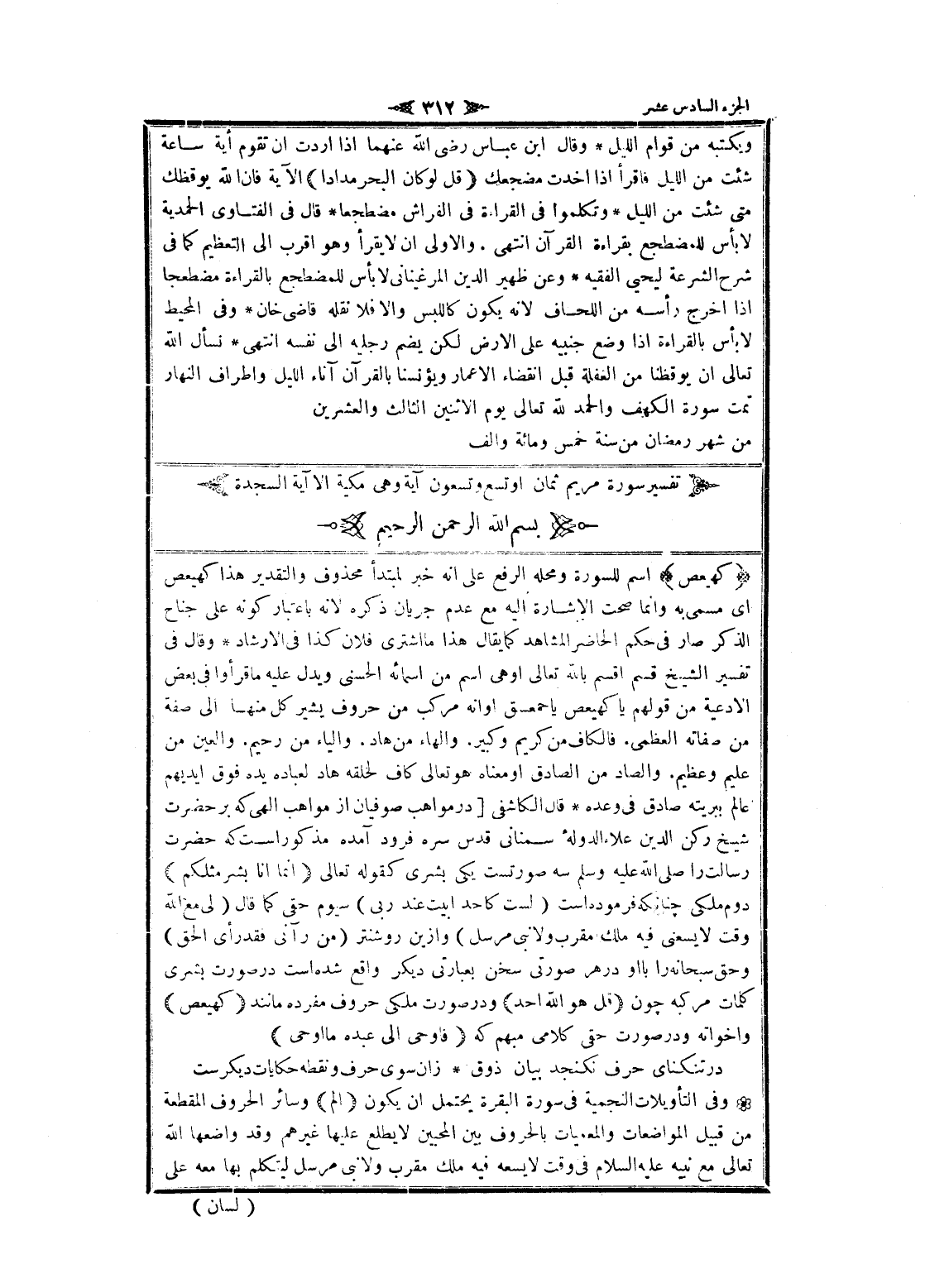 عنهما إذا أردت ان تقوم أية ساعة شئت من الليل فاقرأ إذا اخذت مضجعك قُلْ لَوْ كانَ الْبَحْرُ مِداداً الآية فان الله يوقظك متى شئت من الليل وتكلموا فى القراءة فى الفراش مضطجعا قال فى الفتاوى الحمدية لا بأس للمصطجع بقراءة القرآن انتهى. والاولى ان لا يقرأ وهو اقرب الى التعظيم كما فى شرح الشرعة ليحيى الفقيه وعن ظهير الدين المرغينانى لا بأس للمضطجع بالقراءة مضطعجا إذا اخرج رأسه من اللحاف لانه يكون كاللبس والا فلا نقله قاضى خان وفى المحيط لا بأس بالقراءة إذا وضع جنبيه على الأرض لكن يضم رجليه الى نفسه انتهى نسأل الله تعالى ان يوقظنا من الغفلة قبل انقضاء الأعمار ويؤنسنا بالقرآن آناء الليل وأطراف النهار تمت سورة الكهف والحمد لله تعالى يوم الاثنين الثالث والعشرين من شهر رمضان من سنة خمس ومائة والف