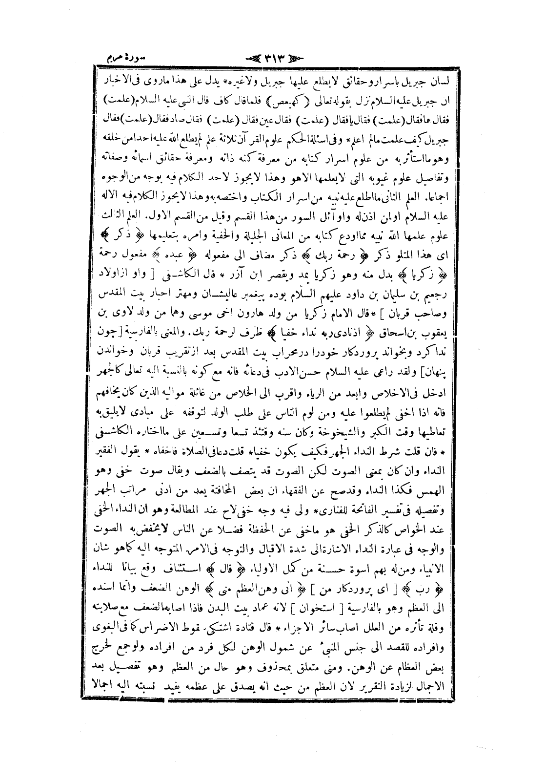 لسان جبريل باسرار وحقائق لا يطلع عليها جبريل ولا غيره يدل على هذا ما روى فى الاخبار ان جبريل عليه السلام نزل بقوله تعالى كهيعص فلما قال كاف قال النبي عليه السلام (علمت) فقال ها فقال (علمت) فقال يا فقال (علمت) فقال عين فقال (علمت) فقال صاد فقال (علمت) فقال جبريل كيف علمت ما لم اعلم وفى اسئلة الحكم علوم القرآن ثلاثة علم لم يطلع الله عليه أحدا من خلقه وهو ما استأثر به من علوم اسرار كتابه من معرفة كنه ذاته ومعرفة حقائق أسمائه وصفاته وتفاصيل علوم غيوبه التي لا يعلمها الا هو وهذا لا يجوز لاحد الكلام فيه بوجه من الوجوه اجماعا. العلم الثاني ما اطلع عليه نبيه من اسرار الكتاب واختصه به وهذا لا يجوز الكلام فيه الا له عليه السلام او لمن اذن له وأوائل السور من هذا القسم وقيل من القسم الاول. العلم الثالث علوم علمها الله نبيه مما أودع كتابه من المعاني الجليلة والخفية وامره بتعليمها ذِكْرُ اى هذا المتلو ذكر رَحْمَتِ رَبِّكَ ذكر مضاف الى مفعوله عَبْدَهُ مفعول رحمة زَكَرِيَّا بدل منه وهو زكريا يمد ويقصر ابن آزر قال الكاشفى [واو از أولاد رجعيم بن سليمان بن داود عليهم السلام بوده پيغمبر عاليشان ومهتر أحبار بيت المقدس وصاحب قربان] قال الامام زكريا من ولد هارون أخي موسى وهما من ولد لاوى بن يعقوب بن إسحاق إِذْ نادى رَبَّهُ نِداءً خَفِيًّا ظرف لرحمة ربك. والمعنى بالفارسية [چون ندا كرد وبخواند پروردگار خود را در محراب بيت المقدس بعد از تقريب قربان وخواندن پنهان] ولقد راعى عليه السلام حسن الأدب فى دعائه فانه مع كونه بالنسبة اليه تعالى كالجهر ادخل فى الإخلاص وابعد من الرياء واقرب الى الخلاص من غائلة مواليه الذين كان يخافهم فانه إذا أخفى لم يطلعوا عليه ومن لوم الناس على طلب الولد لتوقفه على مبادى لا يليق به تعاطيها وقت الكبر والشيخوخة وكان سنه وقتئذ تسعا وتسعين على ما اختاره الكاشفى فان قلت شرط النداء الجهر فكيف يكون خفيا قلت دعا فى الصلاة فاخفاه يقول الفقير النداء وان كان بمعنى الصوت لكن الصوت قد يتصف بالضعف ويقال صوت خفى وهو الهمس فكذا النداء وقد صح عن الفقهاء ان بعض المخافتة يعد من ادنى مراتب الجهر وتفصيله فى تفسير الفاتحة للفنارى ولى فيه وجه خفى لاح عند المطالعة وهو ان النداء الخفي عند الخواص كالذكر الخفي هو ما خفى عن الحفظة فضلا عن الناس لا يخفض به الصوت والوجه فى عبارة النداء الاشارة الى شدة الإقبال والتوجه فى الأمر المتوجه اليه كما هو شان الأنبياء ومن له بهم أسوة حسنة من كمل الأولياء قالَ استئناف وقع بيانا للنداء رَبِّ [اى پروردگار من] إِنِّي وَهَنَ الْعَظْمُ مِنِّي الوهن الضعف وانما أسنده الى العظم وهو بالفارسية [استخوان] لانه عماد بيت البدن فاذا أصابه الضعف مع صلابته وقلة تأثره من العلل أصاب سائر الاجزاء قال قتادة اشتكى سقوط الأضراس كما فى البغوي وافراده للقصد الى جنس المنبئ عن شمول الوهن لكل فرد من افراده ولو جمع لخرج بعض العظام عن الوهن. ومنى متعلق بمحذوف وهو حال من العظم وهو تفصيل بعد الإجمال لزيادة التقرير لان العظم من حيث انه يصدق على عظمه يفيد نسبته اليه اجمالا