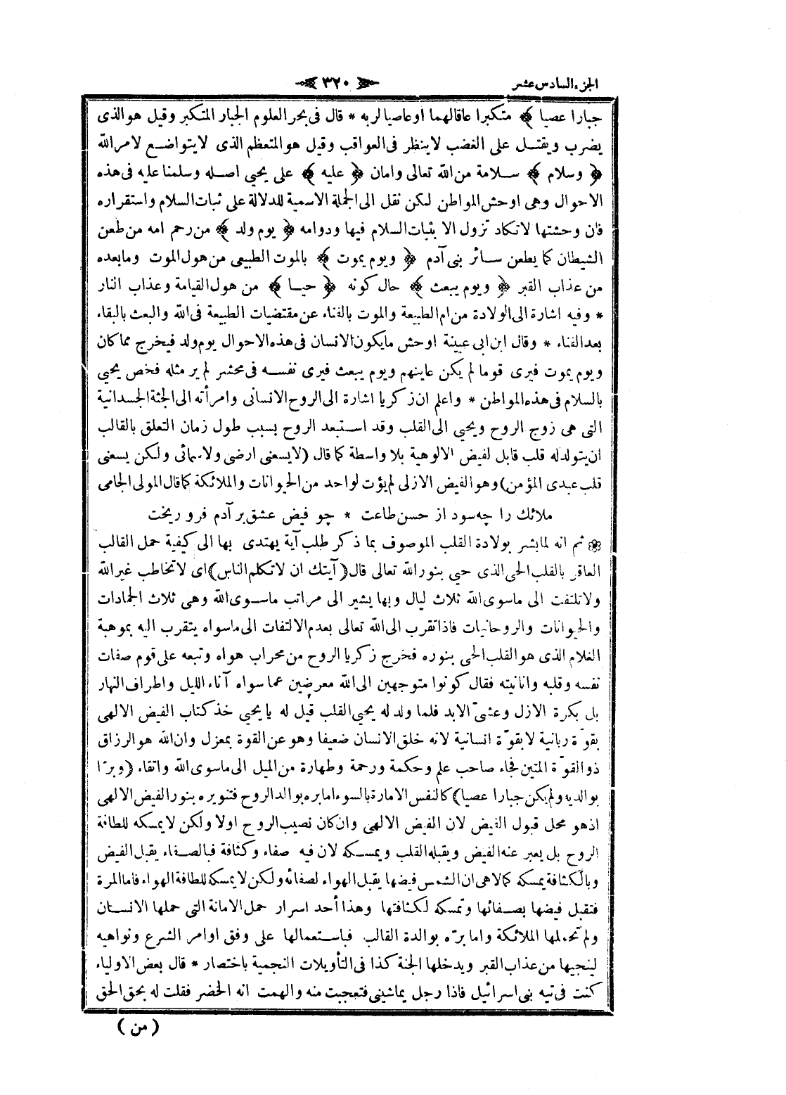 من هول القيامة وعذاب النار وفيه اشارة الى الولادة من أم الطبيعة والموت بالفناء عن مقتضيات الطبيعة فى الله والبعث بالبقاء بعد الفناء وقال ابن ابى عيينة أوحش ما يكون الإنسان فى هذه الأحوال يوم ولد فيخرج مما كان ويوم يموت فيرى قوما لم يكن عاينهم ويوم يبعث فيرى نفسه فى محشر لم ير مثله فخص يحيى بالسلام فى هذه المواطن واعلم ان زكريا اشارة الى الروح الإنساني وامرأته الى الجثة الجسدانية التي هى زوج الروح ويحيى الى القلب وقد استبعد الروح بسبب طول زمان التعلق بالقالب ان يتولد له قلب قابل لفيض الا لوهية بلا واسطة كما قال (لا يسعنى ارضى ولا سمائى ولكن يسعنى قلب عبدى المؤمن) وهو الفيض الأزلي لم يؤت لواحد من الحيوانات والملائكة كما قال المولى الجامى
