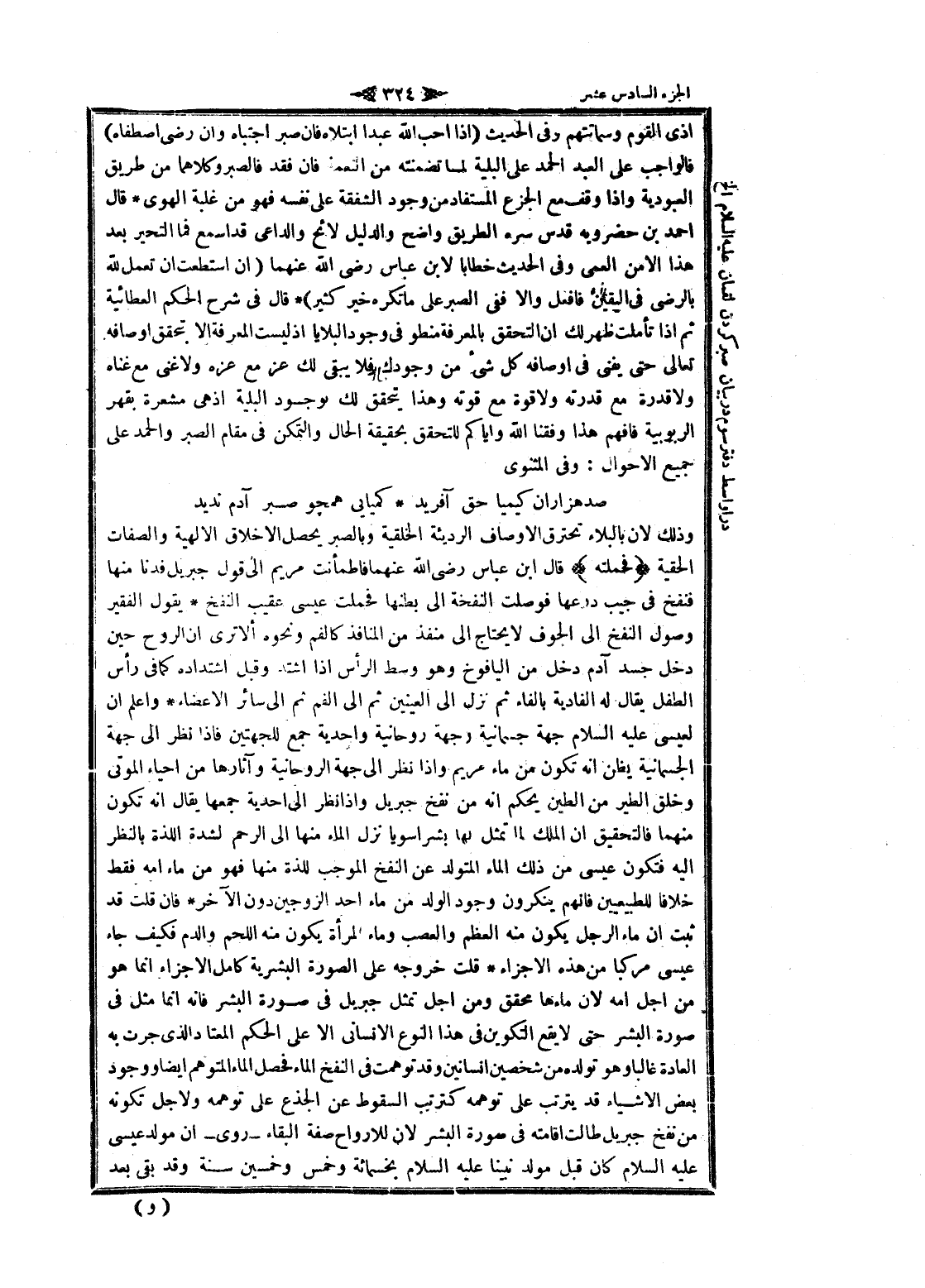 أذى القوم وشماتتهم وفى الحديث (إذا أحب الله عبدا ابتلاه فان صبر اجتباه وان رضى اصطفاه) فالواجب على العبد الحمد على البلية لما تضمنته من النعمة فان فقد فالصبر وكلاهما من طريق العبودية وإذا وقف مع الجزع المستفاد من وجود الشفقة على نفسه فهو من غلبة الهوى قال احمد بن حضرويه قدس سره الطريق واضح والدليل لائح والداعي قد اسمع فما التحير بعد هذا الا من العمى وفى الحديث خطابا لابن عباس رضى الله عنهما (ان استطعت ان تعمل لله بالرضى فى اليقين فافعل والا ففى الصبر على ما تكره خير كثير) قال فى شرح الحكم العطائية ثم إذا تأملت ظهر لك ان التحقق بالمعرفة منطو فى وجود البلايا إذ ليست المعرفة الا بتحقق أوصافه تعالى حتى يفنى فى أوصافه كل شىء من وجودك فلا يبقى لك عز مع عزه ولا غنى مع غناه ولا قدرة مع قدرته ولا قوة مع قوته وهذا يتحقق لك بوجود البلية إذ هى مشعرة بقهر الربوبية فافهم هذا وفقنا الله وإياكم للتحقق بحقيقة الحال والتمكن فى مقام الصبر والحمد على جميع الأحوال: وفى المثنوى