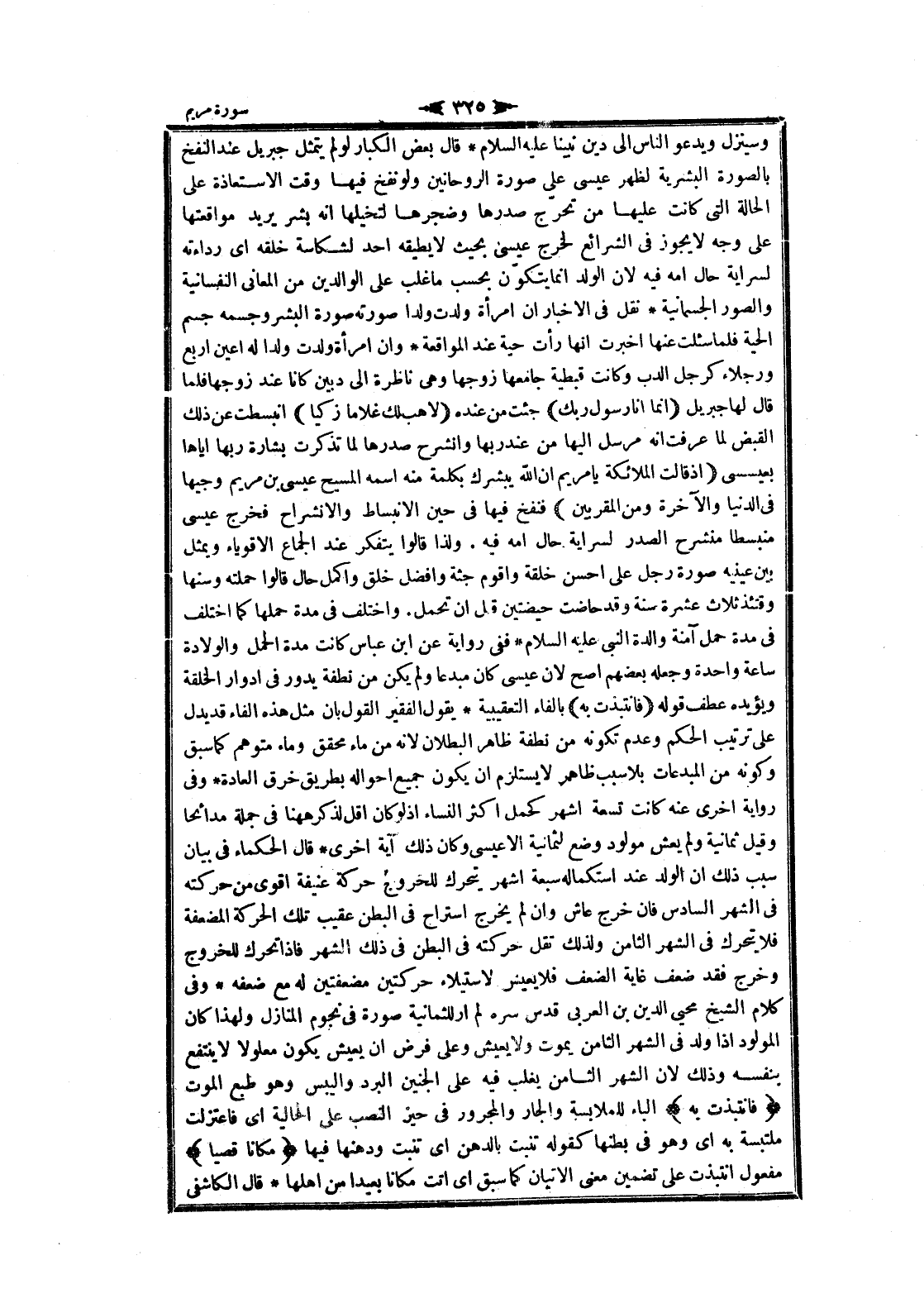 وسينزل ويدعو الناس الى دين نبينا عليه السلام قال بعض الكبار لو لم يتمثل جبريل عند النفخ بالصورة البشرية لظهور عيسى على صورة الروحانيين ولو نفخ فيها وقت الاستعاذة على الحالة التي كانت عليها من تحرّج صدرها وضجرها لتخيلها انه بشر يريد مواقعتها على وجه لا يجوز فى الشرائع لخرج عيسى بحيث لا يطيقه أحد لشكاسة خلقه اى رداءته لسراية حال امه فيه لان الولد انما يتكوّن بحسب ما غلب على الوالدين من المعاني النفسانية والصور الجسمانية نقل فى الاخبار ان امرأة ولدت ولدا صورته صورة البشر وجسمه جسم الحية فلما سئلت عنها أخبرت انها رأت حية عند المواقعة وان امرأة ولدت ولدا له أعين اربع ورجلاء كرجل الدب وكانت قبطية جامعها زوجها وهى ناظرة الى دبين كانا عند زوجها فلما قال لها جبريل (إِنَّما أَنَا رَسُولُ رَبِّكِ)