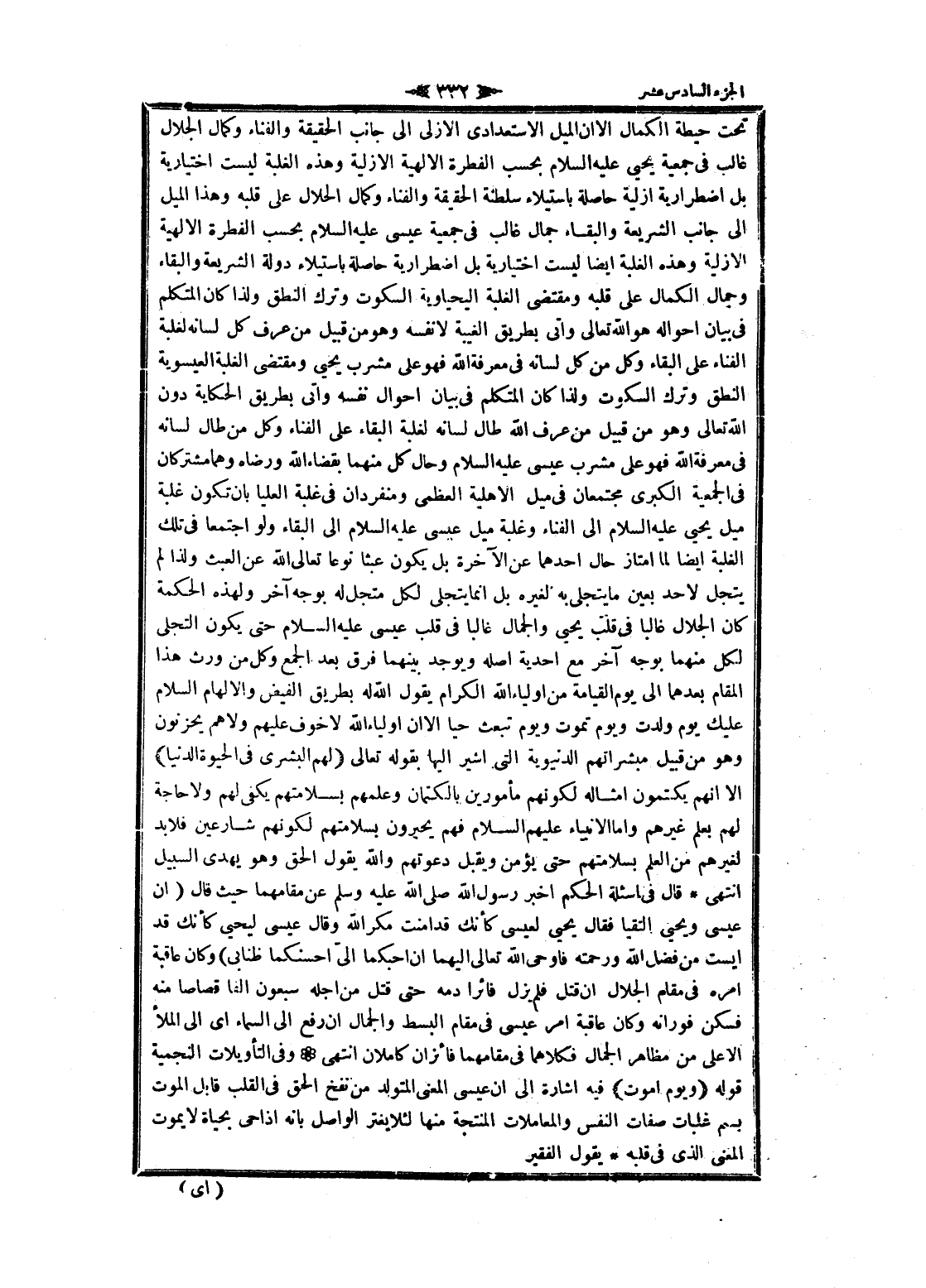لسانه فى معرفة الله فهو على مشرب عيسى عليه السلام وحال كل منهما بقضاء الله ورضاه وهما مشتركان فى الجمعية الكبرى مجتمعان فى ميل الاهلية العظمى ومنفردان فى غلبة العليا بان تكون غلبة ميل يحيى عليه السلام الى الفناء وغلبة ميل عيسى عليه السلام الى البقاء ولو اجتمعا فى تلك الغلبة ايضا لما امتاز حال أحدهما عن الآخرة بل يكون عبثا نوعا تعالى الله عن العبث ولذا لم يتجل لاحد بعين ما يتجلى به لغيره بل انما يتجلى لكل متجل له بوجه آخر ولهذه الحكمة كان الجلال غالبا فى قلب يحيى والجمال غالبا فى قلب عيسى عليه السلام حتى يكون التجلي لكل منهما بوجه آخر مع احدية أصله ويوجد بينهما فرق بعد الجمع وكل من ورث هذا المقام بعدهما الى يوم القيامة من اولياء الله الكرام يقول الله له بطريق الفيض والإلهام السلام عليك يوم ولدت ويوم تموت ويوم تبعث حيا الا ان اولياء الله لا خوف عليهم ولا هم يحزنون وهو من قبيل مبشراتهم الدنيوية التي أشير إليها بقوله تعالىَ هُمُ الْبُشْرى فِي الْحَياةِ الدُّنْيا)