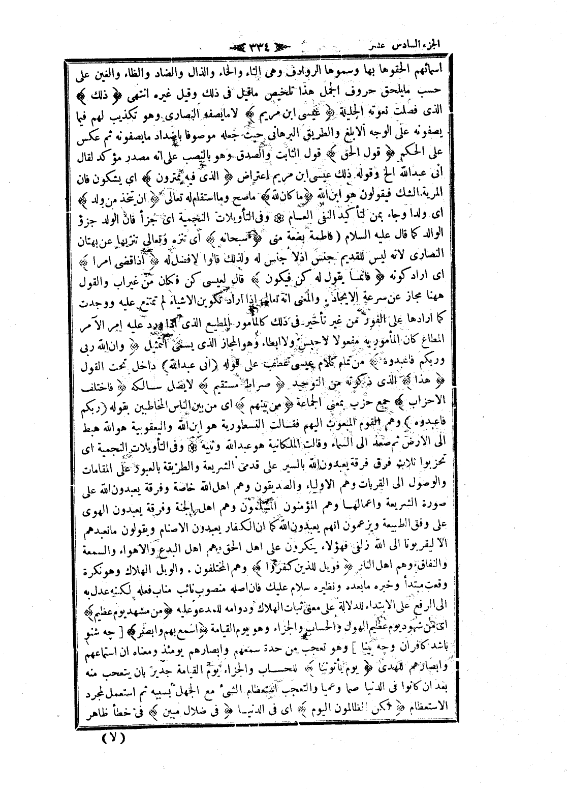 اسمائهم ألحقوها بها وسموها الروادف وهى الثاء والخاء والذال والضاد والظاء والغين على حسب ما يلحق حروف الجمل هذا تلخيص ما قيل فى ذلك وقيل غيره انتهى ذلِكَ الذي فصلت نعوته الجليلة عِيسَى ابْنُ مَرْيَمَ لا ما يصفه النصارى وهو تكذيب لهم فيما يصفونه على الوجه الأبلغ والطريق البرهاني حيث جعله موصوفا باضداد ما يصفونه ثم عكس على الحكم قَوْلَ الْحَقِّ قول الثابت والصدق وهو بالنصب على انه مصدر مؤكد لقال انى عبد الله إلخ وقوله ذلك عيسى ابن مريم اعتراض الَّذِي فِيهِ يَمْتَرُونَ اى يشكون فان المرية الشك فيقولون هو ابن الله ما كانَ لِلَّهِ ما صح وما استقام له تعالى أَنْ يَتَّخِذَ مِنْ وَلَدٍ اى ولدا وجاء بمن لتأكيد النفي العام وفى التأويلات النجمية اى جزأ فان الولد جزؤ الوالد كما قال عليه السلام (فاطمة بضعة منى سُبْحانَهُ اى تنزه وتعالى تنزيها عن بهتان النصارى لانه ليس للقديم جنس إذ لا جنس له ولذلك قالوا لا فضل له إِذا قَضى أَمْراً اى أراد كونه فَإِنَّما يَقُولُ لَهُ كُنْ فَيَكُونُ قال لعيسى كن فكان من غيراب والقول هاهنا مجاز عن سرعة الإيجاد. والمعنى انه تعالى إذا أراد تكوين الأشياء لم تمتنع عليه ووجدت كما أرادها على الفور من غير تأخير فى ذلك كالمأمور المطيع الذي إذا ورد عليه امر الآمر المطاع كان المأمور به مفعولا لا حبس ولا إبطاء وهو المجاز الذي يسمى التمثيل وَإِنَّ اللَّهَ رَبِّي وَرَبُّكُمْ فَاعْبُدُوهُ من تمام كلام عيسى عطف على قوله (إِنِّي عَبْدُ اللَّهِ) داخل تحت القول هذا الذي ذكرته من التوحيد صِراطٌ مُسْتَقِيمٌ لا يضل سالكه فَاخْتَلَفَ الْأَحْزابُ جمع حزب بمعنى الجماعة مِنْ بَيْنِهِمْ اى من بين الناس المخاطبين بقوله (رَبُّكُمْ فَاعْبُدُوهُ) وهم القوم المبعوث إليهم فقالت النسطورية هو ابن الله واليعقوبية هو الله هبط الى الأرض ثم صعد الى السماء وقالت الملكانية هو عبد الله ونبيه وفى التأويلات النجمية اى تحزبوا ثلاث فرق فرقة يعبدون الله بالسير على قدمى الشريعة والطريقة بالعبور على المقامات والوصول الى القربات وهم الأولياء والصديقون وهم اهل الله خاصة وفرقة يعبدون الله على صورة الشريعة وأعمالها وهم المؤمنون المسلمون وهم اهل الجنة وفرقة يعبدون الهوى على وفق الطبيعة ويزعمون انهم يعبدون الله كما ان الكفار يعبدون الأصنام ويقولون ما نعبدهم الا ليقربونا الى الله زلفى فهؤلاء ينكرون على اهل الحق وهم اهل البدع والأهواء والسمعة والنفاق وهم اهل النار فَوَيْلٌ لِلَّذِينَ كَفَرُوا وهم المختلفون. والويل الهلاك وهو نكرة وقعت مبتدأ وخبره ما بعده ونظيره سلام عليك فان أصله منصوب نائب مناب فعله لكنه عدل به الى الرفع على الابتداء للدلالة على معنى ثبات الهلاك ودوامه للمدعو عليه مِنْ مَشْهَدِ يَوْمٍ عَظِيمٍ اى من شهود يوم عظيم الهول والحساب والجزاء وهو يوم القيامة أَسْمِعْ بِهِمْ وَأَبْصِرْ [چهـ شنو باشد كافران و چهـ بينا] وهو تعجب من حدة سمعهم وأبصارهم يومئذ ومعناه ان استماعهم وأبصارهم للهدى يَوْمَ يَأْتُونَنا للحساب والجزاء يوم القيامة جدير بان يتعجب منه بعد ان كانوا فى الدنيا صما وعميا والتعجب استعظام الشيء مع الجهل بسببه ثم استعمل لمجرد الاستعظام لكِنِ الظَّالِمُونَ الْيَوْمَ اى فى الدنيا فِي ضَلالٍ مُبِينٍ فى خطأ ظاهر