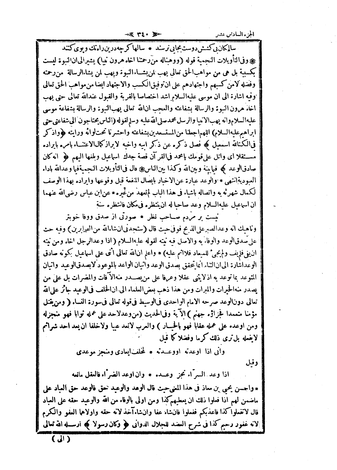 وناهبك انه وعد الصبر على الذبح فوفى حيث قال (سَتَجِدُنِي إِنْ شاءَ اللَّهُ مِنَ الصَّابِرِينَ) وفيه حث على صدق الوعد والوفاء به والأصل فيه نيته لقوله عليه السلام (إذا وعد الرجل أخاه ومن نيته ان يفى فلم يف ولم يجئ للميعاد فلا اثم عليه) واعلم ان الله تعالى اثنى على إسماعيل بكونه صادق الوعد اشارة الى ان الثناء انما يتحقق بصدق الوعد وإتيان الواعد بالموعود لا بصدق الوعيد وإتيان المتوعد بما توعد به إذ لا يثنى عقلا وعرفا على من يصدر منه الآفات والمضرات بل على من يصدر منه الخيرات والمبرات ومن هذا ذهب بعض العلماء الى ان الخلف فى الوعيد جائز على الله تعالى دون الوعد صرحه الامام الواحدي فى الوسيط فى قوله تعالى فى سورة النساء (وَمَنْ يَقْتُلْ مُؤْمِناً مُتَعَمِّداً فَجَزاؤُهُ جَهَنَّمُ) الآية وفى الحديث (من وعد لاحد على عمله ثوابا فهو منجز له ومن أوعده على عمله عقابا فهو بالخيار) والعرب لا تعد عيبا ولا خلفا ان يعد أحد شرا ثم لا يفعله بل ترى ذلك كرما وفضلا كما قيل