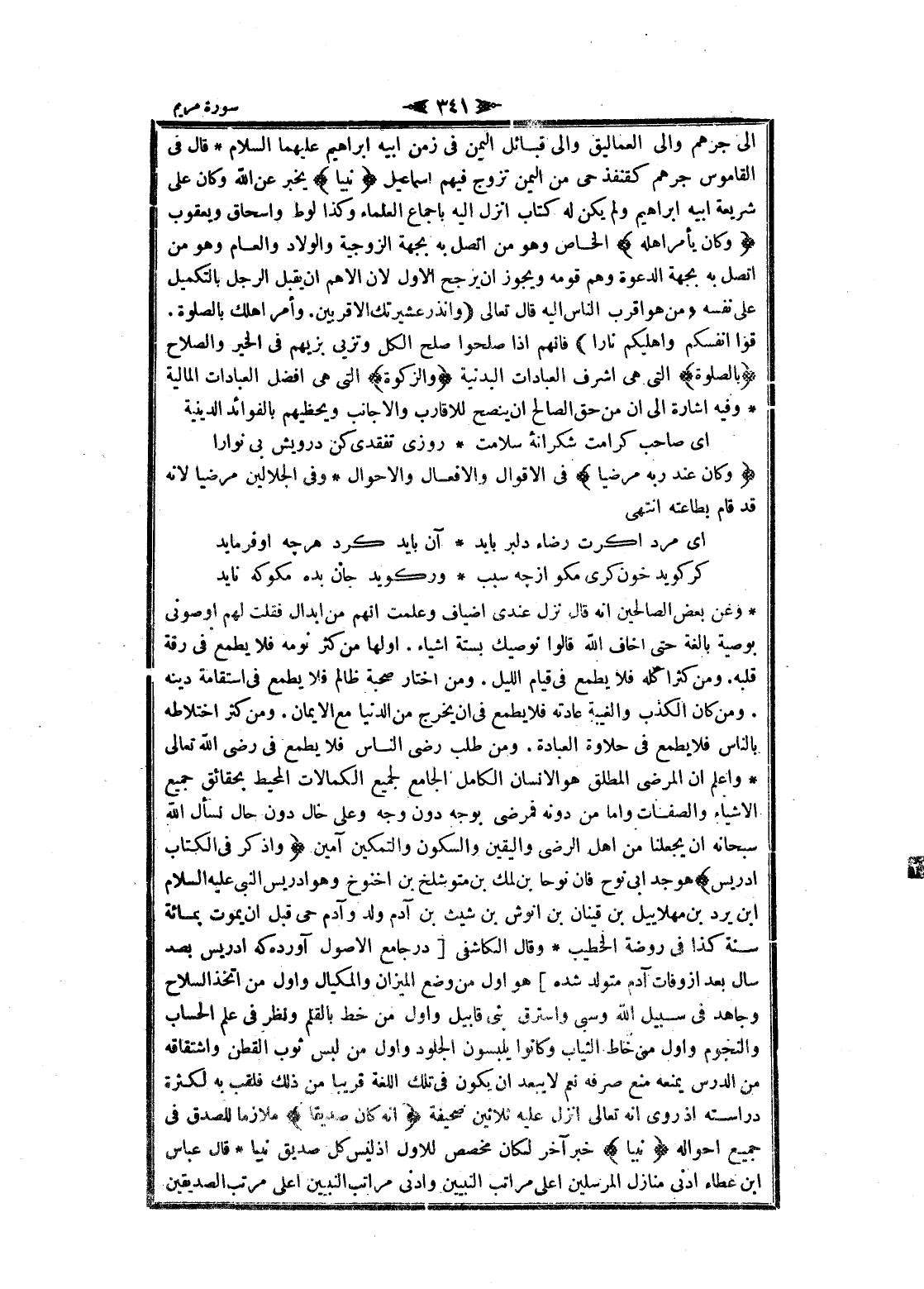 وعن بعض الصالحين انه قال نزل عندى أضياف وعلمت انهم من ابدال فقلت لهم او صونى بوصية بالغة حتى أخاف الله قالوا نوصيك بستة أشياء. أولها من كثر نومه فلا يطمع فى رقة قلبه. ومن كثرا كله فلا يطمع فى قيام الليل. ومن اختار صحبة ظالم فلا يطمع فى استقامة دينه. ومن كان الكذب والغيبة عادته فلا يطمع فى ان يخرج من الدنيا مع الايمان. ومن كثر اختلاطه بالناس فلا يطمع فى حلاوة العبادة. ومن طلب رضى الناس فلا يطمع فى رضى الله تعالى واعلم ان المرضى المطلق هو الإنسان الكامل الجامع لجميع الكمالات المحيط بحقائق جميع الأشياء والصفات واما من دونه فمرضى بوجه دون وجه وعلى حال دون حال نسأل الله سبحانه ان يجعلنا من اهل الرضى واليقين والسكون والتمكين آمين وَاذْكُرْ فِي الْكِتابِ إِدْرِيسَ هو جد ابى نوح فان نوحا بن لمك بن متوشلخ بن أخنوخ وهو إدريس النبي عليه السلام ابن يرد بن مهلاييل بن قينان بن انوش بن شيث بن آدم ولد وآدم حى قبل ان يموت بمائة سنة كذا فى روضة الخطيب وقال الكاشفى [در جامع الأصول آورده كه إدريس بصد سال بعد از وفات آدم متولد شده] هو أول من وضع الميزان والمكيال وأول من اتخذ السلاح وجاهد فى سبيل الله وسبى واسترق بنى قابيل وأول من خط بالقلم ونظر فى علم الحساب والنجوم وأول منى خاط الثياب وكانوا يلبسون الجلود وأول من لبس ثوب القطن واشتقاقه من الدرس يمنعه منع صرفه نعم لا يبعد ان يكون فى تلك اللغة قريبا من ذلك فلقب به لكثرة دراسته إذ روى انه تعالى انزل عليه ثلاثين صحيفة إِنَّهُ كانَ صِدِّيقاً ملازما للصدق فى جميع أحواله نَبِيًّا خبر آخر لكان مخصص للاول إذ ليس كل صديق نبيا قال عباس ابن عطاء ادنى منازل المرسلين أعلى مراتب النبيين وادنى مراتب النبيين أعلى مرتب الصديقين