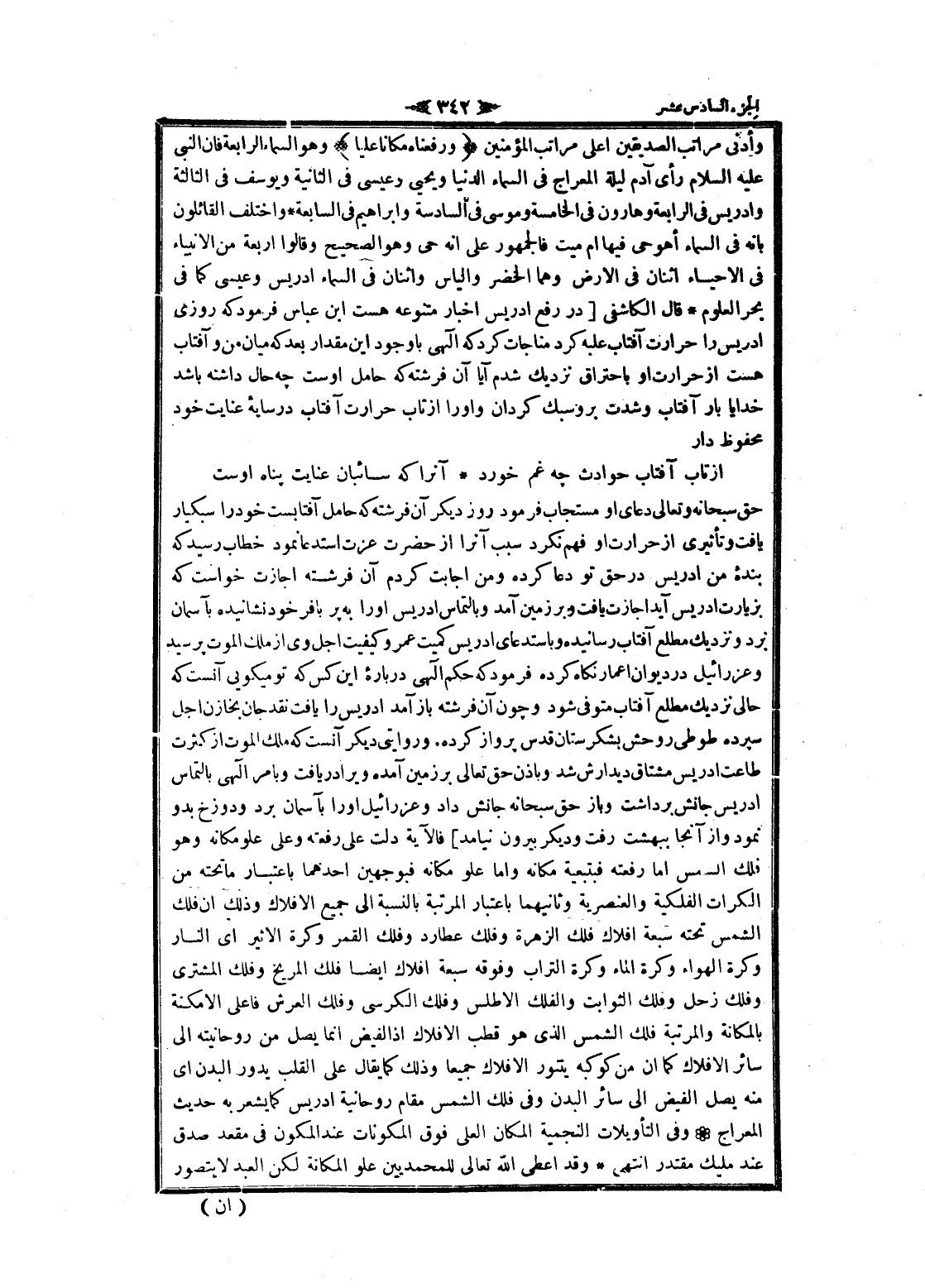 حق سبحانه وتعالى دعاى او مستجاب فرمود روز ديكر آن فرشته كه حامل آفتابست خود را سبكبار يافت وتأثيرى از حرارت او فهم نكرد سبب آنرا از حضرت عزت استدعا نمود خطاب رسيد كه بنده من إدريس در حق تو دعا كرده ومن اجابت كردم آن فرشته اجازت خواست كه بزيارت إدريس آيد اجازت يافت وبر زمين آمد وبالتماس إدريس او را به پر با فر خود نشانيده بآسمان برد ونزديك مطلع آفتاب رسانيده وباستدعاى إدريس كميت عمر وكيفيت أجل وى از ملك الموت پرسيد وعزرائيل در ديوان أعمار نكاه كرده فرمود كه حكم الهى درباره اين كس كه تو ميكويى آنست كه حالى نزديك مطلع آفتاب متوفى شود و چون آن فرشته باز آمد إدريس را يافت نقد جان بخازن أجل سپرده طوطى روحش بشكرستان قدس پرواز كرده. وروايتى ديكر آنست كه ملك الموت از كثرت طاعت إدريس مشتاق ديدارش شد وبإذن حق تعالى بر زمين آمده ويرا در يافت وبامر الهى بالتماس إدريس جانش برداشت وباز حق سبحانه جانش داد وعزرائيل او را بآسمان برد ودوزخ بدو نمود واز آنجا ببهشت رفت وديكر بيرون نيامد] فالآية دلت على رفعته وعلى علو مكانه وهو فلك الشمس اما رفعته فبتبعية مكانه واما علو مكانه فبوجهين أحدهما باعتبار ما تحته من الكرات الفلكية والعنصرية وثانيهما باعتبار المرتبة بالنسبة الى جميع الافلاك وذلك ان فلك الشمس تحته سبعة أفلاك فلك الزهرة وفلك عطارد وفلك القمر وكرة الأثير اى النار وكرة الهواء وكرة الماء وكرة التراب وفوقه سبعة أفلاك ايضا فلك المريخ وفلك المشترى وفلك زحل وفلك الثوابت والفلك الأطلس وفلك الكرسي وفلك العرش فاعلى الامكنة بالمكانة والمرتبة فلك الشمس الذي هو قطب الافلاك إذا لفيض انما يصل من روحانيته الى سائر الافلاك كما ان من كوكبه يتنور الافلاك جميعا وذلك كما يقال على القلب يدور البدن اى منه يصل الفيض الى سائر البدن وفى فلك الشمس مقام روحانية إدريس كما يشعر به حديث المعراج وفى التأويلات النجمية المكان العلى فوق المكونات عند المكون فى مقعد صدق عند مليك مقتدر انتهى وقد اعطى الله تعالى للمحمديين علو المكانة لكن العبد لا يتصور