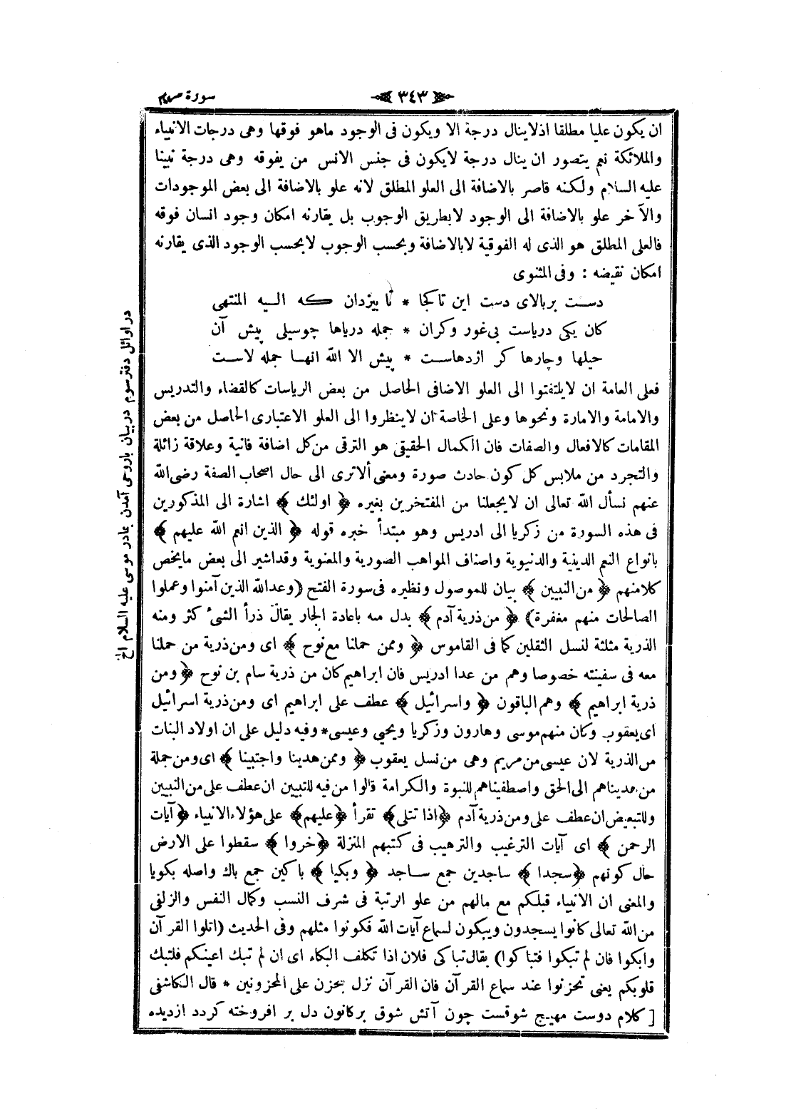 ان يكون عليا مطلقا إذ لا ينال درجة الا ويكون فى الوجود ما هو فوقها وهى درجات الأنبياء والملائكة نعم يتصور ان ينال درجة لا يكون فى جنس الانس من يفوقه وهى درجة نبينا عليه السلام ولكنه قاصر بالاضافة الى العلو المطلق لانه علو بالاضافة الى بعض الموجودات والآخر علو بالاضافة الى الوجود لا بطريق الوجوب بل يقارنه إمكان وجود انسان فوقه فالعلى المطلق هو الذي له الفوقية لا بالاضافة وبحسب الوجوب لا بحسب الوجود الذي يقارنه إمكان نقيضه: وفى المثنوى