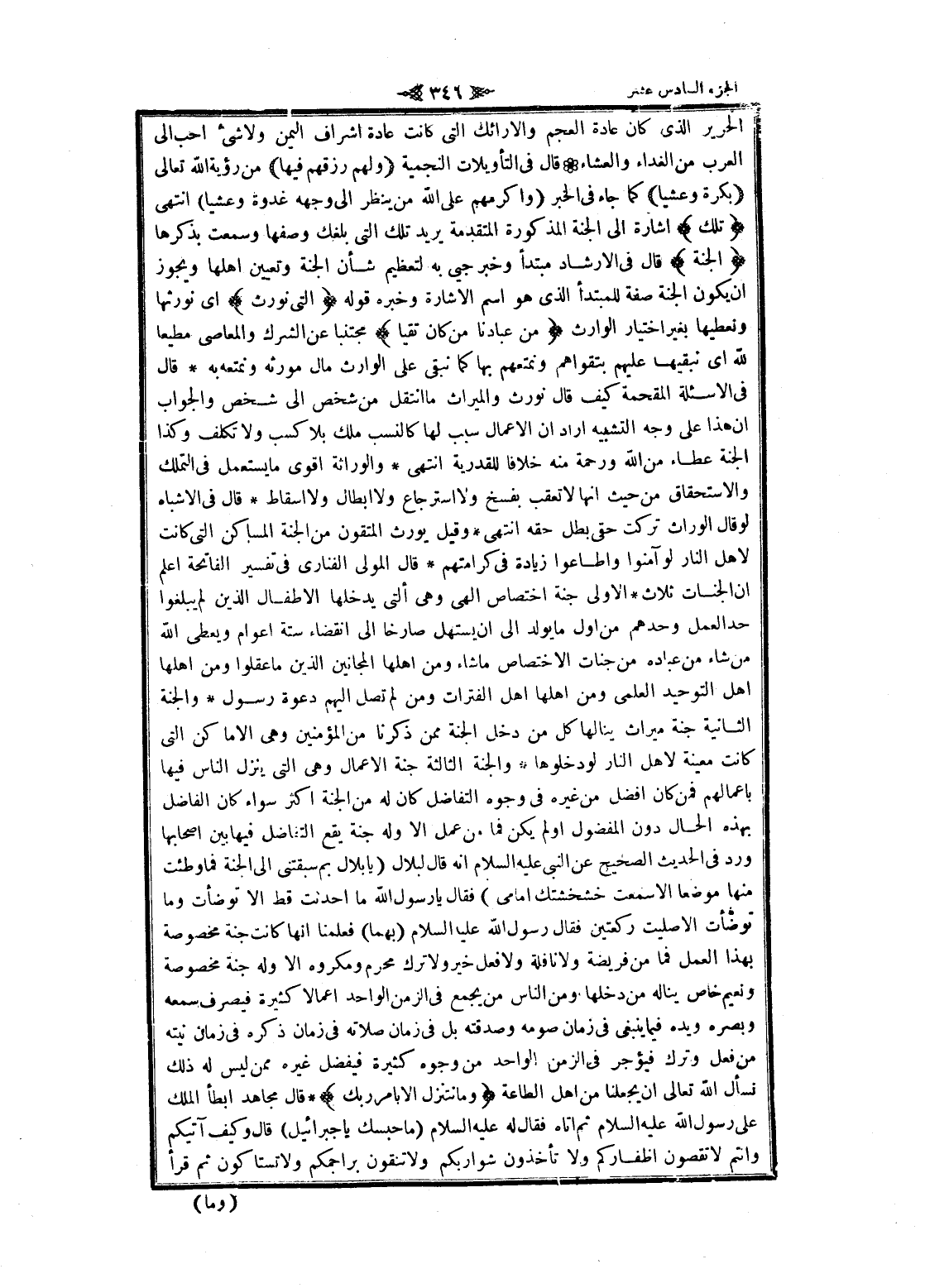 الحرير الذي كان عادة العجم والأرائك التي كانت عادة اشراف اليمن ولا شىء أحب الى العرب من الغداء والعشاء قال فى التأويلات النجمية وَلَهُمْ رِزْقُهُمْ فِيها من رؤية الله تعالى بُكْرَةً وَعَشِيًّا كما جاء فى الخبر (وأكرمهم على الله من ينظر الى وجهه غدوة وعشيا) انتهى تِلْكَ اشارة الى الجنة المذكورة المتقدمة يريد تلك التي بلغك وصفها وسمعت بذكرها الْجَنَّةُ قال فى الإرشاد مبتدأ وخبر جيى به لتعظيم شأن الجنة وتعيين أهلها ويجوز ان يكون الجنة صفة للمبتدأ الذي هو اسم الاشارة وخبره قوله الَّتِي نُورِثُ اى نورثها ونعطيها بغير اختيار الوارث مِنْ عِبادِنا مَنْ كانَ تَقِيًّا مجتنبا عن الشرك والمعاصي مطيعا لله اى نبقيها عليهم بتقواهم ونمتعهم بها كما نبقى على الوارث مال مورثه ونمتعه به قال فى الاسئلة المقحمة كيف قال نورث والميراث ما انتقل من شخص الى شخص والجواب ان هذا على وجه التشبيه أراد ان الأعمال سبب لها كالنسب ملك بلا كسب ولا تكلف وكذا الجنة عطاء من الله ورحمة منه خلافا للقدرية انتهى والوراثة أقوى ما يستعمل فى التملك والاستحقاق من حيث انها لا تعقب بفسخ ولا استرجاع ولا ابطال ولا إسقاط قال فى الأشباه لو قال الوراث تركت حقى بطل حقه انتهى وقيل يورث المتقون من الجنة المساكن التي كانت لاهل النار لو آمنوا وأطاعوا زيادة فى كرامتهم قال المولى الفنارى فى تفسير الفاتحة اعلم ان الجنات ثلاث الاولى جنة اختصاص الهى وهى التي يدخلها الأطفال الذين لم يبلغوا حد العمل وحدهم من أول ما يولد الى ان يستهل صارخا الى انقضاء ستة أعوام ويعطى الله من شاء من عباده من جنات الاختصاص ما شاء ومن أهلها المجانين الذين ما عقلوا ومن أهلها اهل التوحيد العلمي ومن أهلها اهل الفترات ومن لم تصل إليهم دعوة رسول والجنة الثانية جنة ميراث ينالها كل من دخل الجنة ممن ذكرنا من المؤمنين وهى الأماكن التي كانت معينة لاهل النار لو دخلوها والجنة الثالثة جنة الأعمال وهى التي ينزل الناس فيها بأعمالهم فمن كان أفضل من غيره فى وجوه التفاضل كان له من الجنة اكثر سواء كان الفاضل بهذه الحال دون المفضول او لم يكن فما من عمل الا وله جنة يقع التفاضل فيها بين أصحابها ورد فى الحديث الصحيح عن النبي عليه السلام انه قال لبلال (يا بلال بم سبقتنى الى الجنة فما وطئت منها موضعا الا سمعت خشخشتك امامى) فقال يا رسول الله ما أحدثت قط الا توضأت وما توضأت الا صليت ركعتين فقال رسول الله عليه السلام (بهما) فعلمنا انها كانت جنة مخصوصة بهذا العمل فما من فريضة ولا نافلة ولا فعل خير ولا ترك محرم ومكروه الا وله جنة مخصوصة ونعيم خاص يناله من دخلها ومن الناس من يجمع فى الزمن الواحد أعمالا كثيرة فيصرف سمعه وبصره ويده فيما ينبغى فى زمان صومه وصدقته بل فى زمان صلاته فى زمان ذكره فى زمان نيته من فعل وترك فيؤجر فى الزمن الواحد من وجوه كثيرة فيفضل غيره ممن ليس له ذلك نسأل الله تعالى ان يجعلنا من اهل الطاعة وَما نَتَنَزَّلُ إِلَّا بِأَمْرِ رَبِّكَ قال مجاهد ابطأ الملك على رسول الله عليه السلام ثم أتاه فقال له عليه السلام (ما حبسك يا جبرائيل) قال وكيف آتيكم وأنتم لا تقصون أظفاركم ولا تأخذون شواربكم ولا تنقون براجمكم ولا تستاكون ثم قرأ