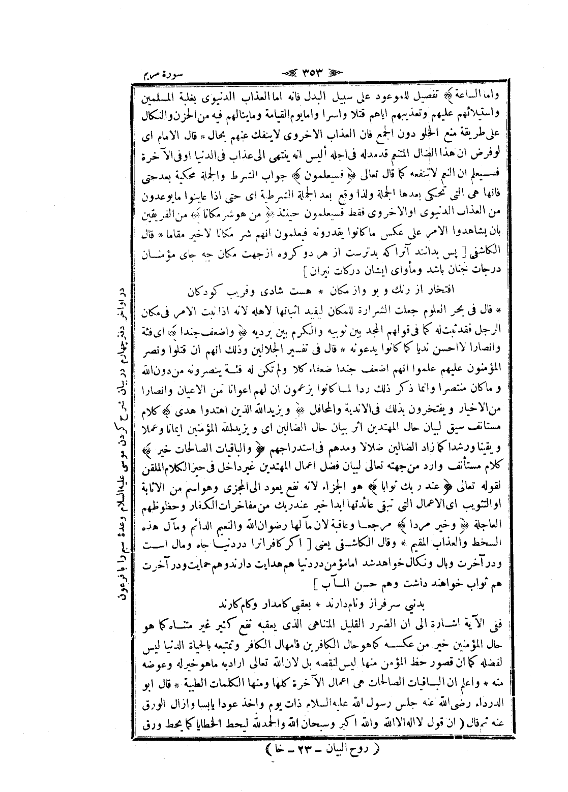 قال فى بحر العلوم جعلت الشرارة للمكان ليفيد إثباتها لاهله لانه إذا ثبت الأمر فى مكان الرجل فقد ثبت له كما فى قولهم المجد بين ثوبيه والكرم بين برديه وَأَضْعَفُ جُنْداً اى فئة وأنصارا لا احسن نديا كما كانوا يدعونه قال فى تفسير الجلالين وذلك انهم ان قتلوا ونصر المؤمنون عليهم علموا انهم أضعف جندا ضعفاء كلا ولم تكن له فئة ينصرونه من دون الله وما كان منتصرا وانما ذكر ذلك ردا لما كانوا يزعمون ان لهم أعوانا من الأعيان وأنصارا من الأخيار ويفتخرون بذلك فى الاندية والمحافل وَيَزِيدُ اللَّهُ الَّذِينَ اهْتَدَوْا هُدىً كلام مستانف سيق لبيان حال المهتدين اثر بيان حال الضالين اى ويزيد الله المؤمنين ايمانا وعملا ويقينا ورشدا كما زاد الضالين ضلالا ومدهم فى استدراجهم وَالْباقِياتُ الصَّالِحاتُ خَيْرٌ كلام مستأنف وارد من جهته تعالى لبيان فضل اعمال المهتدين غير داخل فى حيز الكلام الملقن لقوله تعالى عِنْدَ رَبِّكَ ثَواباً هو الجزاء لانه نفع يعود الى المجزى وهو اسم من الاثابة او التثويب اى الأعمال التي تبقى عائدتها ابدا خير عند ربك من مفاخرات الكفار وحظوظهم العاجلة وَخَيْرٌ مَرَدًّا مرجعا وعاقبة لان ما لها رضوان الله والنعيم الدائم ومآل هذه السخط والعذاب المقيم وقال الكاشفى يعنى [اگر كافرانرا در دنيا جاه ومال است ودر آخرت وبال ونكال خواهد شد اما مؤمن در دنيا هم هدايت دارند وهم حمايت ودر آخرت هم ثواب خواهند داشت وهم حسن المآب]