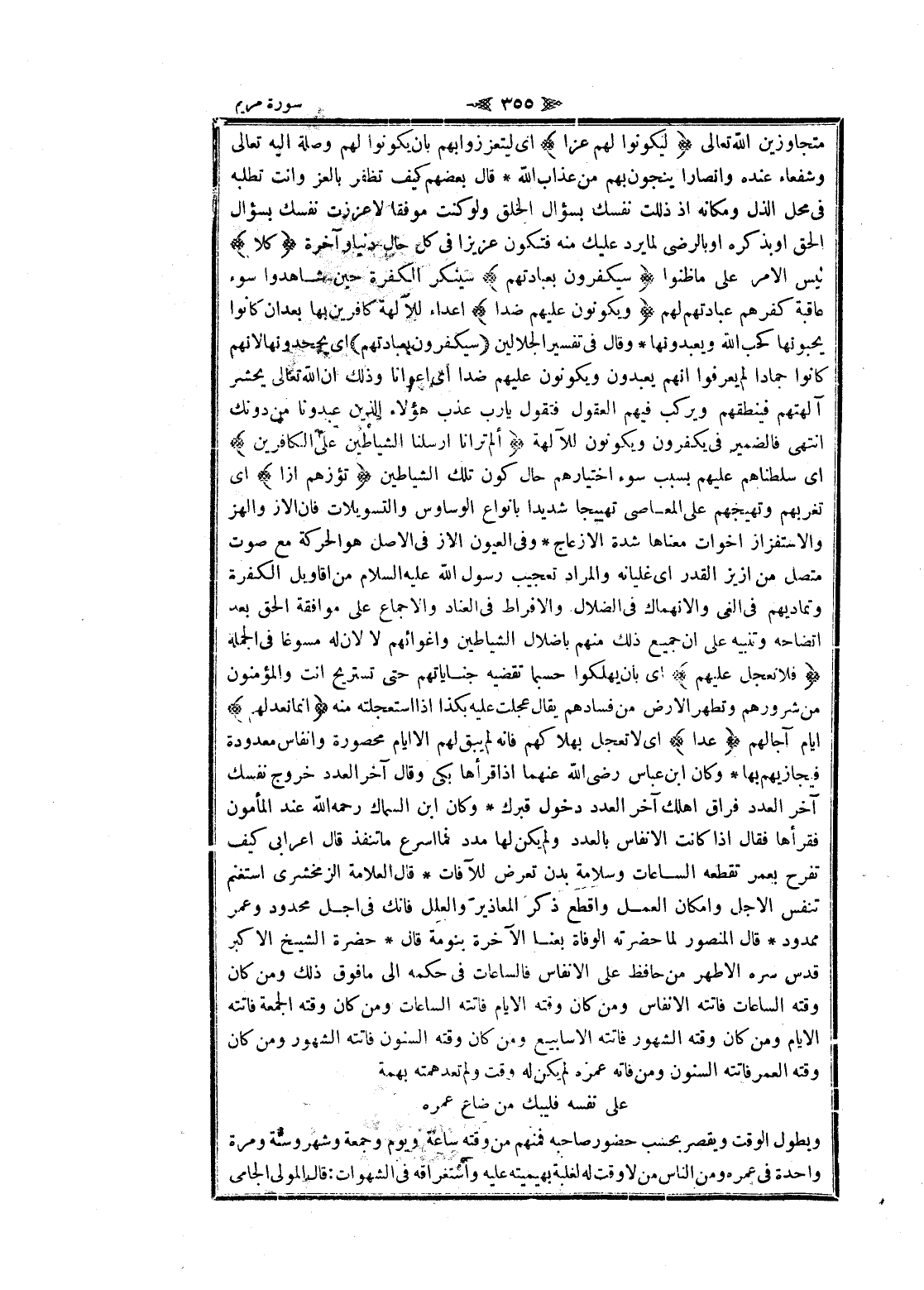 متجاوزين الله تعالى لِيَكُونُوا لَهُمْ عِزًّا اى ليتعز زوابهم بان يكونوا لهم وصلة اليه تعالى وشفعاء عنده وأنصارا ينجون بهم من عذاب الله قال بعضهم كيف تظفر بالعز وأنت تطلبه فى محل الذل ومكانه إذ ذللت نفسك بسؤال الخلق ولو كنت موفقا لا عززت نفسك بسؤال الحق او بذكره او بالرضى لما يرد عليك منه فتكون عزيزا فى كل حال دنيا وآخرة كَلَّا ليس الأمر على ما ظنوا سَيَكْفُرُونَ بِعِبادَتِهِمْ سينكر الكفرة حين شاهدوا سوء عاقبة كفرهم عبادتهم لهم وَيَكُونُونَ عَلَيْهِمْ ضِدًّا اعداء للآلهة كافرين بها بعد ان كانوا يحبونها كحب الله ويعبدونها وقال فى تفسير الجلالين سَيَكْفُرُونَ بِعِبادَتِهِمْ اى يجحدونها لانهم كانوا جمادا لم يعرفوا انهم يعبدون ويكونون عليهم ضدا اى أعوانا وذلك ان الله تعالى يحشر آلهتهم فينطقهم ويركب فيهم العقول فتقول يا رب عذب هؤلاء الذين عبدونا من دونك انتهى فالضمير فى يكفرون ويكونون للآلهة أَلَمْ تَرَ أَنَّا أَرْسَلْنَا الشَّياطِينَ عَلَى الْكافِرِينَ اى سلطناهم عليهم بسبب سوء اختيارهم حال كون تلك الشياطين تَؤُزُّهُمْ أَزًّا اى تغربهم وتهيجهم على المعاصي تهييجا شديدا بانواع الوساوس والتسويلات فان الاز والهز والاستفزاز أخوات معناها شدة الإزعاج وفى العيون الاز فى الأصل هو الحركة مع صوت متصل من ازيز القدر اى غليانه والمراد تعجيب رسول الله عليه السلام من أقاويل الكفرة وتماديهم فى الغى والانهماك فى الضلال والافراط فى العناد والإجماع على موافقة الحق بعد اتضاحه وتنبيه على ان جميع ذلك منهم بإضلال الشياطين واغوائهم لا لان له مسوغا فى الجملة فَلا تَعْجَلْ عَلَيْهِمْ اى بان يهلكوا حسبما تقضيه جناياتهم حتى تستريح أنت والمؤمنون من شرورهم وتطهر الأرض من فسادهم يقال عجلت عليه بكذا إذا استعجلته منه إِنَّما نَعُدُّ لَهُمْ ايام آجالهم عَدًّا اى لا تعجل بهلاكهم فانه لم يبق لهم الا ايام محصورة وأنفاس معدودة فيجازيهم بها وكان ابن عباس رضى الله عنهما إذا قرأها بكى وقال آخر العدد خروج نفسك آخر العدد فراق أهلك آخر العدد دخول قبرك وكان ابن السماك رحمه الله عند المأمون فقرأها فقال إذا كانت الأنفاس بالعدد ولم يكن لها مدد فما اسرع ما تنفذ قال أعرابي كيف تفرح بعمر تقطعه الساعات وسلامة بدن تعرض للآفات قال العلامة الزمخشري استغنم تنفس الاجل وإمكان العمل واقطع ذكر المعاذير والعلل فانك فى أجل محدود وعمر ممدود قال المنصور لما حضرته الوفاة بعنا الآخرة بنومة قال حضرة الشيخ الأكبر قدس سره الأطهر من حافظ على الأنفاس فالساعات فى حكمه الى ما فوق ذلك ومن كان وقته الساعات فاتته الأنفاس ومن كان وقته الأيام فاتته الساعات ومن كان وقته الجمعة فاتته الأيام ومن كان وقته الشهور فاتته الأسابيع ومن كان وقته السنون فاتته الشهور ومن كان وقته العمر فاتته السنون ومن فاته عمره لم يكن له وقت ولم تعد همته بهمة على نفسه فليبك من ضاع عمره ويطول الوقت ويقصر بحسب حضور صاحبه فمنهم من وقته ساعة ويوم وجمعة وشهر وسنة ومرة واحدة فى عمره ومن الناس من لا وقت له لغلبة بهيميته عليه واستغراقه فى الشهوات: قال المولى الجامى