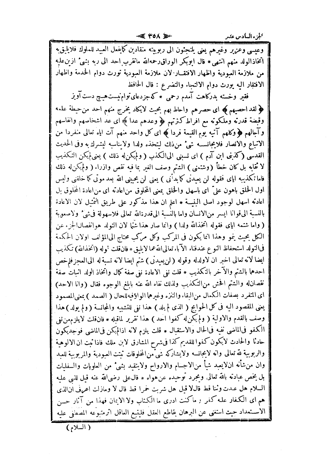 لَقَدْ أَحْصاهُمْ اى حصرهم وأحاط بهم بحيث لا يكاد يخرج منهم أحد من حيطة علمه وقبضة قدرته وملكوته مع افراط كثرتهم وَعَدَّهُمْ عَدًّا اى عد أشخاصهم وأنفاسهم وآجالهم وَكُلُّهُمْ آتِيهِ يَوْمَ الْقِيامَةِ فَرْداً اى كل واحد منهم آت إياه تعالى منفردا من الاتباع والأنصار فلا يجانسه شىء من ذلك ليتخذه ولدا ولا يناسبه ليشرك به وفى الحديث القدسي (كذبنى ابن آدم) اى نسبنى الى الكذب (ولم يكن له ذلك) يعنى لم يكن التكذيب لائقا به بل كان خطأ (وشتمنى) الشتم وصف الغير بما فيه نقص وإزراء (ولم يكن له ذلك فاما تكذيبه إياي فقوله لن يعيدنى كما بدأنى) يعنى لن يحيينى الله بعد موتى كما خلقنى وليس أول الخلق باهون علىّ اى بأسهل والخلق بمعنى المخلوق من إعادته اى من إعادة المخلوق بل إعادته أسهل لوجود اصل البنية اعلم ان هذا مذكور على طريق التمثيل لان الاعادة بالنسبة الى قوانا أيسر من الإنسان واما بالنسبة الى قدرة الله تعالى فلا سهولة فى شىء ولا صعوبة (واما شتمه إياي فقوله اتخذ الله ولدا) وانما صار هذا شتما لان التولد هو انفصال الجزء عن الكل بحيث ينمو وهذا انما يكون فى المركب وكل مركب محتاج الى المؤلف او لان الحكمة فى التولد استحفاظ النوع عند فناء الآباء تعالى الله عما لا يليق فان قلت قوله (اتخذ الله) تكذيب ايضا لانه تعالى اخبر ان لا ولد له وقوله (لن يعيدنى) شتم ايضا لانه نسبة له الى العجز فلم خص أحدهما بالشتم والآخر بالتكذيب قلت نفى الاعادة نفى صفة كمال واتخاذ الولد اثبات صفة نقصان له والشتم افحش من التكذيب ولذلك نفاه الله عنه بأبلغ الوجوه فقال (وانا الأحد) اى المتفرد بصفات الكمال من البقاء والتنزه وغيرهما الواو فيه للحال (الصمد) بمعنى المصمود يعنى المقصود اليه فى كل الحوائج (الذي لم يلد) هذا نفى للتشبيه والمجانسة (ولم يولد) هذا وصف بالقدم والاولية (ولم يكن له كفوا أحد) هذا تقرير لما قبله فان قلت لا يلزم من نفى الكفو فى الماضي نفيه فى الحال والاستقبال قلت يلزم لانه إذا لم يكن فى الماضي فوجد يكون حادثا والحادث لا يكون كفوا للقديم كذا فى شرح المشارق لابن ملك فاذا ثبت ان الالوهية والربوبية لله تعالى وانه لا يجانسه ولا يشاركه شىء من المخلوقات ثبتت العبودية والمربوبية للعبد وان من شأنه ان لا يعبد شيأ من الأجسام والأرواح ولا يتقيد بشئ من العلويات والسفليات بل يخص عبادته بالله تعالى ويجرد توحيده عن هواه قال على رضى الله عنه قيل للنبى عليه السلام هل عبدت وثنا قط قال لا قيل هل شربت خمرا قط قال لا وما زلت اعرف ان الذي هم اى الكفار عليه كفر وما كنت أدرى ما الكتاب ولا الايمان فهذا من آثار حسن الاستعداد حيث استغنى عن البرهان بقاطع العقل فليتبع العاقل اثر متبوعه المصطفى عليه