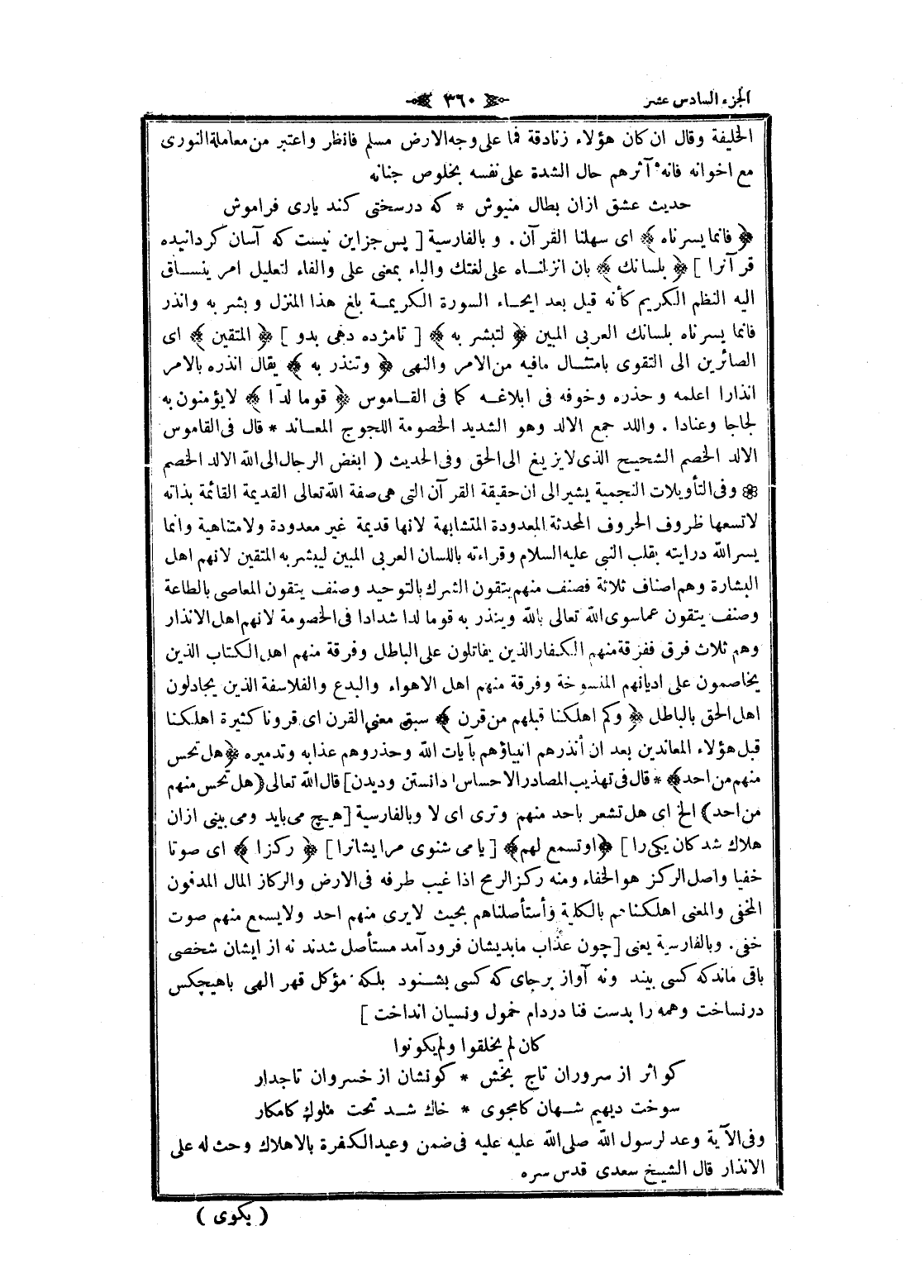 فَإِنَّما يَسَّرْناهُ اى سهلنا القرآن. وبالفارسية [پس جز اين نيست كه آسان كردانيده قرآنرا] بِلِسانِكَ بان أنزلناه على لغتك والباء بمعنى على والفاء لنعليل امر ينساق اليه النظم الكريم كأنه قيل بعد ايحاء السورة الكريمة بلغ هذا المنزل وبشر به وانذر فانما يسرناه بلسانك العربي المبين لِتُبَشِّرَ بِهِ [تا مژده دهى بدو] الْمُتَّقِينَ اى الصائرين الى التقوى بامتثال ما فيه من الأمر والنهى وَتُنْذِرَ بِهِ يقال أنذره بالأمر انذارا اعلمه وحذره وخوفه فى إبلاغه كما فى القاموس قَوْماً لُدًّا لا يؤمنون به لجاجا وعنادا. واللد جمع الألد وهو الشديد الخصومة اللجوج المعاند قال فى القاموس الألد الخصم الشحيح الذي لا يزيغ الى الحق وفى الحديث (ابغض الرجال الى الله الألد الخصم وفى التأويلات النجمية يشير الى ان حقيقة القرآن التي هى صفة الله تعالى القديمة القائمة بذاته لا تسعها ظروف الحروف المحدثة المعدودة المتشابهة لانها قديمة غير معدودة ولا متناهية وانما يسر الله درايته بقلب النبي عليه السلام وقراءته باللسان العربي المبين ليبشر به المتقين لانهم اهل البشارة وهم اصناف ثلاثة فصنف منهم يتقون الشرك بالتوحيد وصنف يتقون المعاصي بالطاعة وصنف يتقون عما سوى الله تعالى بالله وينذر به قوما لذا شدادا فى الخصومة لانهم اهل الانذار وهم ثلاث فرق ففرقة منهم الكفار الذين يقاتلون على الباطل وفرقة منهم اهل الكتاب الذين يخاصمون على اديانهم المنسوخة وفرقة منهم اهل الأهواء والبدع والفلاسفة الذين يجادلون اهل الحق بالباطل وَكَمْ أَهْلَكْنا قَبْلَهُمْ مِنْ قَرْنٍ سبق معنى القرن اى قرونا كثيرة أهلكنا قبل هؤلاء المعاندين بعد ان أنذرهم انبياؤهم بآيات الله وحذروهم عذابه وتدميره هَلْ تُحِسُّ مِنْهُمْ مِنْ أَحَدٍ قال فى تهذيب المصادر الاحساس [دانستن وديدن] قال الله تعالى (هَلْ تُحِسُّ مِنْهُمْ مِنْ أَحَدٍ) إلخ اى هل تشعر بأحد منهم وترى اى لا وبالفارسية [هيچ مى بايد ومى بينى از آن هلاك شدكان يكى را] أَوْ تَسْمَعُ لَهُمْ [يا مى شنوى مرا يشانرا] رِكْزاً اى صوتا خفيا واصل الركز هو الخفاء ومنه ركز الرمح إذا غيب طرفه فى الأرض والركاز المال المدفون المخفي والمعنى أهلكناهم بالكلية وأستأصلناهم بحيث لا يرى منهم أحد ولا يسمع منهم صوت خفى. وبالفارسية يعنى [چون عذاب ما بديشان فرود آمد مستأصل شدند نه از ايشان شخصى باقى ماند كه كسى بيند ونه آواز بر جاى كه كسى بشنود بلكه مؤكل قهر الهى با هيچكس در نساخت وهمه را بدست فنا در دام خمول ونيسان انداخت] كان لم يخلقوا ولم يكونوا