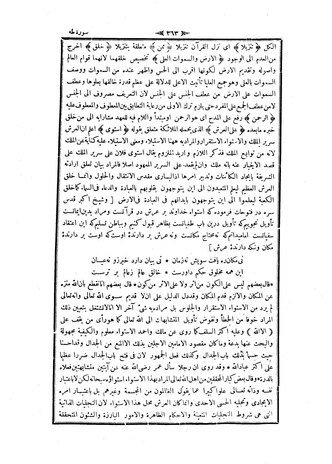 الكل تَنْزِيلًا اى نزل القرآن تنزيلا مِمَّنْ متعلقة بتنزيلا خَلَقَ اخرج من العدم الى الوجود الْأَرْضَ وَالسَّماواتِ الْعُلى تخصيص خلقهما لانهما قوام العالم وأصوله وتقديم الأرض لكونها اقرب الى الحس واظهر عنده من السموات ووصف السموات بالعلى وهو جمع العليا تأنيث الا على للدلالة على عظم قدرة خالقها بعلوها وعطف السموات على الأرض من عطف الجنس على الجنس لان التعريف مصروف الى الجنس لا من عطف الجمع على المفرد حتى يلزم ترك الاولى من رعاية التطابق بين المعطوف والمعطوف عليه الرَّحْمنُ رفع على المدح اى هو الرحمن او مبتدأ واللام فيه للعهد مشارا به الى من خلق خبره ما بعده عَلَى الْعَرْشِ الذي يحمله الملائكة متعلق بقوله اسْتَوى اعلم ان العرش سرير الملك والاستواء الاستقرار والمراد به هاهنا الاستيلاء ومعنى الاستيلاء عليه كناية عن الملك لانه من توابع الملك فذكر اللازم وأريد الملزوم يقال استوى فلان على سرير الملك على قصد الاخبار عنه بانه ملك وان لم يقعد على السرير المعهود أصلا فالمراد بيان تعلق إرادته الشريفة بايجاد الكائنات وتدبير أمرها إذ الباري مقدس الانتقال والحلول وانما خلق العرش العظيم ليعلم المتعبدون الى اين يتوجهون بقلوبهم بالعبادة والدعاء فى السماء كما خلق الكعبة ليعلموا الى اين يتوجهون بأبدانهم فى العبادة فى الأرض [وشيخ اكبر قدس سره در فتوحات فرموده كه استواء خداوند بر عرش در قرآنست ومراد بدين ايمانست تأويل نجوييم كه تأويل درين باب طغيانست بظاهر قبول كنيم وبباطن تسليم كه اين اعتقاد سفيانست اما ميدانم كه نه محتاج مكانست ونه عرش بر دارنده اوست كه اوست بر دارنده مكان ونكه دارنده عرش]