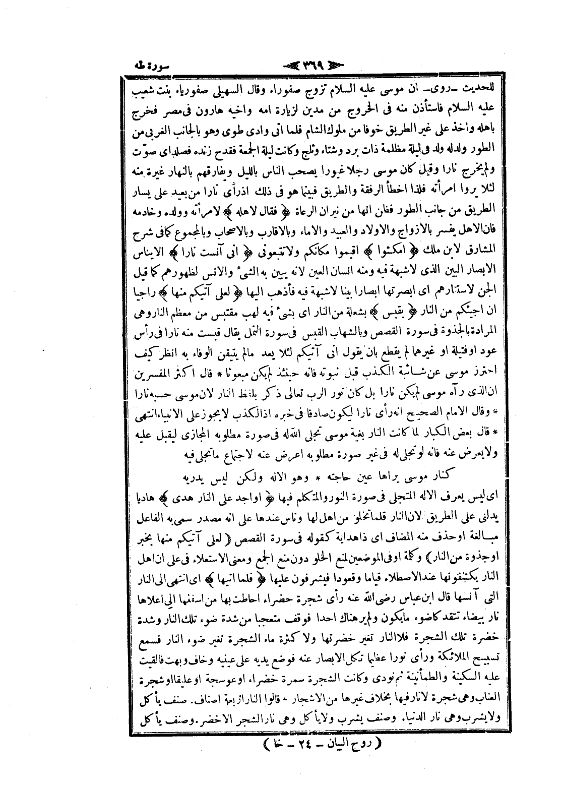 للحديث- روى- ان موسى عليه السلام تزوج صفوراء وقال السهيلي صفورياء بنت شعيب عليه السلام فاستأذن منه فى الخروج من مدين لزيارة امه وأخيه هارون فى مصر فخرج باهله وأخذ على غير الطريق خوفا من ملوك الشام فلما اتى وادي طوى وهو بالجانب الغربي من الطور ولد له ولد فى ليلة مظلمة ذات برد وشتاء وثلج وكانت ليلة الجمعة فقدح زنده فصلد اى صوّت ولم يخرج ناوا وقيل كان موسى رجلا غيورا يصحب الناس بالليل ويفارقهم بالنهار غيرة منه لئلا يروا امرأته فلذا اخطأ الرفقة والطريق فبينما هو فى ذلك إذ رأى نارا من بعيد على يسار الطريق من جانب الطور فظن انها من نيران الرعاة فَقالَ لِأَهْلِهِ لامرأته وولده وخادمه فان الأهل يفسر بالأزواج والأولاد والعبيد والإماء وبالأقارب وبالاصحاب وبالمجموع كما فى شرح المشارق لابن ملك امْكُثُوا اقيموا مكانكم ولا تتبعونى إِنِّي آنَسْتُ ناراً الإيناس الابصار البين الذي لا شبهة فيه ومنه انسان العين لانه يبين به الشيء والانس لظهورهم كما قيل الجن لاستتارهم اى أبصرتها ابصارا بينا لا شبهة فيه فأذهب إليها لَعَلِّي آتِيكُمْ مِنْها راجيا ان اجيئكم من النار بِقَبَسٍ بشعلة من النار اى بشئ فيه لهب مقتبس من معظم النار وهى المرادة بالجذوة فى سورة القصص وبالشهاب القبس فى سورة النمل يقال قبست منه نارا فى رأس عود او فتيلة او غيرهما لم يقطع بان يقول انى آتيكم لئلا يعد ما لم يتيقن الوفاء به انظر كيف احترز موسى عن شائبة الكذب قبل نبوته فانه حينئذ لم يكن مبعوثا قال اكثر المفسرين ان الذي رآه موسى لم يكن نارا بل كان نور الرب تعالى ذكر بلفظ النار لان موسى حسبه نارا وقال الامام الصحيح انه رأى نارا ليكون صادقا فى خبره إذ الكذب لا يجوز على الأنبياء انتهى قال بعض الكبار لما كانت النار بغية موسى تجلى الله له فى صورة مطلوبه المجازى ليقبل عليه ولا يعرض عنه فانه لو تجلى له فى غير صورة مطلوبه اعرض عنه لاجتماع ما تجلى فيه