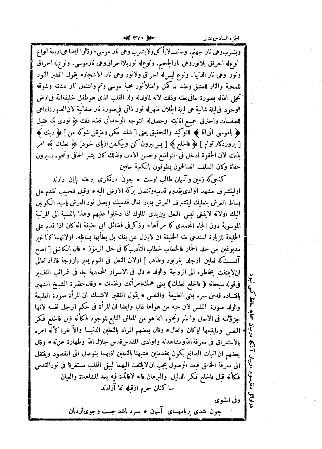 ويشرب وهى نار جهنم. وصنف لا يأكل ولا يشرب وهى نار موسى وقالوا ايضا هى اربعة انواع نوع له إحراق بلا نور وهى نار الجحيم. ونوع له نور بلا إحراق وهى نار موسى. ونوع له إحراق ونور وهى نار الدنيا. ونوع ليس له إحراق ولا نور وهى نار الأشجار يقول الفقير النور للمحبة والنار للعشق وعند ما كمل وامتلأ نور محبة موسى وتم واشتعل نار عشقه وشوقه تجلى الله له بصورة ما فى بطنه وذلك لانه لما ولد له ولد القلب الذي هو طفل خليفة الله فى ارض الوجود فى ليلة شاتية هى ليلة الجلال ظهر له نور ذاتى فى صورة نار صفاتية لان الصورة انما هى للصفات واحترق جميع انانيته وحصل له التوجه الوحدانى فعند ذلك نُودِيَ فقيل يا مُوسى إِنِّي أَنَا للتوكيد والتحقيق يعنى [شك مكن ومتيقن شو كه من] رَبُّكَ [پروردگار توام] فَاخْلَعْ [پس بيرون كن وبيكفن از پاى خود] نَعْلَيْكَ امر بذلك لان الحفوة ادخل فى التواضع وحسن الأدب ولذلك كان بشر الحافى ونحوه يسيرون حفاة وكان السلف الصالحون يطوفون بالكعبة حافين