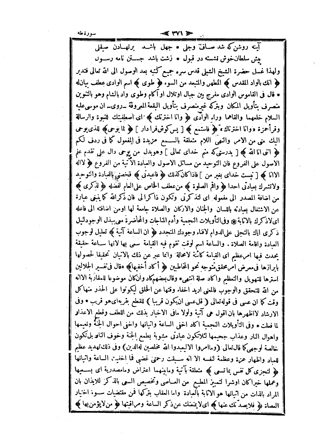 ولهذا غسل حضرة الشيخ الشبلي قدس سره جميع كتبه بعد الوصول الى الله تعالى فتدبر إِنَّكَ بِالْوادِ الْمُقَدَّسِ المطهر والمتبعد من السوء طُوىً اسم الوادي عطف بيان له قال فى القاموس الوادي مفرج بين جبال او تلال او آكام وطوى واد بالشام وهو بالتنوين منصرف بتأويل المكان وبتركه غير منصرف بتأويل البقعة المعروفة- روى- ان موسى عليه السلام خلعهما والقاهما وراء الوادي وَأَنَا اخْتَرْتُكَ اى اصطفيتك للنبوة والرسالة وقرأ حمزة «وانا اخترناك» فَاسْتَمِعْ [پس كوش فرادار] لِما يُوحى للذى يوحى إليك منى من الأمر والنهى اللام متعلقة بالسمع مزيدة فى المفعول كما فى ردف لكم إِنَّنِي أَنَا اللَّهُ [بدرستى كه منم خداى تعالى] وهو بدل من يوحى دال على تقدم علم الأصول على الفروع فان التوحيد من مسائل الأصول والعبادة الآتية من الفروع لا إِلهَ إِلَّا أَنَا [نيست خداى بغير من] فاذا كان كذلك فَاعْبُدْنِي فخصنى بالعبادة والتوحيد ولا تشرك بعبادتي أحدا وَأَقِمِ الصَّلاةَ من عطف الخاص على العام لفضله لِذِكْرِي من اضافة المصدر الى مفعوله اى لتذكرنى وتكون ذاكرا لى فان ذكر الله كما ينبغى عبارة عن الاشتغال بعبادته باللسان والجنان والأركان والصلاة جامعة لها او من إضافته الى فاعله اى لاذكرك بالاثابة وفى التأويلات النجمية وأدم المناجاة والمحاضرة معى ببذل الوجود لنيل ذكرى إياك بالتجلى على الدوام لا فناء وجودك المتجدد إِنَّ السَّاعَةَ آتِيَةٌ تعليل لوجوب العبادة واقامة الصلاة. والساعة اسم لوقت تقوم فيه القيامة سمى بها لانها ساعة حقيقة يحدث فيها امر عظيم اى القيامة كائنة لا محالة وانما عبر عن ذلك بالإتيان تحقيقا لحصولها بابرازها فى معرض امر محقق متوجه نحو المخاطبين أَكادُ أُخْفِيها قال فى تفسير الجلالين استرها للتهويل والتعظيم وأكاد صلة انتهى وقال بعضهم كاد وان كان موضوعا للمقاربة الا انه من الله للتحقق والوجوب فالمعنى أريد إخفاء وقتها عن الخلق ليكونوا على الحذر منها كل وقت كما ان عسى فى قوله تعالى قُلْ عَسى أَنْ يَكُونَ قَرِيباً للقطع بقربه أي هو قريب وفى الإرشاد لا أظهرها بان أقول هى آتية ولولا ما فى الاخبار بذلك من اللطف وقطع الاعذار لما فعلت وفى التأويلات النجمية أكاد أخفى الساعة وإتيانها وأخفى احوال الجنة ونعيمها واهوال النار وعذاب جحيمها لئلا تكون عبادتى مشوبة بطمع الجنة وخوف النار بل تكون خالصة لوجهى كما قال تعالى وَما أُمِرُوا إِلَّا لِيَعْبُدُوا اللَّهَ مُخْلِصِينَ لَهُ الدِّينَ وفى ذلك تهديد عظيم للعباد واظهار عزة وعظمة لنفسه الا انه سبقت رحمتى غضبى فما أخفيت الساعة وإتيانها لِتُجْزى كُلُّ نَفْسٍ بِما تَسْعى متعلقة بآتية وما بينهما اعتراض وما مصدرية اى بسعيها وعملها خيرا كان او شرا لتمييز المطيع من العاصي وتخصيص السعى بالذكر للايذان بان المراد بالذات من إتيانها هو الاثابة بالعبادة واما العقاب بتركها فمن مقتضيات سوء اختيار العصاة فَلا يَصُدَّنَّكَ عَنْها اى لا يمنعنك عن ذكر الساعة ومراقبتها مَنْ لا يُؤْمِنُ بِها
