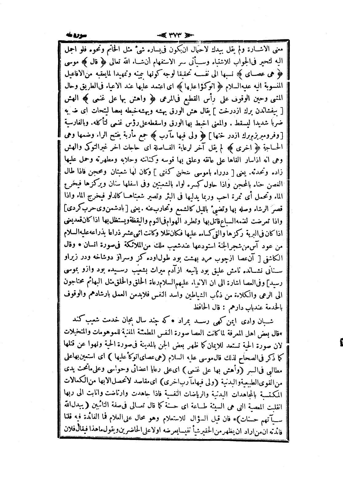 معنى الاشارة ولم يقل بيدك لاحتمال ان يكون فى يساره شىء مثل الخاتم ونحوه فلو أجمل اليه لتحير فى الجواب للاشتباه وسيأتى سر الاستفهام أن شاء الله تعالى قالَ موسى هِيَ عَصايَ نسبها الى نفسه تحقيقا لوجه كونها بيمينه وتمهيدا لما يعقبه من الأفاعيل المنسوبة اليه عليه السلام أَتَوَكَّؤُا عَلَيْها اى اعتمد عليها عند الاعياء فى الطريق وحال المشي وحين الوقوف على رأس القطيع فى المرعى وَأَهُشُّ بِها عَلى غَنَمِي الهش [بيفشاندن برك از درخت] يقال هش الورق يهشه ويهشه خبطه بعصا ليتحات اى ضربه ضربا شديدا ليسقط. والمعنى اخبط بها الورق وأسقطه على رؤس غنمى لتأكله. وبالفارسية [وفرو ميريزم برك از درختها] وَلِيَ فِيها مَآرِبُ جمع مأربة بفتح الراء وضمها وهى الحاجة أُخْرى لم يقل آخر لرعاية الفاصلة اى حاجات اخر غير التوكى والهش وهى انه إذا سار القاها على عاتقه وعلق بها قوسه وكنانته وحلابه ومطهرته وحمل عليها زاده وتحدثه. يعنى [در راه با موسى سخن كفتى] وكان لها شعبتان ومحجن فاذا طال الغصن حناه بالمحجن وإذا حاول كسره لواه بالشعبتين وفى أسفلها سنان ويركزها فيخرج الماء وتحمل أي ثمرة أحب وربما يدليها فى البئر وتصير شعبتاها كالدلو فيخرج الماء وإذا قصر الرشاء وصله بها وتضيئ بالليل كالشمع وتحارب عنه. يعنى [با دشمن وى حرب كردى] وإذا تعرضت لغنمه السباع قاتل بها وتطرد الهوام فى النوم واليقظة ويستظل بها إذا كان قعد يعنى إذا كان فى البرية ركزها والقى كساءه عليها فكان ظلا وكانت اثنى عشر ذراعا بذراعه عليه السلام من عود آس من شجر الجنة استودعها عند شعيب ملك من الملائكة فى صورة انسان وقال الكاشفى [آن عصا از چوب مرد بهشت بود طول او ده كز وسر او دو شاخه ودر زير او سنانى نشانده نامش عليق بود يانيعه از آدم ميراث بشعيب رسيده بود وازو بموسى رسيد] وفى العصا اشارة الى ان الأنبياء عليهم السلام رعاة الخلق والخلق مثل البهائم محتاجون الى الرعي والكلاءة من ذئاب الشياطين واسد النفس فلا بد من العمل بإرشادهم والوقوف بالخدمة عند باب دارهم: قال الحافظ