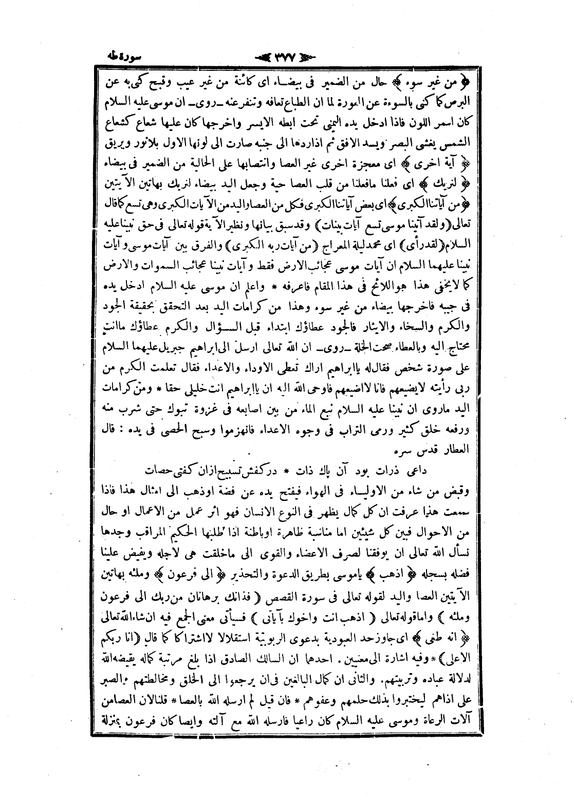 وقبض من شاء من الأولياء فى الهواء فيفتح يده عن فضة او ذهب الى أمثال هذا فاذا سمعت هذا عرفت ان كل كمال يظهر فى النوع الإنسان فهو اثر عمل من الأعمال او حال من الأحوال فبين كل شيئين اما مناسبة ظاهرة او باطنة إذا طلبها الحكيم المراقب وجدها نسأل الله تعالى ان يوفقنا لصرف الأعضاء والقوى الى ما خلقت هى لاجله ويفيض علينا فضله بسجله اذْهَبْ يا موسى بطريق الدعوة والتحذير إِلى فِرْعَوْنَ وملئه بهاتين الآيتين العصا واليد لقوله تعالى فى سورة القصص فَذانِكَ بُرْهانانِ مِنْ رَبِّكَ إِلى فِرْعَوْنَ وَمَلَائِهِ واما قوله تعالى اذْهَبْ أَنْتَ وَأَخُوكَ بِآياتِي فسيأتى معنى الجمع فيه ان شاء الله تعالى إِنَّهُ طَغى اى جاوز حد العبودية بدعوى الربوبية استقلالا لا اشتراكا كما قال أَنَا رَبُّكُمُ الْأَعْلى وفيه اشارة الى معيين. أحدهما ان السالك الصادق إذا بلغ مرتبة كماله يقيضه الله لدلالة عباده وتربيتهم. والثاني ان كمال البالغين فى ان يرجعوا الى الخلق ومخالطتهم والصبر على اذاهم ليختبروا بذلك حلمهم وعفوهم فان قيل لم أرسله الله بالعصا قلنا لان العصا من آلات الرعاة وموسى عليه السلام كان راعيا فارسله الله مع آلته وابصا كان فرعون بمنزلة