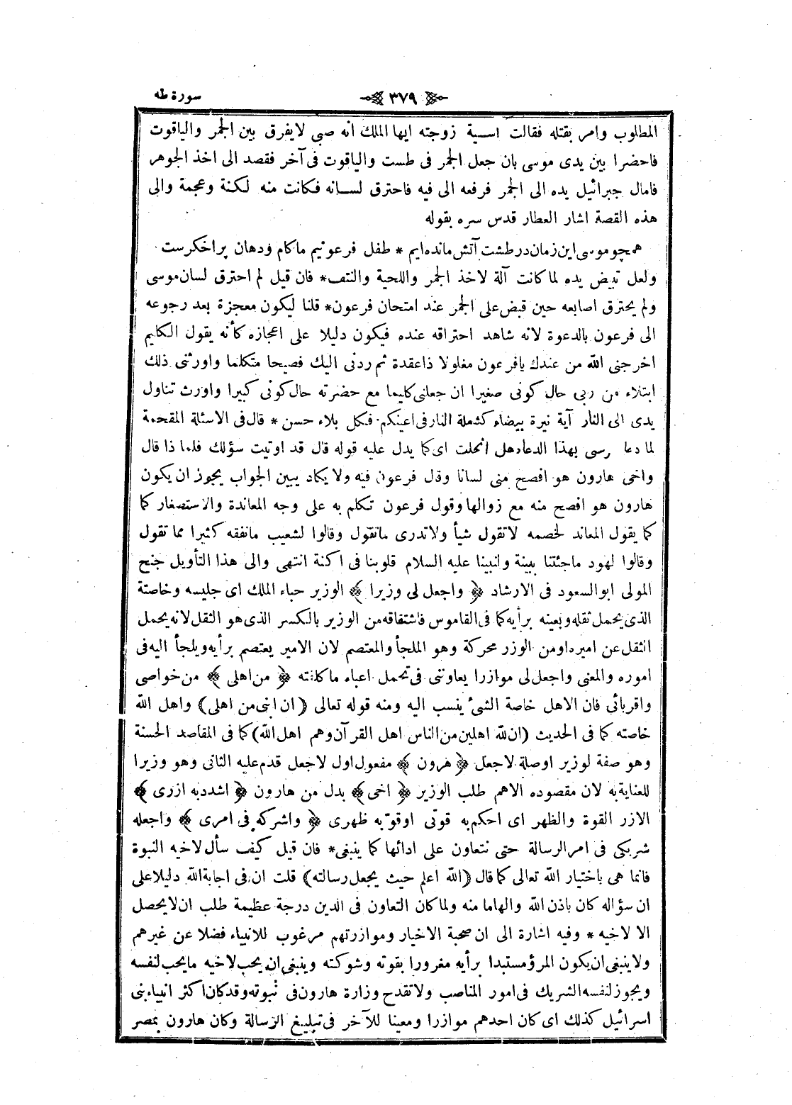 ولعل تبيض يده لما كانت آلة لاخذ الجمر واللحية والنتف فان قيل لم احترق لسان موسى ولم يحترق أصابعه حين قبض على الجمر عند امتحان فرعون قلنا ليكون معجزة بعد رجوعه الى فرعون بالدعوة لانه شاهد احتراقه عنده فيكون دليلا على اعجازه كأنه يقول الكليم أخرجني الله من عندك يا فرعون مغلولا ذا عقدة ثم ردنى إليك فصيحا متكلما وأورثني ذلك ابتلاء من ربى حال كونى صغيرا ان جعلنى كليما مع حضرته حال كونى كبيرا وأورث تناول يدى الى النار آية نيرة بيضاء كشعلة النار فى أعينكم فكل بلاء حسن قال فى الاسئلة المقحمة لما دعا رسى بهذا الدعاء هل انحلت اى كما يدل عليه قوله قال قد أوتيت سؤلك فلماذا قال وأخي هارون هو افصح منى لسانا وقال فرعون فيه ولا يكاد يبين الجواب يجوز ان يكون هارون هو افصح منه مع زوالها وقول فرعون تكلم به على وجه المعاندة والاستصغار كما كما يقول المعاند لخصمه لا تقول شيأ ولا تدرى ما تقول وقالوا لشعيب ما نفقه كثيرا مما تقول وقالوا لهود ما جئتنا ببينة ولنبينا عليه السلام قلوبنا فى اكنة انتهى والى هذا التأويل جنح المولى ابو السعود فى الإرشاد وَاجْعَلْ لِي وَزِيراً الوزير حباء الملك اى جليسه وخاصتة الذي يحمل ثقله وبعينه برأيه كما فى القاموس فاشتقاقه من الوزير بالكسر الذي هو الثقل لانه يحمل الثقل عن أميره او من الوزر محركة وهو الملجأ والمعتصم لان الأمير يعتصم برأيه ويلجأ اليه فى أموره والمعنى واجعل لى موازرا يعاوننى فى تحمل أعباء ما كلفته مِنْ أَهْلِي من خواصى واقربائى فان الأهل خاصة الشيء ينسب اليه ومنه قوله تعالى إِنَّ ابْنِي مِنْ أَهْلِي واهل الله خاصته كما فى الحديث (ان لله أهلين من الناس اهل القرآن وهم اهل الله) كما فى المقاصد الحسنة وهو صفة لوزير او صلة لا جعل هارُونَ مفعول أول لا جعل قدم عليه الثاني وهو وزيرا للعناية به لان مقصوده الأهم طلب الوزير أَخِي بدل من هارون اشْدُدْ بِهِ أَزْرِي الأزر القوة والظهر اى احكم به قوتى او قوّ به ظهرى وَأَشْرِكْهُ فِي أَمْرِي واجعله شريكى فى امر الرسالة حتى نتعاون على أدائها كما ينبغى فان قيل كيف سأل لاخيه النبوة فانما هى باختيار الله تعالى كما قال (الله اعلم حيث يجعل رسالته) قلت ان فى اجابة الله دليلا على ان سؤاله كان بإذن الله وإلهاما منه ولما كان التعاون فى الدين درجة عظيمة طلب ان لا يحصل الا لاخيه وفيها اشارة الى ان صحبة الأخيار وموازرتهم مرغوب للانبياء فضلا عن غيرهم ولا ينبغى ان يكون المرء مستبدا برأيه مغرورا بقوته وشوكته وينبغى ان يحب لاخيه ما يحب لنفسه ويجوز لنفسه الشريك فى امور المناصب ولا تقدح وزارة هارون فى نبوته وقد كان اكثر أنبياء بنى إسرائيل كذلك اى كان أحدهم موازرا ومعينا للآخر فى تبليغ الرسالة وكان هارون بمصر