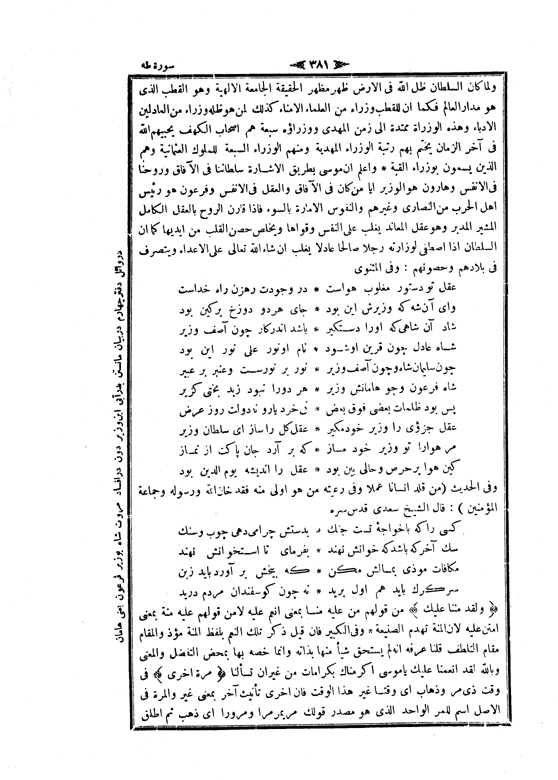 ولما كان السلطان ظل الله فى الأرض ظهر مظهر الحقيقة الجامعة الالهية وهو القطب الذي هو مدار العالم فكما ان للقطب وزراء من العلماء الأمناء كذلك لمن هو ظله وزراء من العادلين الأدباء وهذه الوزارة ممتدة الى زمن المهدى ووزراؤه سبعة هم اصحاب الكهف يحبيهم الله فى آخر الزمان يختم بهم رتبة الوزراء المهدية ومنهم الوزراء السبعة للملوك العثمانية وهم الذين يسمعون بوزراء القبلة واعلم ان موسى بطريق الاشارة سلطاننا فى الآفاق وروحنا فى الأنفس وهارون هو الوزير أيا من كان فى الآفاق والعقل فى الأنفس وفرعون هو رئيس اهل الحرب من النصارى وغيرهم والنفوس الامارة بالسوء فاذا قارن الروح بالعقل الكامل المشير المدبر وهو عقل المعاند يغلب على النفس وقواها ويخلص حصن القلب من أيديها كما ان السلطان إذا اصطفى لوزارته رجلا صالحا عادلا يغلب ان شاء الله تعالى على الأعداء ويتصرف فى بلادهم وحصونهم: وفى المثنوى