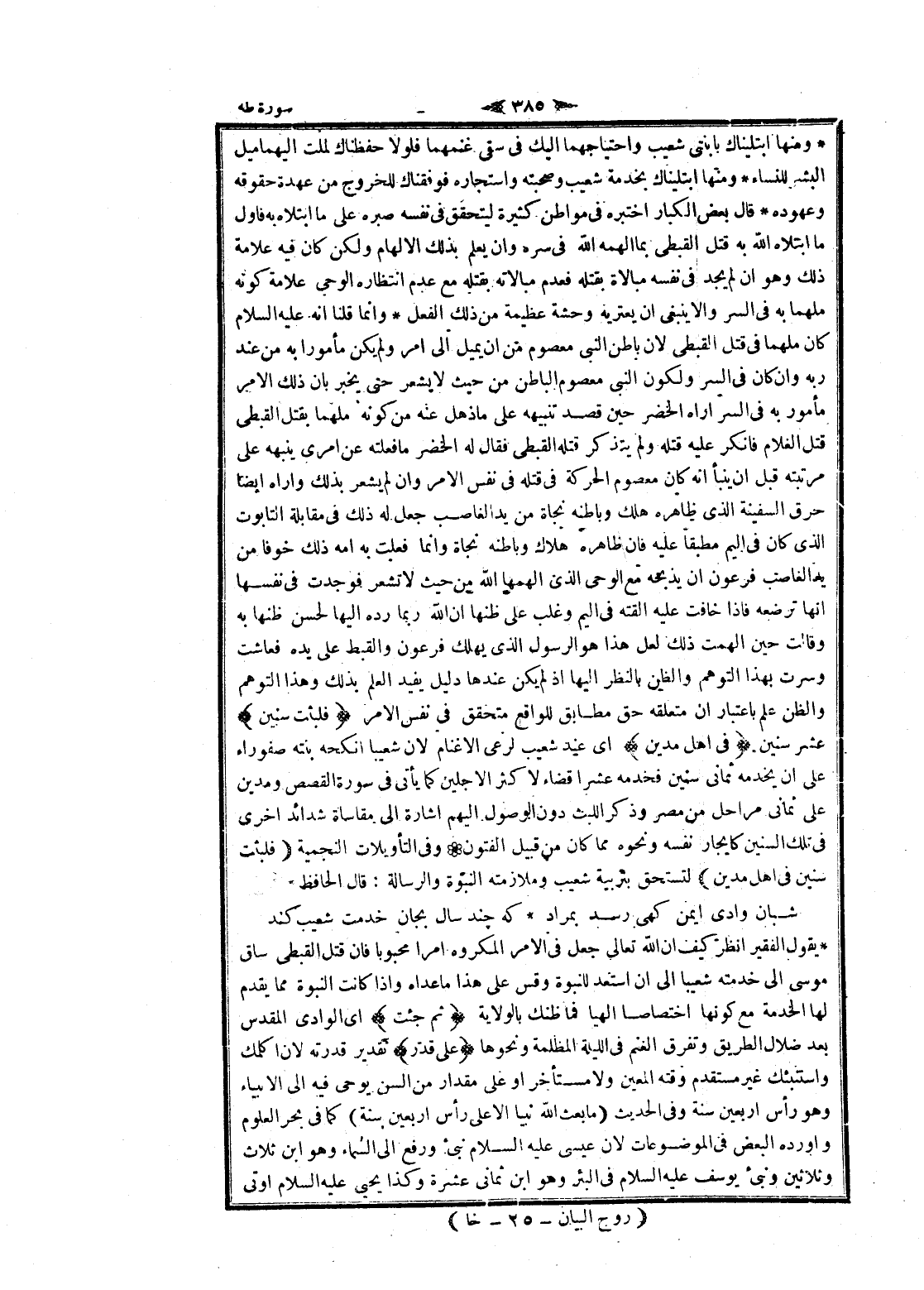 ومنها ابتليناك بابنتي شعيب واحتياجهما إليك فى سقى غنمهما فلولا حفظناك لملت إليهما ميل البشر للنساء ومنها ابتليناك بخدمة شعيب وصحبته واستجاره فوفقناك للخروج من عهدة حقوقه وعهوده قال بعض الكبار اختبره فى مواطن كثيرة ليتحقق فى نفسه صبره على ما ابتلاه به فاول ما ابتلاه الله به قتل القبطي بما ألهمه الله فى سره وان يعلم بذلك الإلهام ولكن كان فيه علامة ذلك وهو ان لم يجد فى نفسه مبالاة بقتله فعدم مبالاته بقتله مع عدم انتظاره الوحى علامة كونه ملهما به فى السر والا ينبغى ان يعتريه وحشة عظيمة من ذلك الفعل وانما قلنا انه عليه السلام كان ملهما فى قتل القبطي لان باطن النبي معصوم من ان يميل الى امر ولم يكن مأمورا به من عند ربه وان كان فى السر ولكون النبي معصوم الباطن من حيث لا يشعر حتى يخبر بان ذلك الأمر مأمور به فى السر أراه الخضر حين قصد تنبيهه على ما ذهل عنه من كونه ملهما بقتل القبطي قتل الغلام فانكر عليه قتله ولم يتذكر قتله القبطي فقال له الخضر ما فعلته عن امرى ينبهه على مرتبته قبل ان ينبأ انه كان معصوم الحركة فى قتله فى نفس الأمر وان لم يشعر بذلك وأراه ايضا حرق السفينة الذي ظاهره هلك وباطنه نجاة من يد الغاصب جعل له ذلك فى مقابلة التابوت الذي كان فى اليم مطبقا عليه فان ظاهره هلاك وباطنه نجاة وانما فعلت به امه ذلك خوفا من يد الغاصب فرعون ان يذبحه مع الوحى الذي ألهمها الله من حيث لا تشعر فوجدت فى نفسها انها ترضعه فاذا خافت عليه ألقته فى اليم وغلب على ظنها ان الله ربما رده إليها لحسن ظنها به وقالت حين ألهمت ذلك لعل هذا هو الرسول الذي يهلك فرعون والقبط على يده فعاشت وسرت بهذا التوهم والظن بالنظر إليها إذ