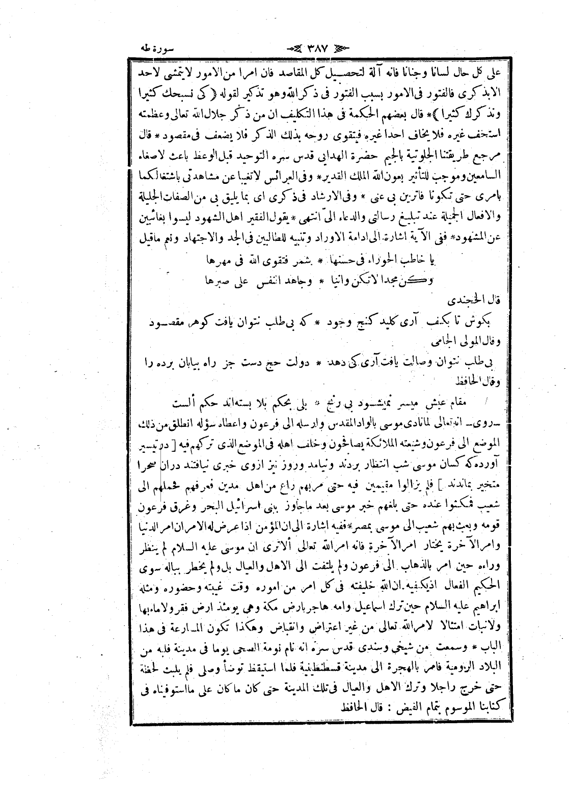 - روى- انه تعالى لما نادى موسى بالواد المقدس وأرسله الى فرعون وأعطاه سؤله انطلق من ذلك الموضع الى فرعون وشيعته الملائكة يصافحون وخلف اهله فى الموضع الذي تركهم فيه [در تيسير آورده كه كسان موسى شب انتظار بردند ونيامد وروز نيز از وى خبرى نيافتند در ان صحرا متحير بماندند] فلم يزالوا مقيمين فيه حتى مربهم راع من اهل مدين فعرفهم فحملهم الى شعيب فمكثوا عنده حتى بلغهم خبر موسى بعد ما جاوز ببني إسرائيل البحر وغرق فرعون قومه وبعث بهم شعيب الى موسى بمصر ففيه اشارة الى ان المؤمن إذا عرض له الأمر ان امر الدنيا وامر الآخرة يختار امر الآخرة فانه امر الله تعالى ألا ترى ان موسى عليه السلام لم ينظر وراءه حين امر بالذهاب الى فرعون ولم يلتفت الى الأهل والعيال بل ولم يخطر بباله سوى الحكيم الفعال إذ يكفيه ان الله خليفته فى كل امر من أموره وقت غيبته وحضوره ومثله ابراهيم عليه السلام حين ترك إسماعيل وامه هاجر بأرض مكة وهى يومئذ ارض فقر ولا ماء بها ولا نبات امتثالا لامر الله تعالى من غير اعتراض وانقباض وهكذا تكون المسارعة فى هذا الباب وسمعت من شيخى وسندى قدس سره انه نام نومة الضحى يوما فى مدينة فلبه من البلاد الرومية فامر بالهجرة الى مدينة قسطنطينية فلما استيقظ توضأ وصلى فلم يلبث لحظة حتى خرج راجلا وترك الأهل والعيال فى تلك المدينة حتى كان ما كان على ما استوفيناه فى كتابنا الموسوم بتمام الفيض: قال الحافظ