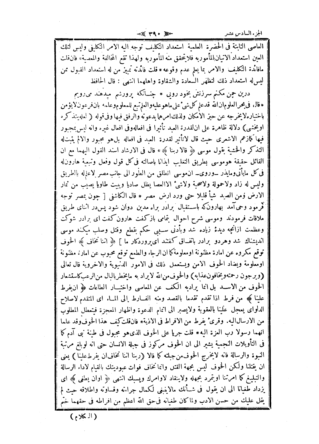 قال فى بحر العلوم ان الله قد علم كل شىء على ما هو عليه والعلم تبع للمعلوم وعلمه بان فرعون لا يؤمن باختياره لا يخرجه عن حيز الا مكان ولذلك أمرهما بدعوته والرفق فيها وفى قوله لَعَلَّهُ يَتَذَكَّرُ أَوْ يَخْشى دلالة ظاهرة على ان لقدرة العبد تأثيرا فى أفعاله وفى افعال غيره وانه ليس بمجبور فيها كما زعم الأشعري حيث قال لا تأثير لقدرة العبد فى أفعاله بل هو مجبور والا لم يثبت له التذكر والخشية بقول موسى قالا رَبَّنا قال فى الإرشاد أسند القول إليهما مع ان القائل حقيقة هو موسى بطريق التغليب إيذانا باصالته فى كل قول وفعل وتبعية هارون له فى كل ما يأتى وما يذر- وروى- ان موسى انطلق من الطور الى جانب مصر لا علم له بالطريق وليس له زاد ولا حمولة ولا صحبة ولا شىء الا العصا يظل صاديا ويبيت طاويا يصيب من ثمار الأرض ومن الصيد شيأ قليلا حتى ورد ارض مصر قال الكاشفى [چون بمصر توجه فرمود وحي آمد بهارون كه باستقبال برادر براه مدين دوان شود پس در اثناى طريق ملاقات فرمودند وموسى شرح احوال بتمامى باز كفت هارون كفت اى برادر شوكت وعظمت از آنچهـ ديده زياده شد وبأدنى سببى حكم بقطع وقتل وصلب ميكند موسى انديشناك شد وهر دو برادر باتفاق كفتند اى پروردگار ما] إِنَّنا نَخافُ الخوف توقع مكروه عن امارة مظنونة او معلومة كما ان الرجاء والطمع توقع محبوب عن امارة مظنونة او معلومة ويضاد الخوف الامن ويستعمل ذلك فى الأمور الدنيوية والاخروية قال تعالى وَيَرْجُونَ رَحْمَتَهُ وَيَخافُونَ عَذابَهُ والخوف من الله لا يراد به ما يخطر بالبال من الرعب كاستشعار الخوف من الأسد بل انما يراد به الكف عن المعاصي واختيار الطاعات أَنْ يَفْرُطَ عَلَيْنا من فرط إذا تقدم تقدما بالقصد ومنه الفارط الى الماء اى المتقدم لا صلاح الدلو اى يعجل علينا بالعقوبة ولا يصبر الى إتمام الدعوة واظهار المعجزة فيتعطل المطلوب من الإرسال اليه. وقرئ يفرط من الافراط فى الاذية فان قلت كيف هذا الخوف وقد علما انهما رسولا رب العزة اليه قلت جريا على الخوف الذي هو مجبول فى طينة بنى آدم كما فى التأويلات النجمية يشير الى ان الخوف مركوز فى جبلة الإنسان حتى انه لو بلغ مرتبة النبوة والرسالة فانه لا يخرج الخوف من جبلته كما قالا رَبَّنا إِنَّنا نَخافُ أَنْ يَفْرُطَ عَلَيْنا يعنى ان يقتلنا ولكن الخوف ليس بجهة القتل وانما نخاف فوات عبوديتك بالقيام لاداء الرسالة والتبليغ كما امرتنا او يتمرد بجهله ولا ينقاد لاوامرك ويسبك انتهى أَوْ أَنْ يَطْغى اى يزداد طغيانا الى ان يقول فى شأنك مالا ينبغى لكمال جراءته وقساوته وإطلاقه حيث لم يقل عليك من حسن الأدب ولما كان طغيانه فى حق الله أعظم من افراطه فى حقهما ختم