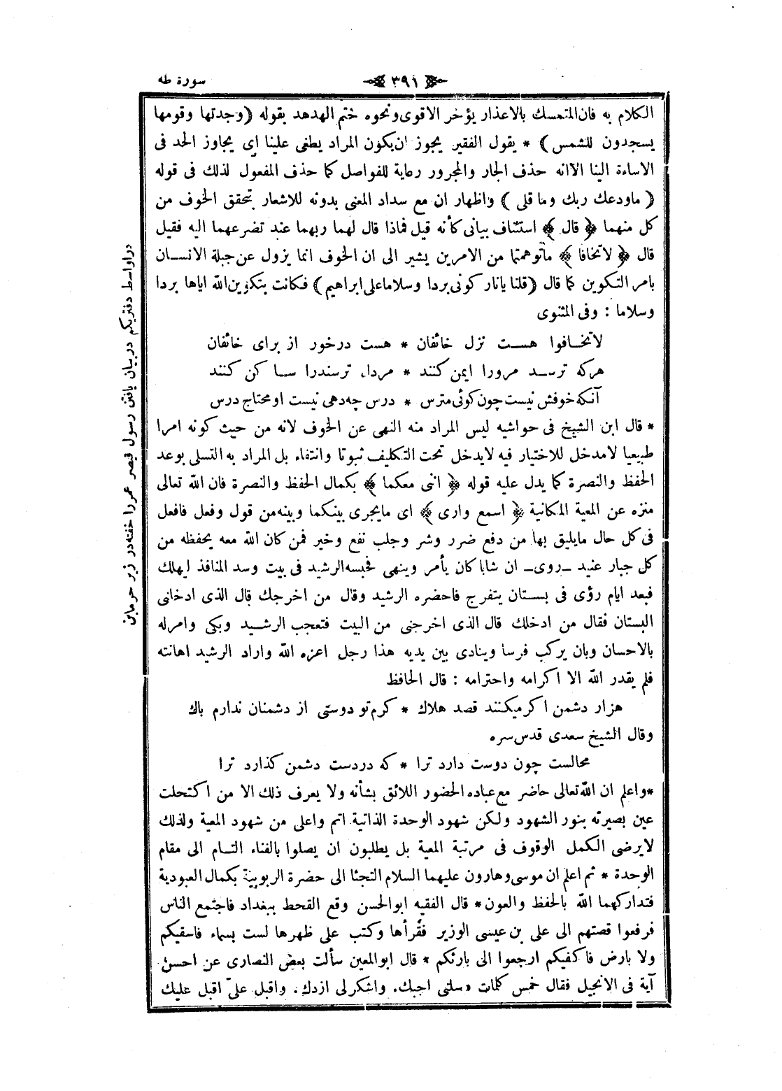 واعلم ان الله تعالى حاضر مع عباده الحضور اللائق بشأنه ولا يعرف ذلك الا من اكتحلت عين بصيرته بنور الشهود ولكن شهود الوحدة الذاتية أتم وأعلى من شهود المعية ولذلك لا يرضى الكمل الوقوف فى مرتبة المعية بل يطلبون ان يصلوا بالفناء التام الى مقام الوحدة ثم اعلم ان موسى وهارون عليهما السلام التجئا الى حضرة الربوبية بكمال العبودية فتداركهما الله بالحفظ والعون قال الفقيه ابو الحسن وقع القحط ببغداد فاجتمع الناس فرفعوا قصتهم الى على بن عيسى الوزير فقرأها وكتب على ظهرها لست بسماء فاسقيكم ولا بأرض فاكفيكم ارجعوا الى بارئكم قال ابو المعين سألت بعض النصارى عن احسن آية فى الإنجيل فقال خمس كلمات «سلنى أجبك. واشكر لى ازدك. واقبل علىّ اقبل عليك