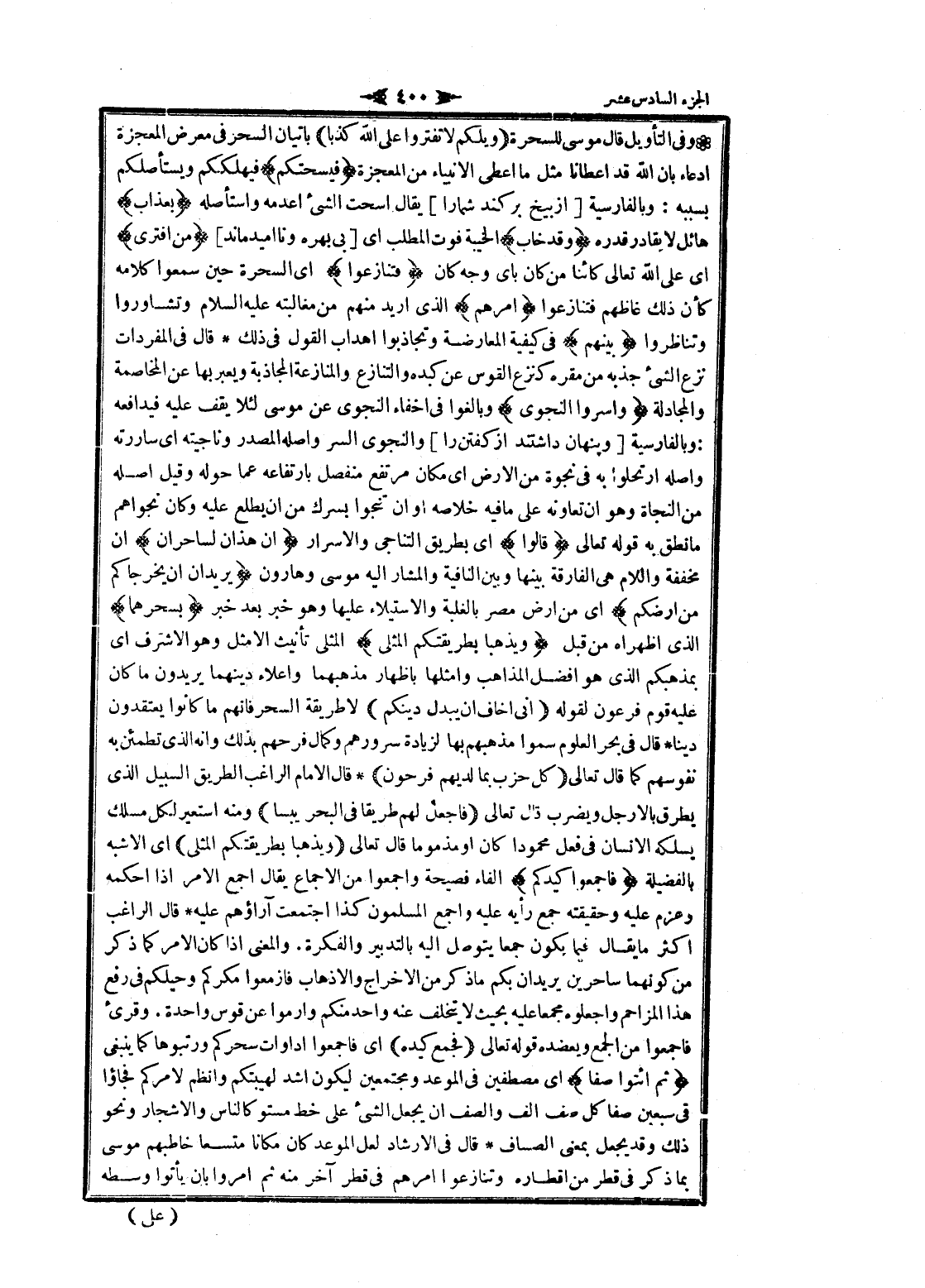 وفى التأويل قال موسى للسحرة (ويلكم لا تفتروا على الله كذبا) بإتيان السحر فى معرض المعجزة ادعاء بان الله قد أعطانا مثل ما اعطى الأنبياء من المعجزة فَيُسْحِتَكُمْ فيهلككم ويستأصلكم بسببه: وبالفارسية [از بيخ بركند شما را] يقال اسحت الشيء أعدمه واستأصله بِعَذابٍ هائل لا يقادر قدره وَقَدْ خابَ الخيبة فوت المطلب اى [بي بهره ونااميد ماند] مَنِ افْتَرى اى على الله تعالى كائنا من كان باى وجه كان فَتَنازَعُوا اى السحرة حين سمعوا كلامه كأن ذلك غاظهم فتنازعوا أَمْرَهُمْ الذي أريد منهم من مغالبته عليه السلام وتشاوروا وتناظروا بَيْنَهُمْ فى كيفية المعارضة وتجاذبوا اهداب القول فى ذلك قال فى المفردات نزع الشيء جذبه من مقره كنزع القوس عن كبده والتنازع والمنازعة المجاذبة ويعبربها عن المخاصمة والمجادلة وَأَسَرُّوا النَّجْوى وبالغوا فى إخفاء النجوى عن موسى لئلا يقف عليه فيدافعه: وبالفارسية [و پنهان داشتند از كفتن را] والنجوى السر وأصله المصدر وناجيته اى ساررته وأصله ارتحلوا به فى نجوة من الأرض اى مكان مرتفع منفصل بارتفاعه عما حوله وقيل أصله من النجاة وهو ان تعاونه على ما فيه خلاصه او ان تنجوا بسرك من ان يطلع عليه وكان نجواهم ما نطق به قوله تعالى قالُوا اى بطريق التناجي والاسرار إِنْ هذانِ لَساحِرانِ ان مخففة واللام هى الفارقة بينها وبين النافية والمشار اليه موسى وهارون يُرِيدانِ أَنْ يُخْرِجاكُمْ مِنْ أَرْضِكُمْ اى من ارض مصر بالغلبة والاستيلاء عليها وهو خبر بعد خبر بِسِحْرِهِما الذي اظهراه من قبل وَيَذْهَبا بِطَرِيقَتِكُمُ الْمُثْلى المثلى تأنيث الأمثل وهو الأشرف اى بمذهبكم الذي هو أفضل المذاهب وامثلها بإظهار مذهبهما وإعلاء دينهما يريدون ما كان عليه قوم فرعون لقوله إِنِّي أَخافُ أَنْ يُبَدِّلَ دِينَكُمْ لا طريقة السحر فانهم ما كانوا يعتقدون دينا قال فى بحر العلوم سموا مذهبهم بها لزيادة سرورهم وكمال فرحهم بذلك وانه الذي تطمئن به نفوسهم كما قال تعالى كُلُّ حِزْبٍ بِما لَدَيْهِمْ فَرِحُونَ قال الامام الراغب الطريق السبيل الذي يطرق بالأرجل ويضرب قال تعالى فَاضْرِبْ لَهُمْ طَرِيقاً فِي الْبَحْرِ يَبَساً ومنه استعير لكل مسلك يسلكه الإنسان فى فعل محمودا كان او مذموما قال تعالى وَيَذْهَبا بِطَرِيقَتِكُمُ الْمُثْلى اى الأشبه بالفضيلة فَأَجْمِعُوا كَيْدَكُمْ الفاء فصيحة واجمعوا من الإجماع يقال اجمع الأمر إذا أحكمه وعزم عليه وحقيقته جمع رأيه عليه واجمع المسلمون كذا اجتمعت آراؤهم عليه قال الراغب اكثر ما يقال فيما يكون جمعا يتوصل اليه بالتدبير والفكرة. والمعنى إذا كان الأمر كما ذكر من كونهما ساحرين يريدان بكم ما ذكر من الإخراج والاذهاب فازمعوا مكركم وحيلكم فى رفع هذا المزاحم واجعلوه مجمعا عليه بحيث لا يتخلف عنه واحد منكم وارموا عن قوس واحدة. وقرئ فاجمعوا من الجمع ويعضده قوله تعالى فَجَمَعَ كَيْدَهُ اى فاجمعوا اداوات سحركم ورتبوها كما ينبغى ثُمَّ ائْتُوا صَفًّا اى مصطفين فى الموعد ومجتمعين ليكون أشد لهيبتكم وانظم لامركم فجاؤا فى سبعين صفا كل صف الف والصف ان يجعل الشيء على خط مستو كالناس والأشجار ونحو ذلك وقد يجعل بمعنى الصاف قال فى الإرشاد لعل الموعد كان مكانا متسعا خاطبهم موسى بما ذكر فى قطر من اقطاره وتنازعوا أمرهم فى قطر آخر منه ثم أمروا بان يأتوا وسطه