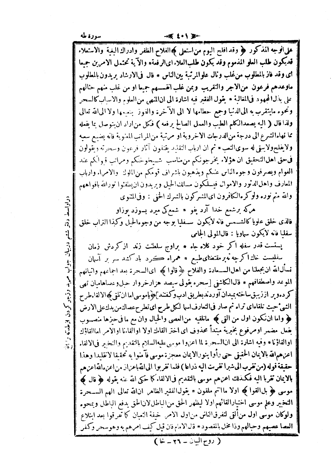 على الوجه المذكور وَقَدْ أَفْلَحَ الْيَوْمَ مَنِ اسْتَعْلى الفلاح الظفر وادراك البغية والاستعلاء قد يكون طلب العلو المذموم وقد يكون طلب العلاء اى الرفعة والآية تحتمل الامرين جميعا اى وقد فاز بالمطلوب من غلب ونال علو المرتبة بين الناس قال فى الإرشاد يريدون بالمطلوب ما وعدهم فرعون من الاجر والتقريب وبمن غلب أنفسهم جميعا او من غلب منهم حثالهم على بذل المجهود فى المغالبة يقول الفقير فيه اشارة الى ان المنهي من العلوم والأسباب كالسحر ونحوه ما يتقرب به الى الدنيا وجمع حطامها لا الى الآخرة والفوز بنعيمها ولا الى الله تعالى ولذا قال إِلَيْهِ يَصْعَدُ الْكَلِمُ الطَّيِّبُ وَالْعَمَلُ الصَّالِحُ يَرْفَعُهُ فكل من أراد ان يتوصل بما يفعله مما نهاه الشرع الى درجة من الدرجات الاخروية او مرتبة من المراتب المعنوية فانه يضيع سعيه ولا يفلح ولا يبقى له سوى التعب ثم ان ارباب التقليد يقتفون آثار فرعون وسحرته ويقولون فى حق اهل التحقيق ان هؤلاء يخرجونكم من مناصب شيخوختكم ومراتب قبولكم عند العوام ويصرفون وجوه الناس عنكم ويذهبون باشراف قومكم من الملوك والأمراء وارباب المعارف واهل الدثور والأموال فيسلكون مسالك الحيل ويريدون ان يطفئوا نور الله بأفواههم والله متم نوره ولو كره الكافرون اى المشركون بالشرك الخفي: وفى المثنوى