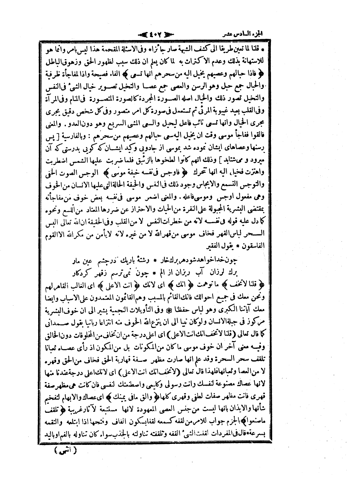 قلنا لما تعين طريقا الى كشف الشبهة صار جائزا وفى الاسئلة المقحمة هذا ليس بامر وانما هو للاستهانة بذلك وعدم الاكتراث به لما كان يعلم ان ذلك سبب لظهور الحق وزهوق الباطل فَإِذا حِبالُهُمْ وَعِصِيُّهُمْ يُخَيَّلُ إِلَيْهِ مِنْ سِحْرِهِمْ أَنَّها تَسْعى الفاء فصيحة وإذا لمفاجأة ظرفية والحبال جمع حبل وهو الرسن والعصى جمع عصا والتخيل تصوير خيال الشيء فى النفس والتخيل تصور ذلك والخيال أصله الصورة المجردة كالصورة المتصورة فى المنام وفى المرآة وفى القلب بعيد غيبوبة المرئي ثم تستعمل فى صورة كل امر متصور وفى كل شخص دقيق يجرى مجرى الخيال وانها تسعى نائب فاعل ليحيل والسعى المشي السريع وهو دون العدو. والمعنى فالقوا ففاجأ موسى وقت ان يخيل اليه سعى حبالهم وعصيهم من سحرهم: وبالفارسية [پس رسنها وعصاهاى ايشان نموده شد بموسى از جادويى وكيد ايشان كه كويى بدرستى كه آن ميرود ومى شتابد] وذلك انهم كانوا لطخوها بالزنبق فلما ضربت عليها الشمس اضطربت واهتزت فخيل اليه انها تتحرك فَأَوْجَسَ فِي نَفْسِهِ خِيفَةً مُوسى الوجس الصوت الخفي والتوجس التسمع والإيجاس وجود ذلك فى النفس والخيفة الحالة التي عليها الإنسان من الخوف وهى مفعول أوجس وموسى فاعله. والمعنى أضمر موسى فى نفسه بعض خوف من مفاجأته بمقتضى البشرية المجبولة على النفرة من الحيات والاحتراز عن ضررها المعتاد من اللسع ونحوه كما دل عليه قوله فى نفسه لانه من خطرات النفس لا من القلب وفى الحقيقة ان الله تعالى البس السحر لباس القهر فخاف موسى من قهر الله لا من غيره لانه لا يأمن من مكر الله الا القوم الفاسقون يقول الفقير