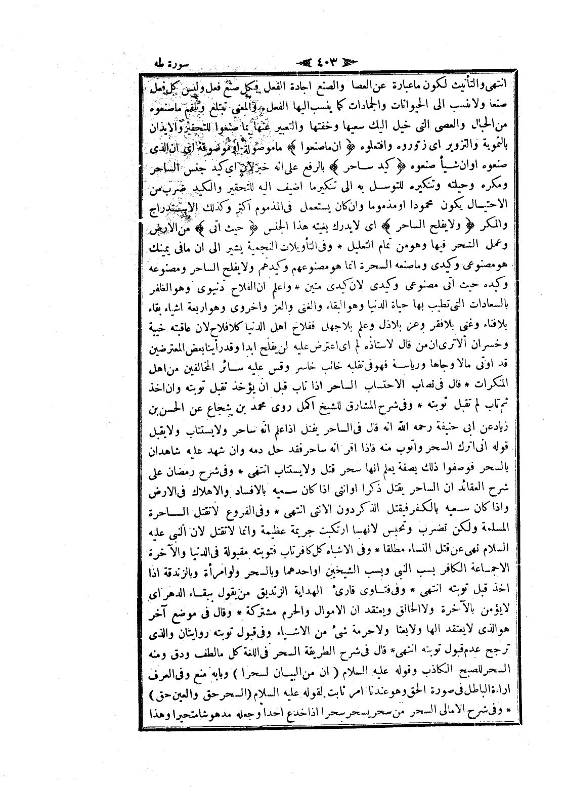 ولا الخالق ويعتقد ان الأموال والحرم مشتركة وقال فى موضع آخر هو الذي لا يعتقد الها ولا بعثا ولا حرمة شىء من الأشياء وفى قبول توبته روايتان والذي ترجح عدم قبول توبته انتهى قال فى شرح الطريقة السحر فى اللغة كل ما لطف ودق ومنه السحر للصبح الكاذب وقوله عليه السلام (ان من البيان لسحرا) وبابه منع وفى العرف اراءة الباطل فى صورة الحق وهو عندنا امر ثابت لقوله عليه السلام (السحر حق والعين حق) وفى شرح الأمالي السحر من سحر يسحر سحرا إذا خدع أحدا وجعله مدهوشا متحيرا وهذا