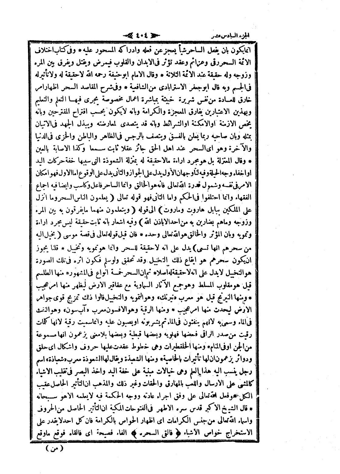 انما يكون بان يفعل الساحر شيأ يعجز عن فعله وإدراكه المسحور عليه وفى كتاب اختلاف الائمة السحر رقى وعزائم وعقد تؤثر فى الأبدان والقلوب فيمرض ويقتل ويفرق بين المرء وزوجه وله حقيقة عند الائمة الثلاثة وقال الامام ابو حنيفة رحمه الله لا حقيقة له ولا تأثير له فى الجسم وبه قال ابو جعفر الاسترابادى من الشافعية وفى شرح المقاصد السحر اظهار امر خارق للعادة من نفس شريرة خبيثة بمباشرة اعمال مخصوصة يجرى فيها التعلم والتعليم وبهذين الاعتبارين يفارق المعجزة والكرامة وبانه لا يكون بحسب اقتراح المقترحين وبانه يخص الازمنة او الامكنة او الشرائط وبانه قد يتصدى المعارضة ويبذل الجهد فى الإتيان بمثله وبان صاحبه ربما يعلن بالفسق ويتصف بالرجس فى الظاهر والباطن والخزي فى الدنيا والآخرة وهو اى السحر عند اهل الحق جائز عقلا ثابت سمعا وكذا الاصابة بالعين وقال المعتزلة بل هو مجرد اراءة مالا حقيقة له بمنزلة الشعوذة التي سببها خفة حركات اليد او إخفاء وجه الحيلة وفيه لنا وجهان الاول يدل على الجواز والثاني يدل على الوقوع اما الاول فهو إمكان الأمر فى نفسه وشمول قدرة الله تعالى فانه هو الخالق وانما الساحر فاعل وكاسب وايضا فيه اجماع الفقهاء وانما احتلفوا فى الحكم واما الثاني فهو قوله تعالى يُعَلِّمُونَ النَّاسَ السِّحْرَ وَما أُنْزِلَ عَلَى الْمَلَكَيْنِ بِبابِلَ هارُوتَ وَمارُوتَ الى قوله فَيَتَعَلَّمُونَ مِنْهُما ما يُفَرِّقُونَ بِهِ بَيْنَ الْمَرْءِ وَزَوْجِهِ وَما هُمْ بِضارِّينَ بِهِ مِنْ أَحَدٍ إِلَّا بِإِذْنِ اللَّهِ وفيه اشعار بانه ثابت حقيقة ليس مجرد اراءة وتمويه وبان المؤثر والخالق هو الله تعالى وحده فان قيل قوله تعالى فى قصة موسى يُخَيَّلُ إِلَيْهِ مِنْ سِحْرِهِمْ أَنَّها تَسْعى يدل على انه لا حقيقة للسحر وانما هو تمويه وتخييل قلنا يجوز ان يكون سحرهم هو إيقاع ذلك التخييل وقد تحقق ولو سلم فكون اثره فى تلك الصورة هو التخييل لا يدل على انه لا حقيقة له أصلا ثم ان السحر خمسة انواع فى المشهور منها الطلسم قيل هو مقلوب المسلط وهو جمع الآثار السماوية مع عقاقير الأرض ليظهر منها امر عجيب ومنها النيرنج قيل هو معرب «نيرنك» وهو التمويه والتخييل قالوا ذلك تمزيج قوى جواهر الأرض ليحدث منها امر عجيب ومنها الرقية وهو الافسون معرب «آب سون» وهو النفث فى الماء وسمى به لانهم ينفثون فى الماء ثم يشربونه او يصبون عليه وانما سميت رقية لانها كلمات رقيت من صدر الراقي فبعضها فهويه وبعضها قبطية وبعضها بلا معنى يزعمون انها مسموعة من الجن او فى المنام ومنها الخلقطيرات وهى خطوط عقدت عليها حروف وإشكال اى حلق ودوائر يزعمون ان لها تأثيرات بالخاصية ومنها الشعبذة ويقال لها الشعوذة معرب «شعباذة» اسم رجل ينسب اليه هذا العلم وهى خيالات مبنية على خفة اليد وأخذ البصر فى تقليب الأشياء كالمشى على الإرسال واللعب بالمهارق والحقات وغير ذلك والمذهب ان التأثير الحاصل عقيب الكل هو فعل الله تعالى على وفق اجراء عادته ووجه الحكمة فيه لا يعلمه الا هو سبحانه قال الشيخ الأكبر قدس سره الأطهر فى الفتوحات المكية ان التأثير الحاصل من الحروف واسماء الله تعالى من جنس الكرامات اى اظهار الخواص بالكرامة فان كل أحد لا يقدر على الاستخراج خواص الأشياء فَأُلْقِيَ السَّحَرَةُ الفاء فصيحة اى فالقاه فوقع ما وقع